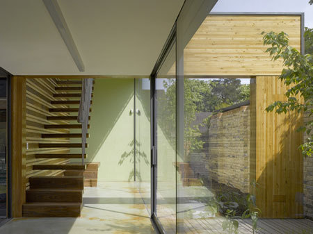 Running the full length of the street elevation at ground floor is a vertical slatted chestnut screen, which allows fleeting broken news from within the house and courtyard to the street.