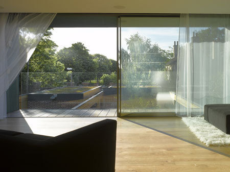 The second block over the main entrance area is conceived as a ‘hide’ which faces west looking out over Richmond park, containing the main living room, which connects to the kitchen on the ground floor by a staircase running down to the basement utility room and wine cellar.