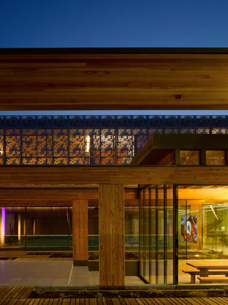 부지는 큰 노출된 나무 빔으로 동서로 나뉘어 있습니다. 이러한 빔은 내부와 외부 공간 내에서 물리적 및 시각적 구분을 형성합니다.