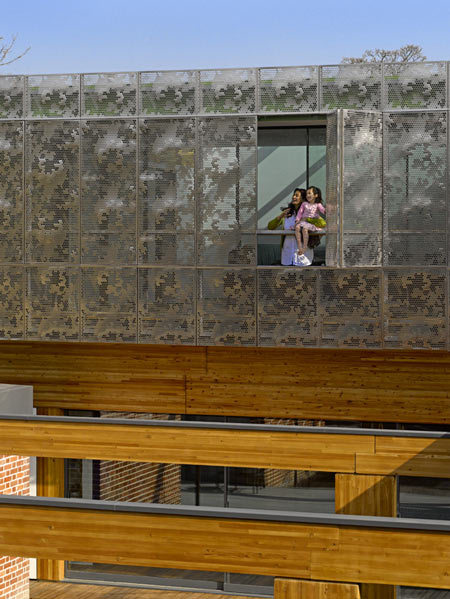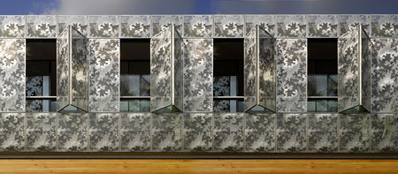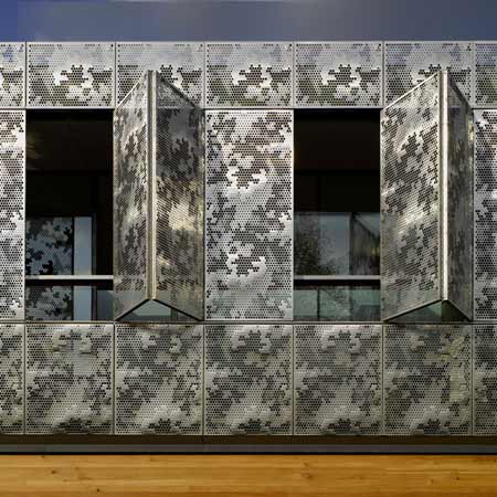 It is conceived as a single volume sitting on the beams clad entirely with a veil of stainless steel panels perforated with an abstracted foliage design.