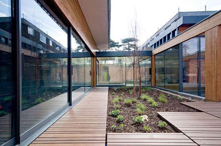 The internal spaces are solid on their eastern elevation clad in brick matching the original building on the site, and glazed on the north and south where they project under the beams.