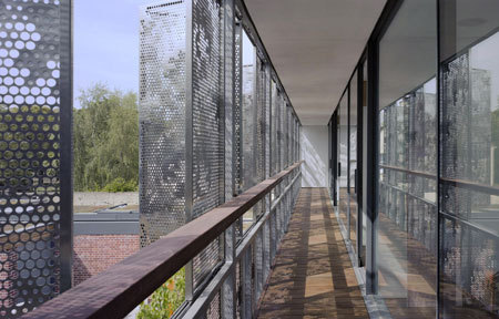 구조 빔에 의해 지지되어 중정에서의 프라이버시와 포용성을 제공합니다. 수영장 위의 메인 블록에는 두 개의 침실 스위트가 있으며, 천공된 스테인리스 스틸 패널 디자인을 가지고 있습니다.