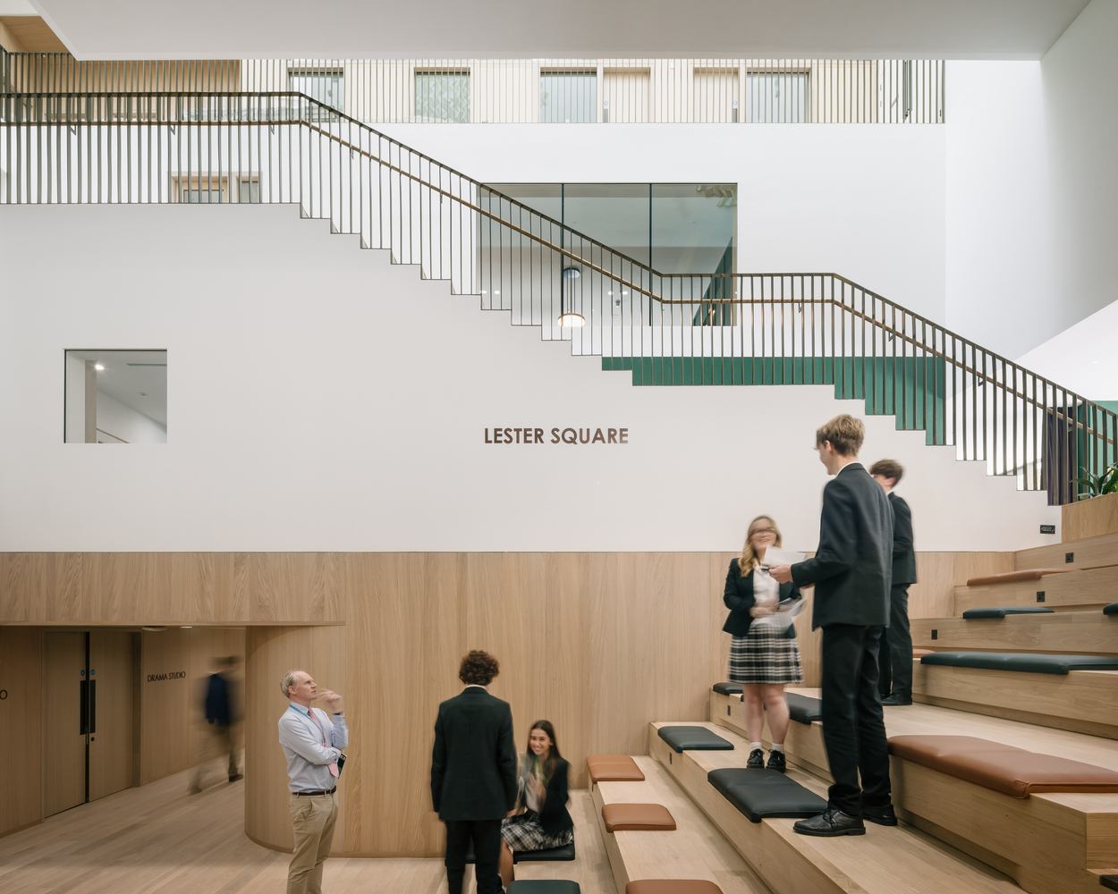 The underground studios, the raised theatre hall, and social spaces on the ground floor are all connected with a 3 dimensional public interior, with wide staircases going up and down, bathing in daylight. The theatre hall itself is a compact, smart, detailed, wooden playbox with a daylight oculus, making it useful as a daily practice space as well.
