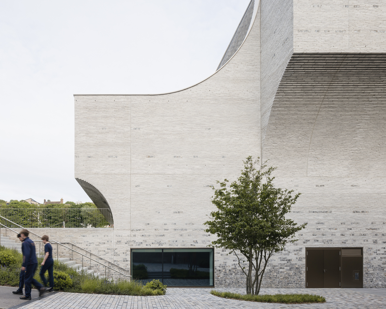 This puzzle required some of the rooms to step out of the site footprint. Therefore, the theatre hall is raised to open up the ground floor for social spaces. This resulted in a dynamic, sculptural shape - almost like a ballerina that is clad with the same material on all facades and roofs. The curved brick and flint facade design mediate between the monumental and the contemporary in a dynamic play of local and historical materials.