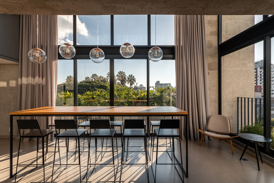 O pédireito duplo do salão de festas permite a conexão visual entre as áreas externas, conferindo protagonismo a esse ambiente.