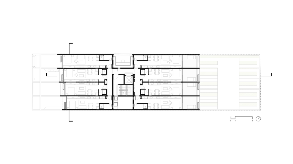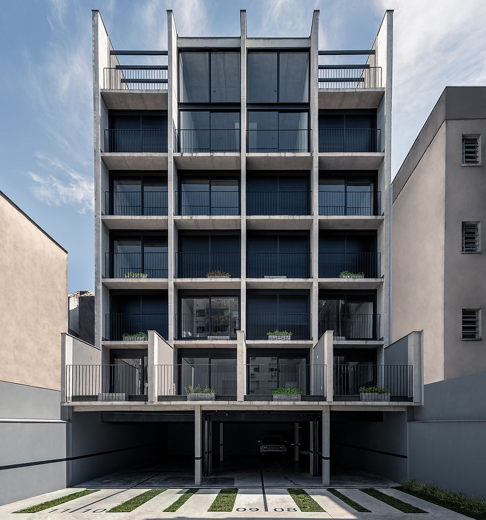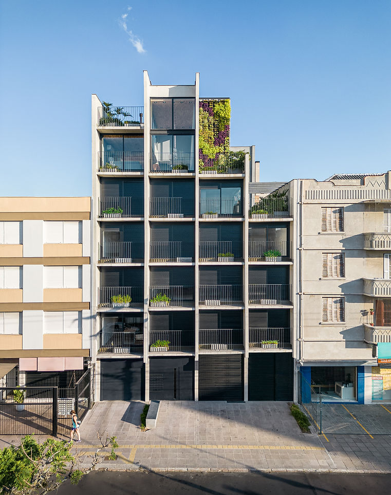 Composta de apartamentos do tipo estúdio e com a premissa da relação direta com as construções vizinhas, uma grelha com planos verticais primários e horizontais secundários é disposta na fachada, criando a regra que orienta o escalonamento lateral.