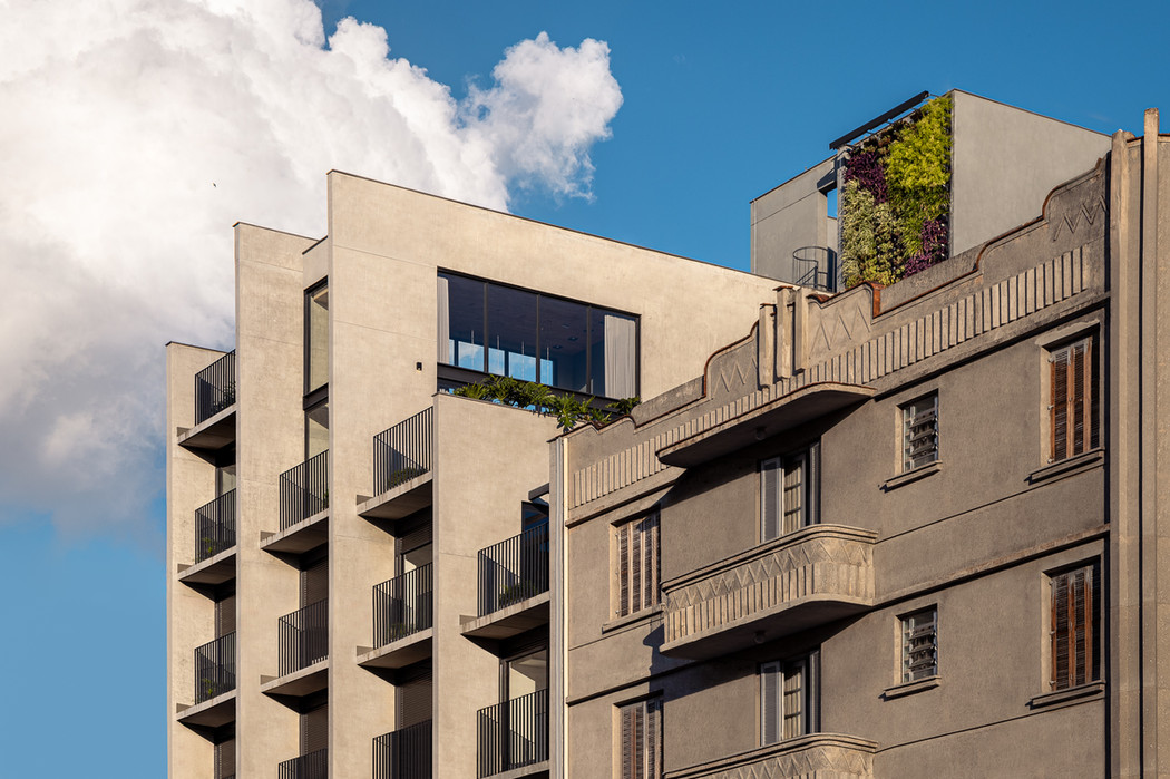 Com o objetivo de estabelecer uma relação de respeito sem abdicar da contemporaneidade, a volumetria criada é alinhada com as fachadas das pré-existências e o topo do projeto é escalonado lateralmente, operações estas que costuram a nova construção no contexto.