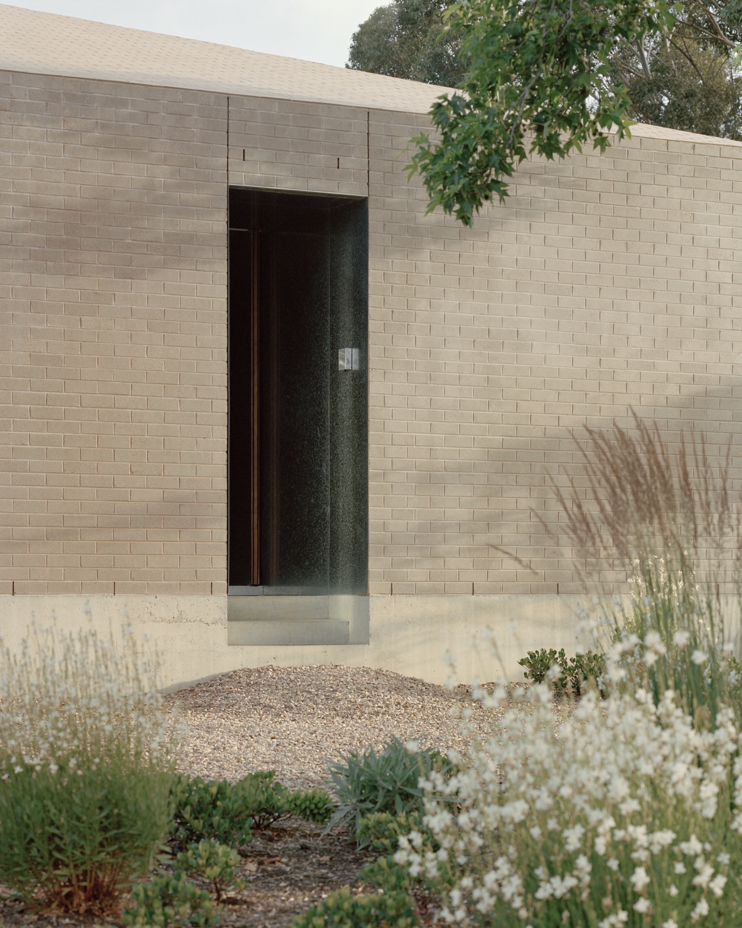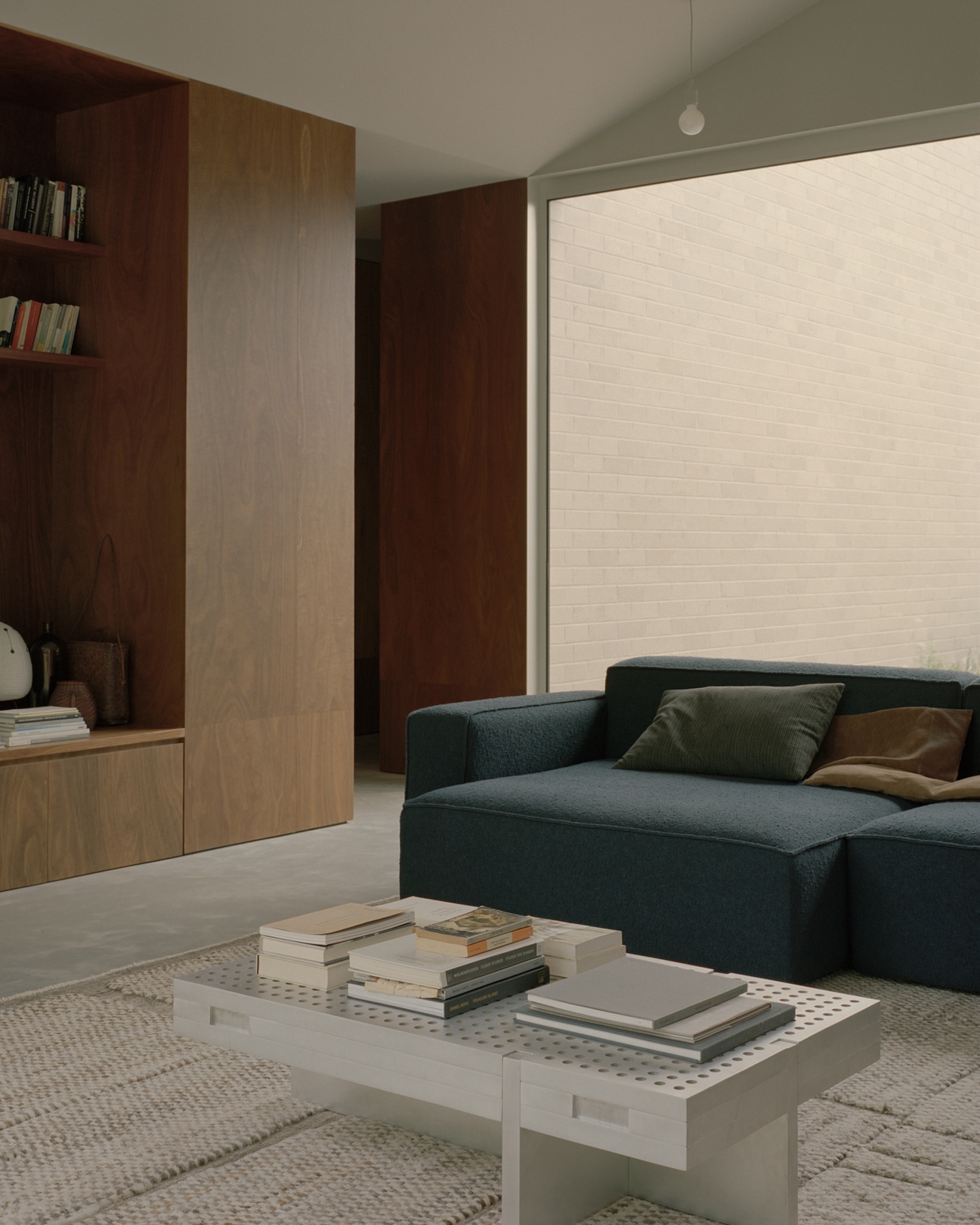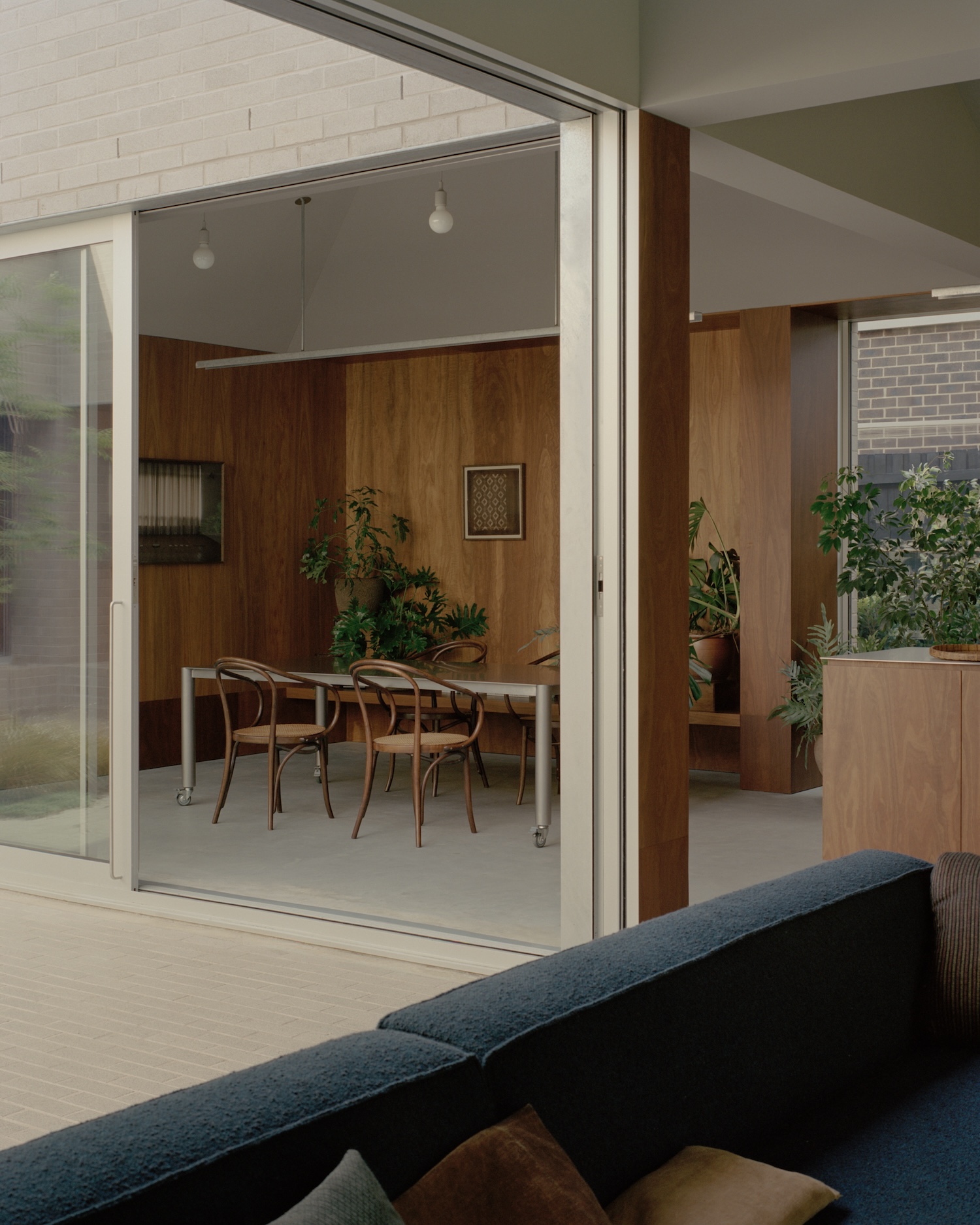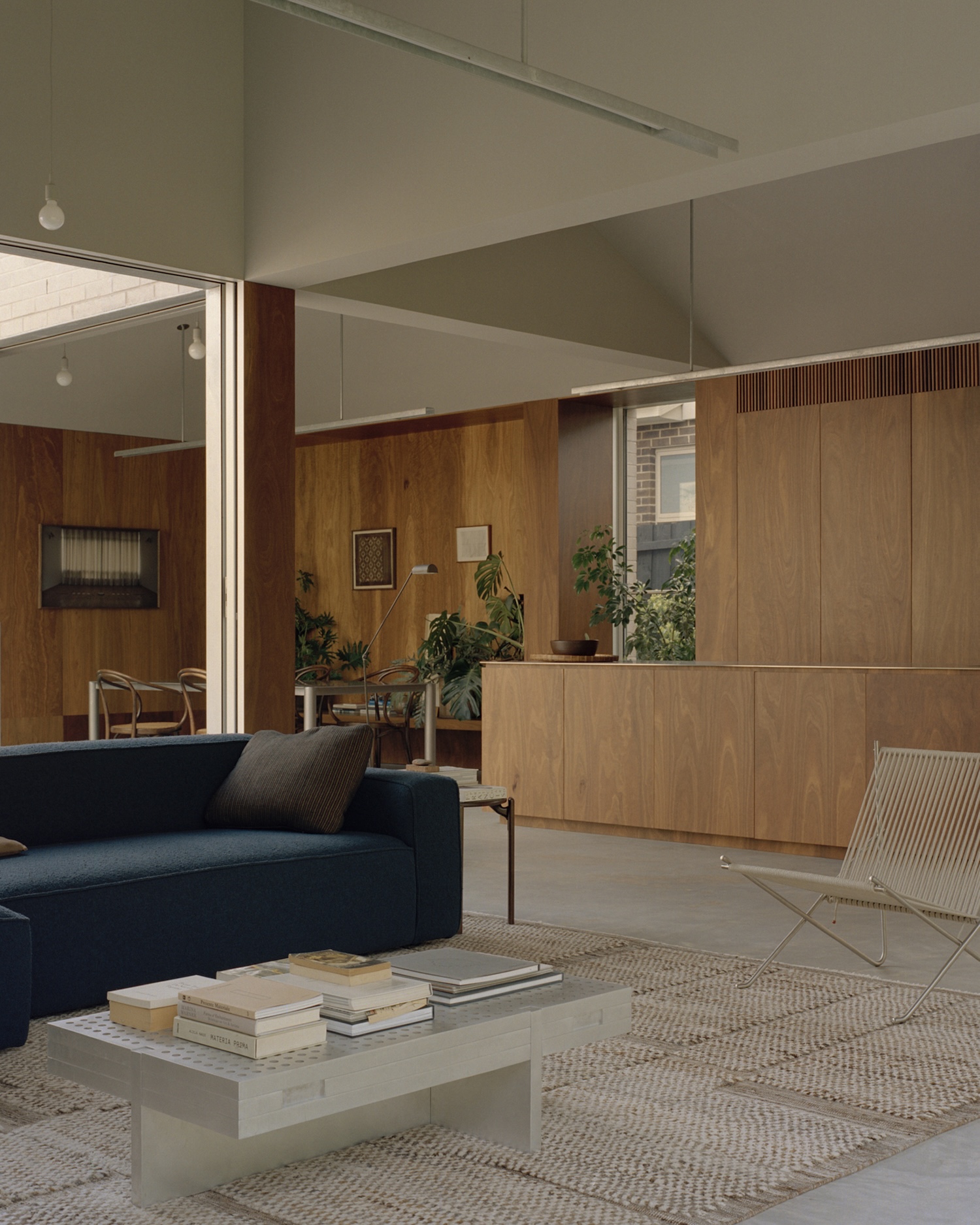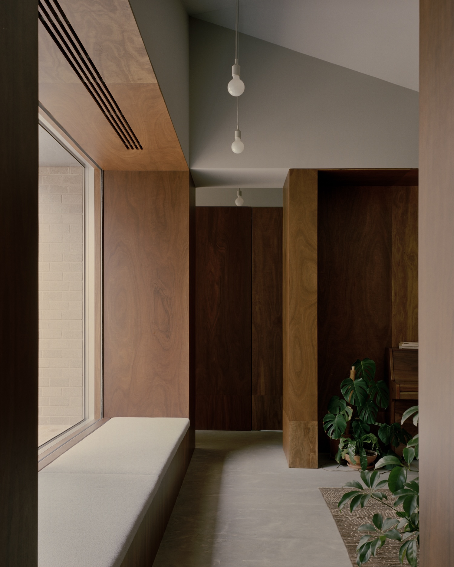 Inside, the floors are polished concrete, while the walls and joinery in the social areas are clad in durable spotted gum plywood. The ceiling planes, painted soft grey, highlight the interplay of light and shadow. Bedrooms share this grey palette, allowing gentle shadows from the garden to dance across their surfaces. The interiors contrast the sharp exterior with textural richness. Walls are lined with wax finished spotted gum, and ceilings vault to the heights defined by the pitched roof, creating generous, surprising spaces in the shared living areas. The bricks used are Carbon Neutral and promise longevity, ensuring a small carbon footprint. The hardwood plywood lining the walls is sustainably sourced from Australia.