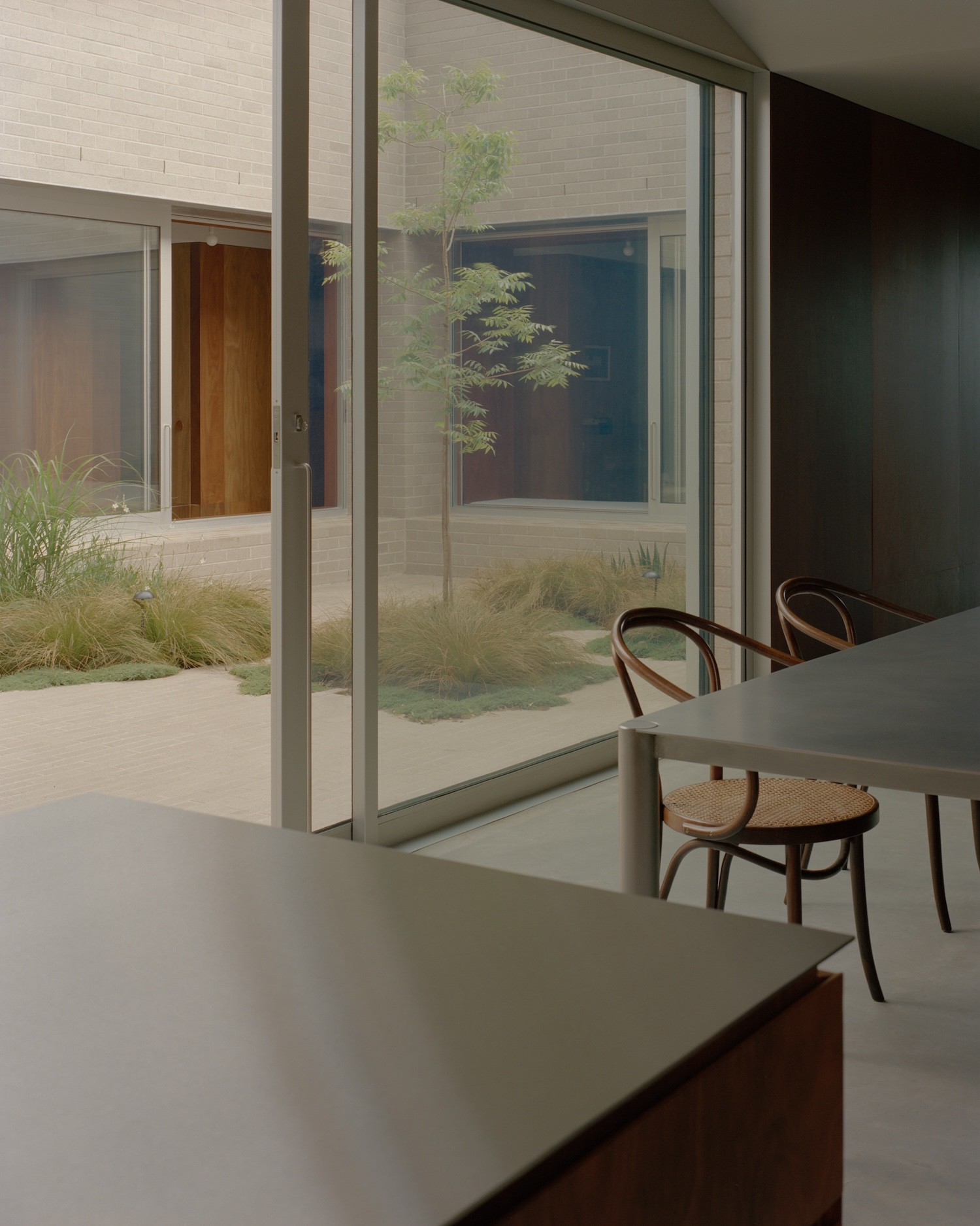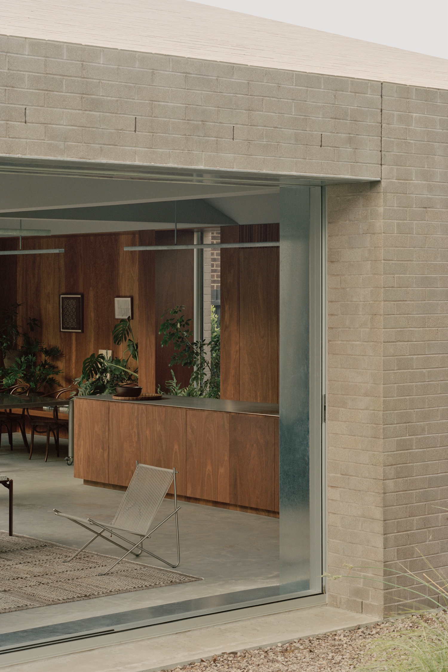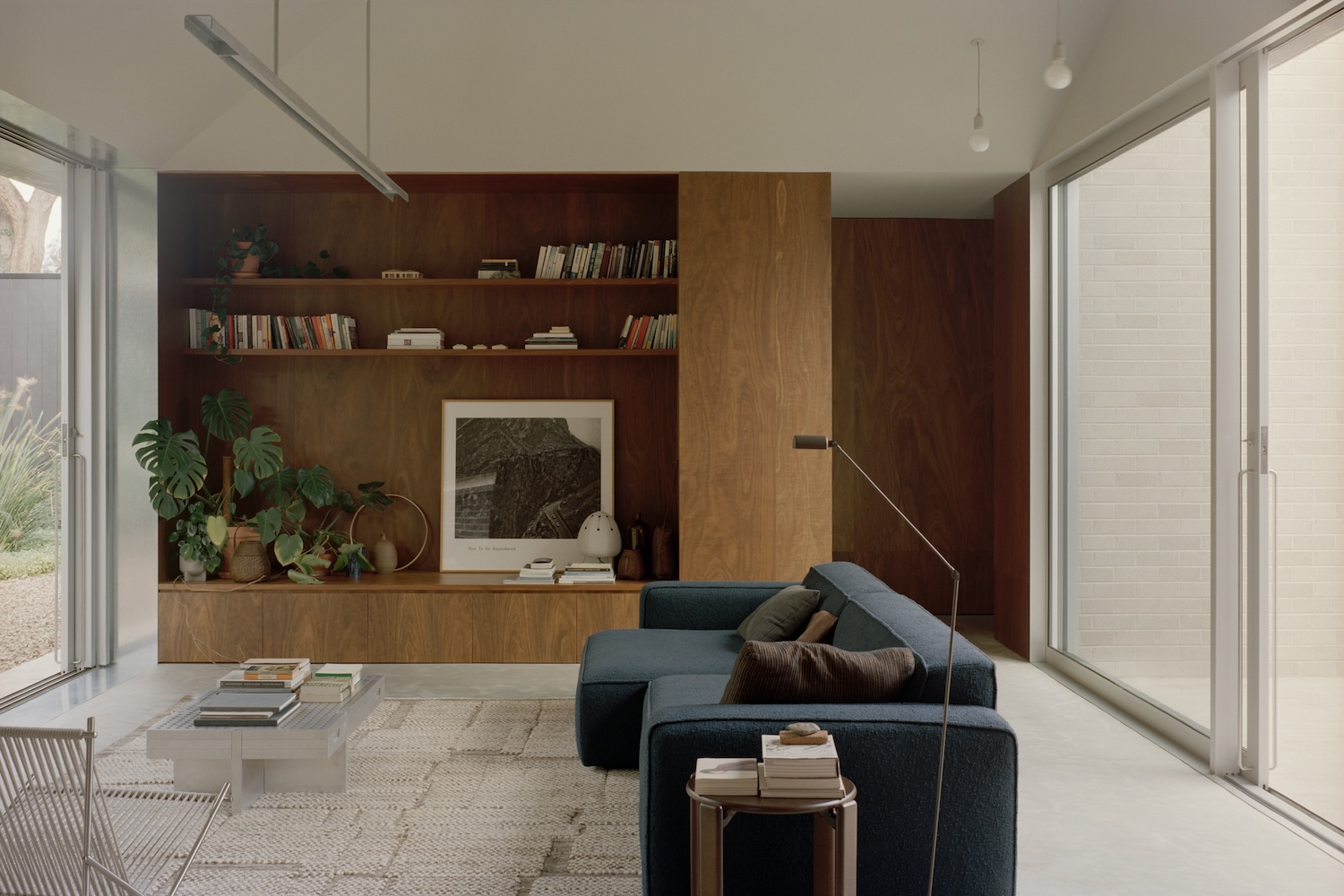 The structural floor slab was burnished to reduce costs and material use, serving as the finished floor surface. The central garden room admits northern sunlight into the living spaces during winter, passively warming the concrete floors. In summer, it remains shaded and cool. The house is naturally ventilated with many windows and doors, allowing cross-flow ventilation through the central courtyard. Bedrooms and bathrooms for the clients and their children form an eastern wing, separated from the social spaces by an entry hallway that connects the front and rear gardens. This hallway flows into the north facing living, kitchen, and dining areas, continuing around the central garden room to a secluded lounge that opens again to the northern sun.