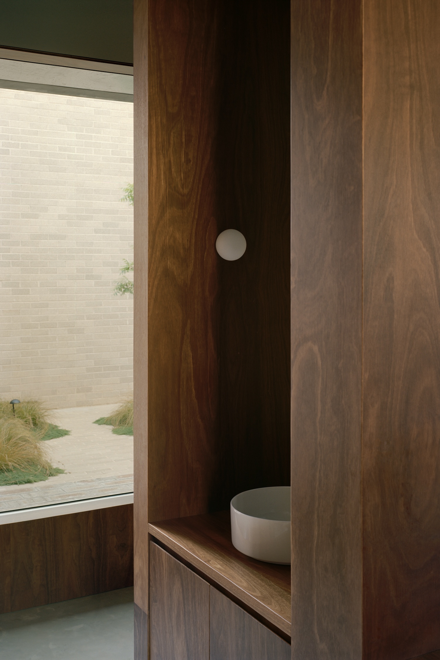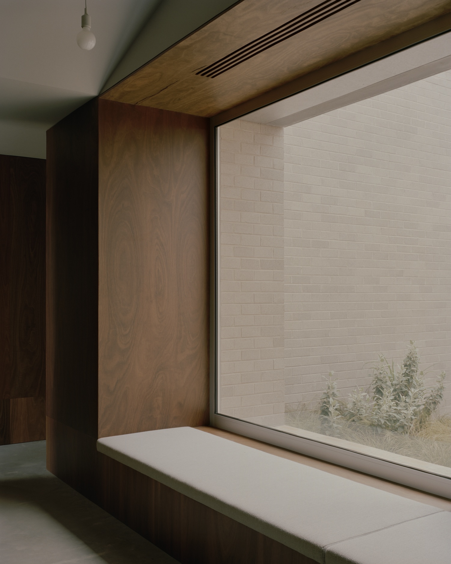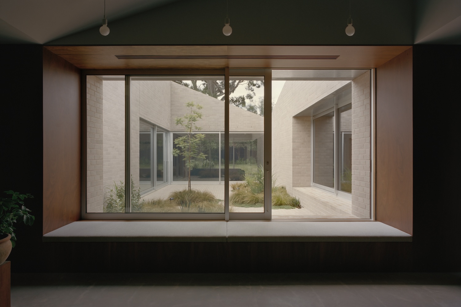 The structural floor slab was burnished to reduce costs and material use, serving as the finished floor surface. The central garden room admits northern sunlight into the living spaces during winter, passively warming the concrete floors. In summer, it remains shaded and cool. The house is naturally ventilated with many windows and doors, allowing cross-flow ventilation through the central courtyard. Bedrooms and bathrooms for the clients and their children form an eastern wing, separated from the social spaces by an entry hallway that connects the front and rear gardens. This hallway flows into the north facing living, kitchen, and dining areas, continuing around the central garden room to a secluded lounge that opens again to the northern sun.