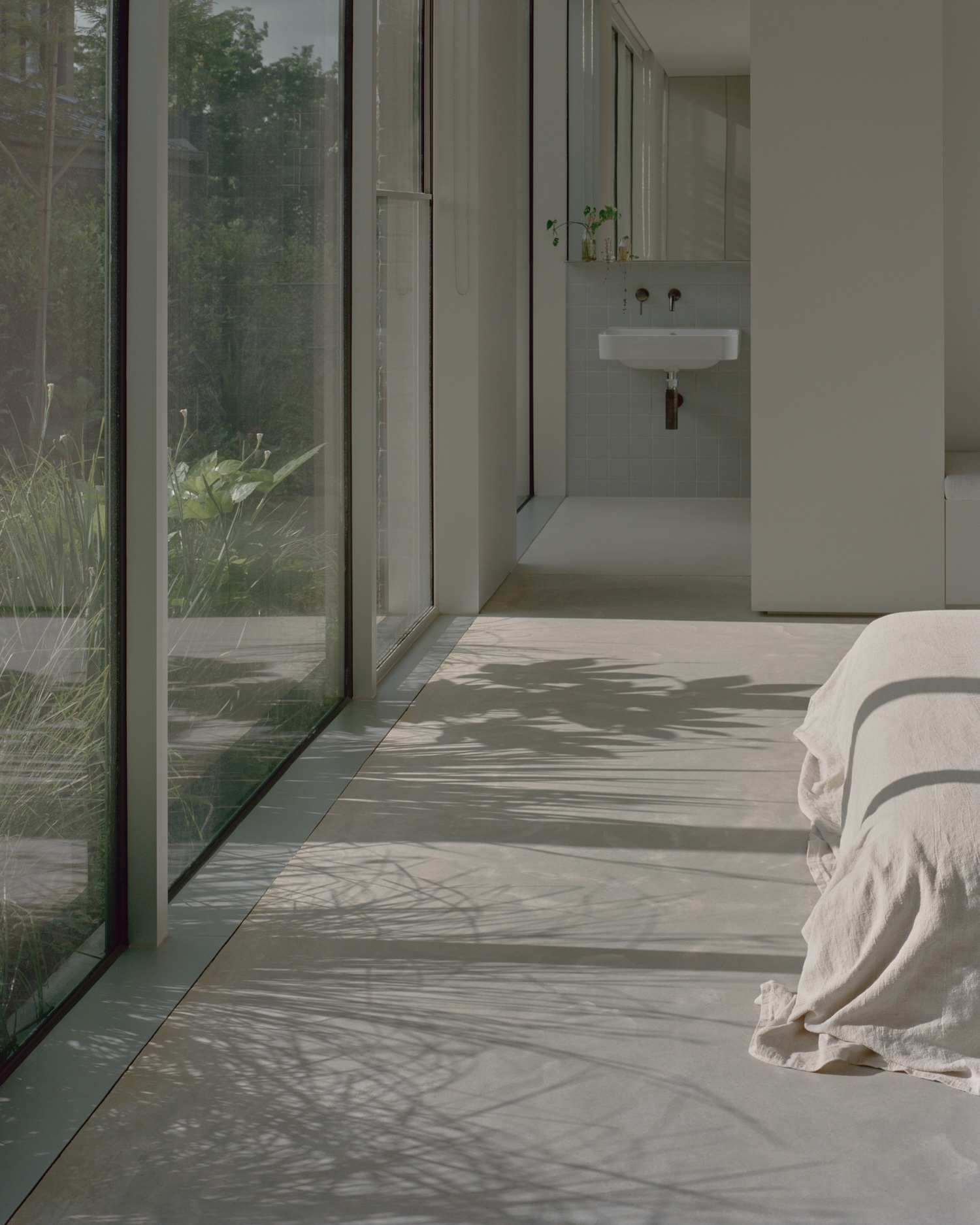 천장은 부드러운 회색으로 칠해져 빛과 그림자의 상호작용을 강조합니다. 침실 역시 이 회색 팔레트를 공유하여 정원에서 들어오는 부드러운 그림자가 표면을 장식합니다. 볼트 천장은 공용 공간에 넓고 놀라운 공간감을 제공합니다. 이러한 디자인은 공간을 더욱 풍부하고 생동감 있게 만듭니다.