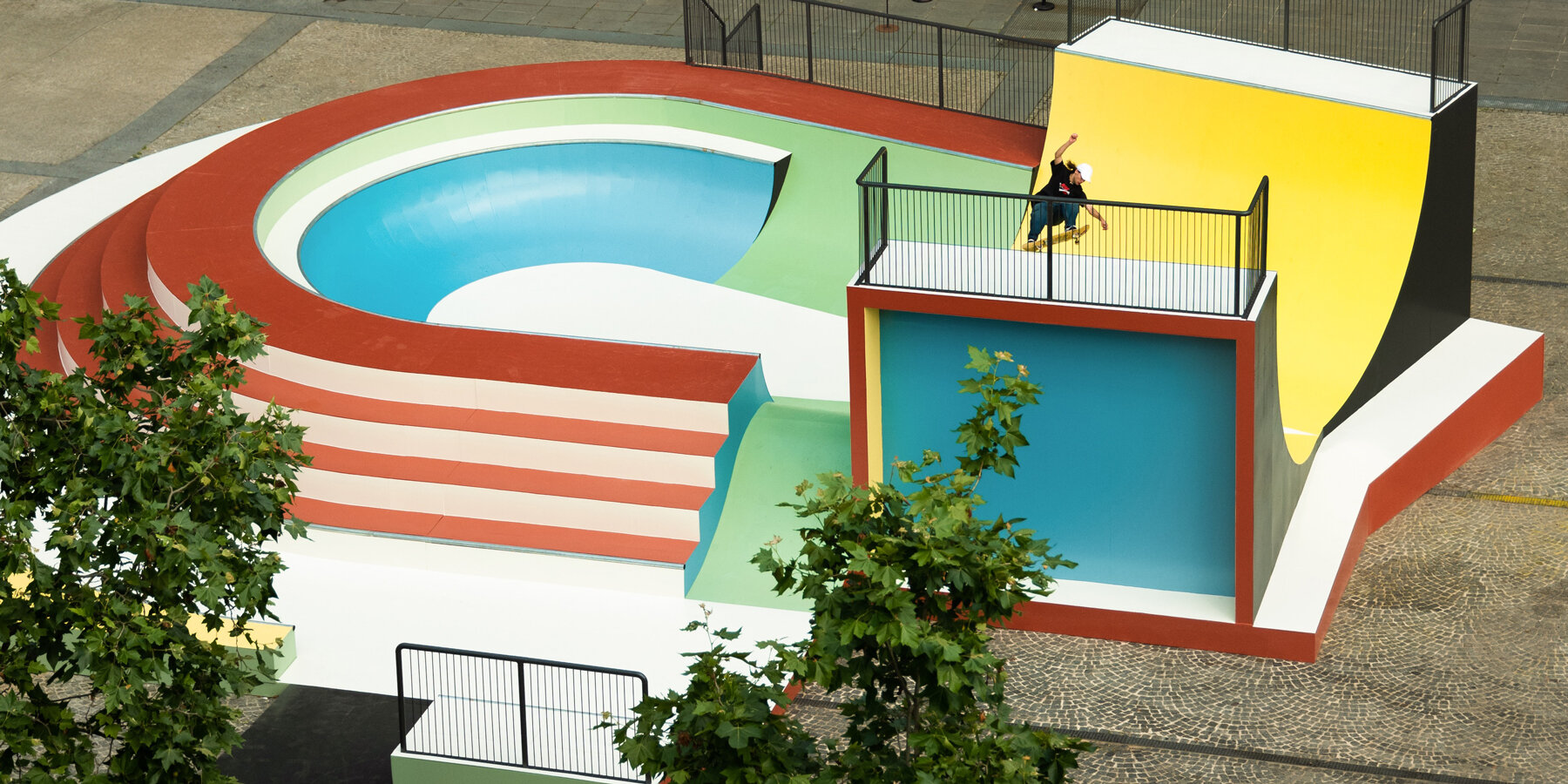 The skateable sculpture’s polychrome palette includes red, green, and yellow, a selection of ochre shades that may invoke the hues of Renaissance paintings as well as the colors established in 1931 by modernist architect Le Corbusier. Raphaël Zarka is a skater himself, and he has also written several books on the subject, such as La Conjonction interdite, A Chronicle of Skateboarding 1777-2009, and Free Ride and Riding Modern Art. For him to work on Cycloïd Piazza for Centre Pompidou and release it in time for the Paris 2024 Olympic Games may be a full-circle moment, a platform that has allowed him to apprehend how he approaches shapes and spaces.