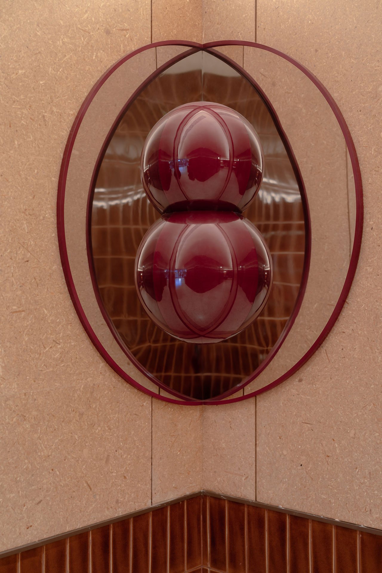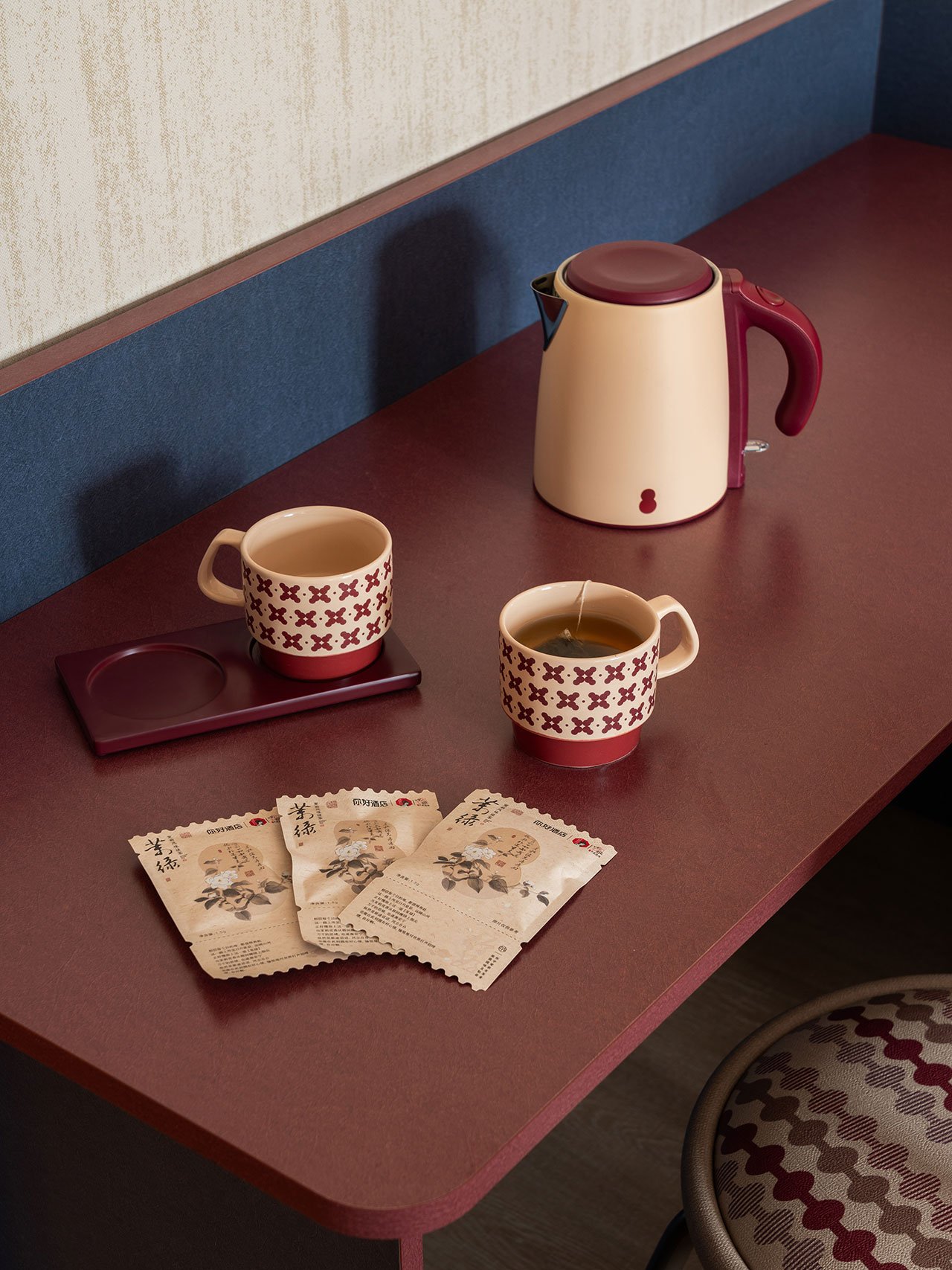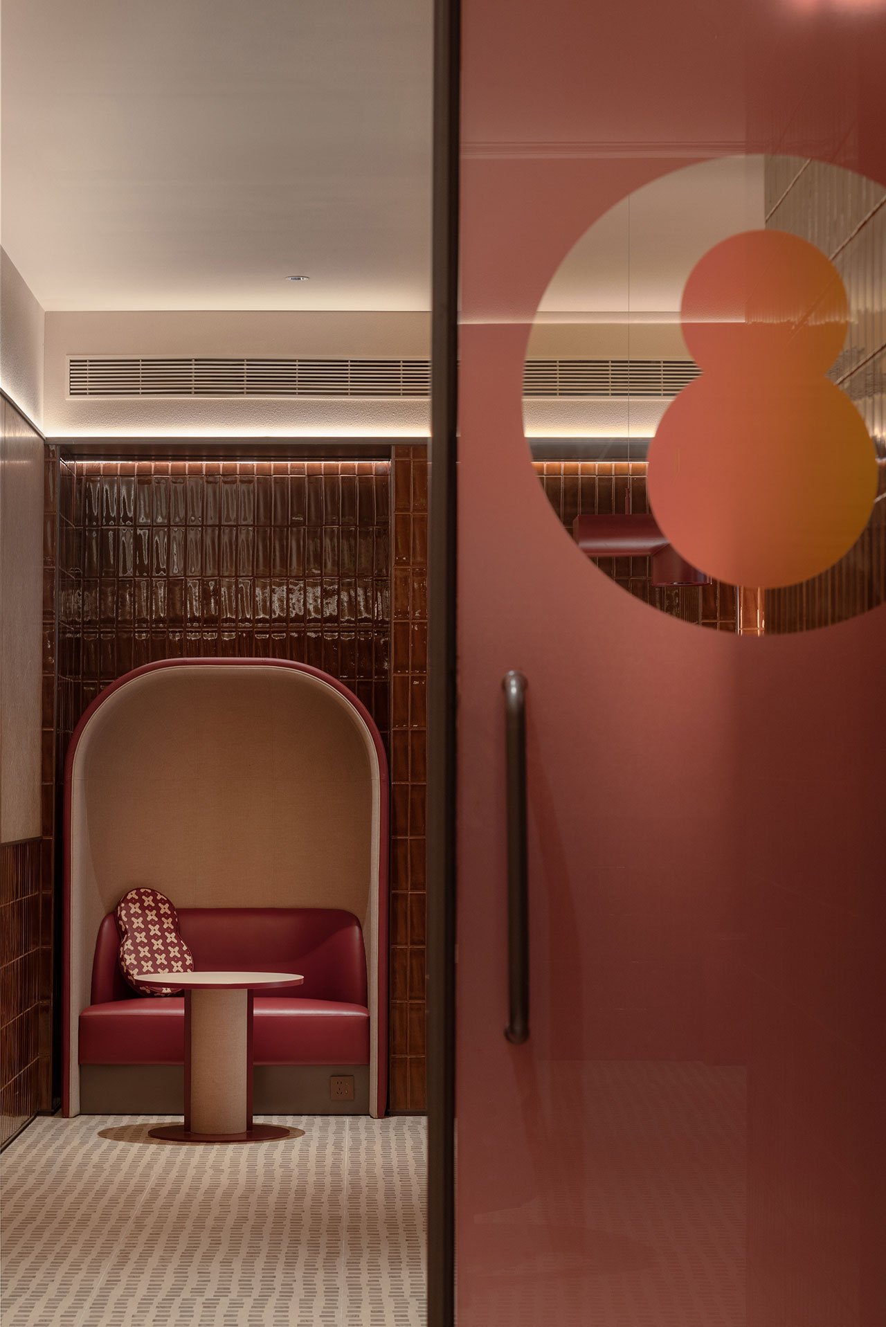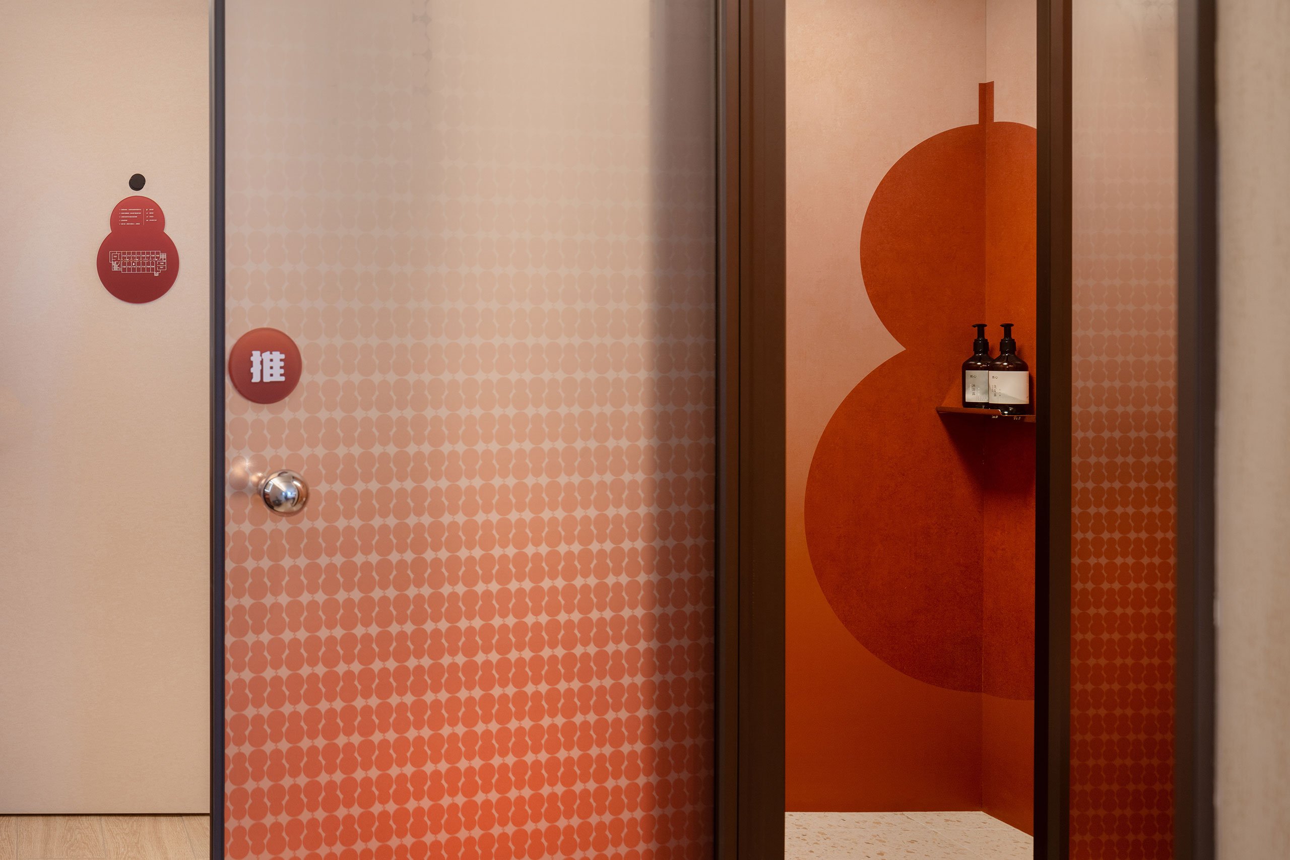 Adding to the schemes’ geometric playfulness is a plethora of figure eight shapes inspired by the silhouette of the calabash. Called húlu in Chinese, the calabash is regarded in Chinese culture as an auspicious object, traditionally used for containers, musical instruments and decorative items. A symbol of good blessings and prosperity, the voluptuous shape can be found throughout the hotel’s premises, including the guest rooms which have also been designed with the same whimsical sensibility. From pendant lights and pillows, to decorative patterns and wall prints, to signage, including a giant illuminated version gracing the façade, the húlu’s ubiquitousness imbues the hotel with a sense of cultural richness and auspicious charm.