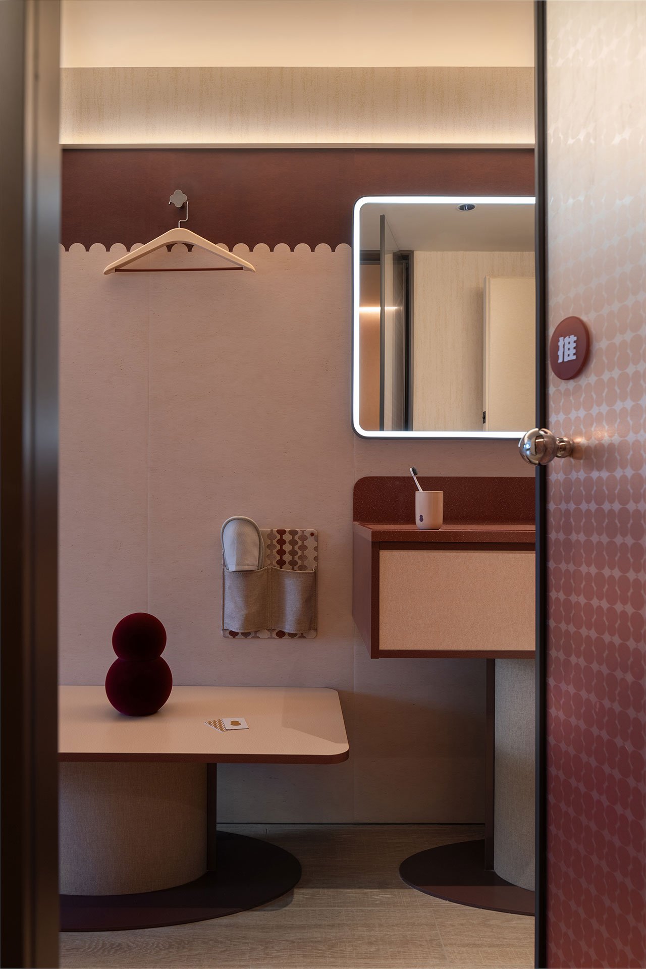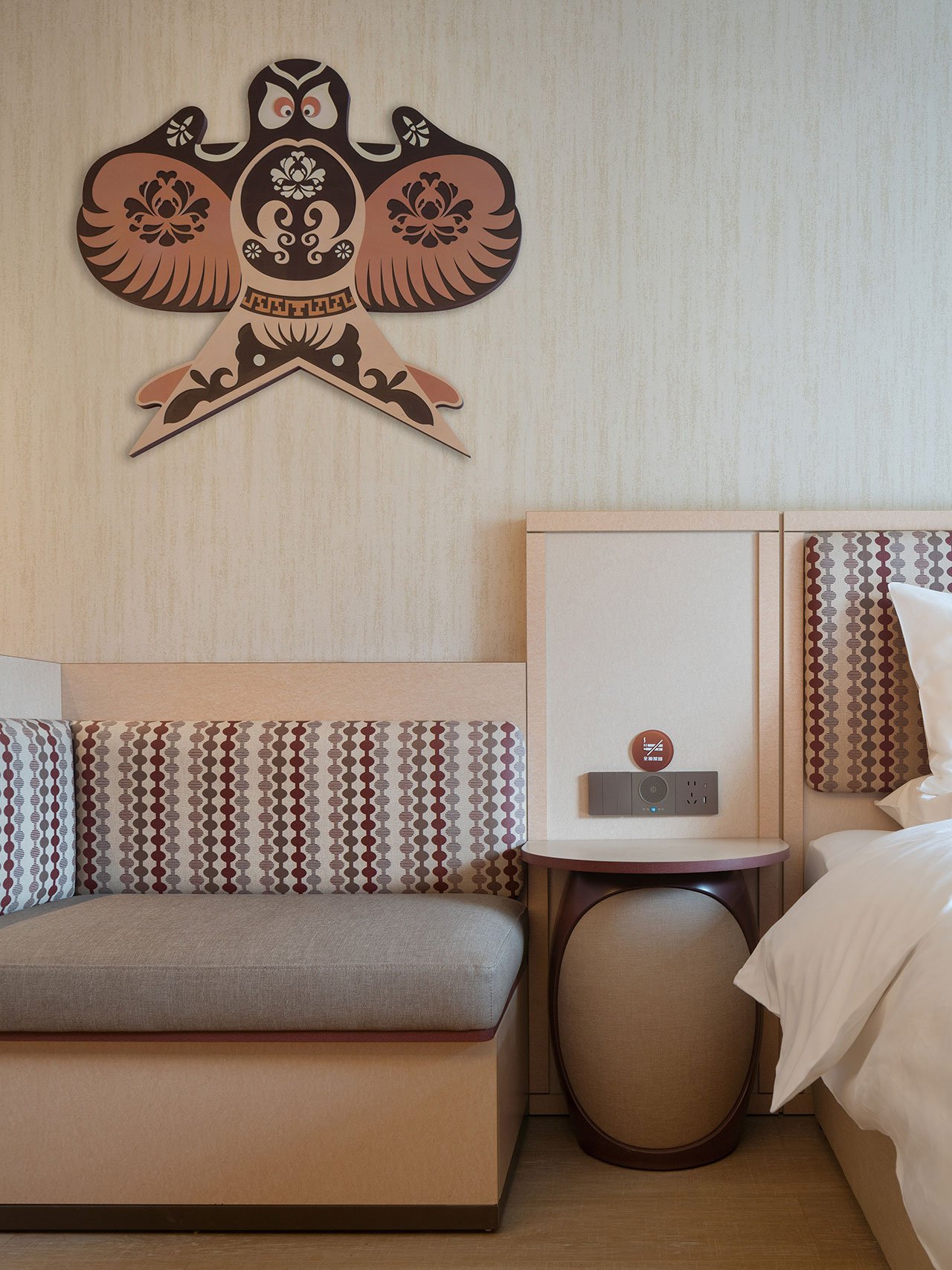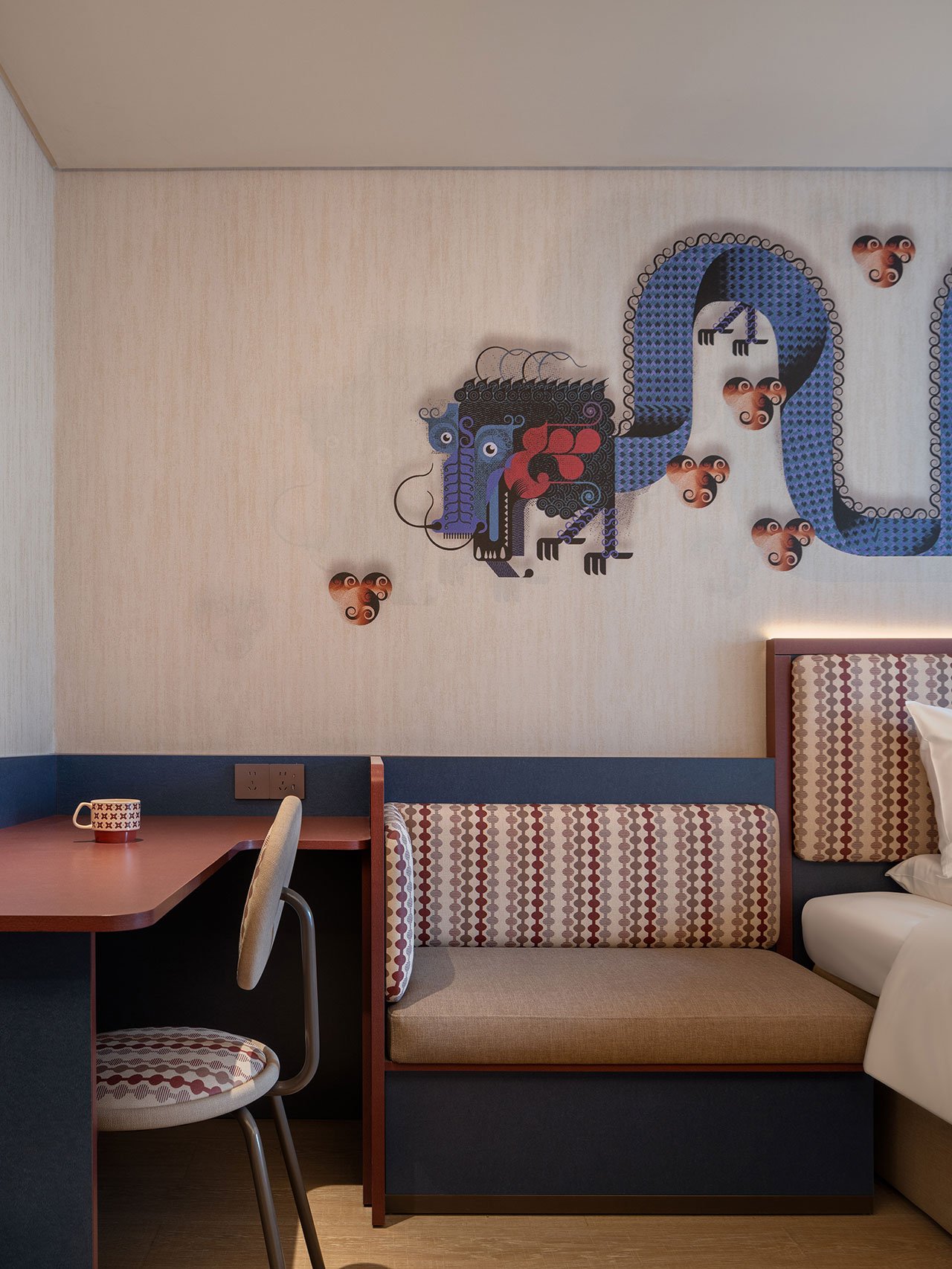 객실 또한 장난기 넘치는 감각으로 디자인되었으며, 펜던트 조명, 베개, 장식 패턴, 벽면 프린트 등 곳곳에서 박의 형태를 찾아볼 수 있습니다. 이러한 요소들이 호텔 전체에 걸쳐 문화적 풍부함과 길운의 매력을 더하고 있습니다.