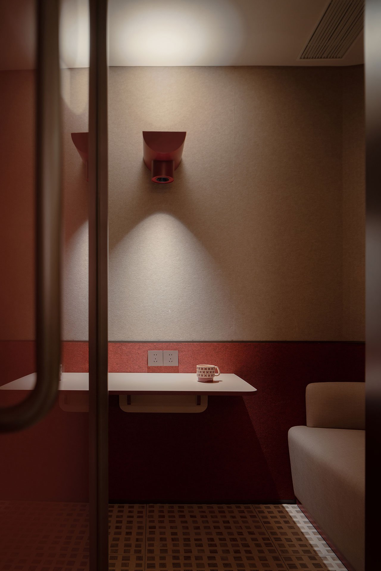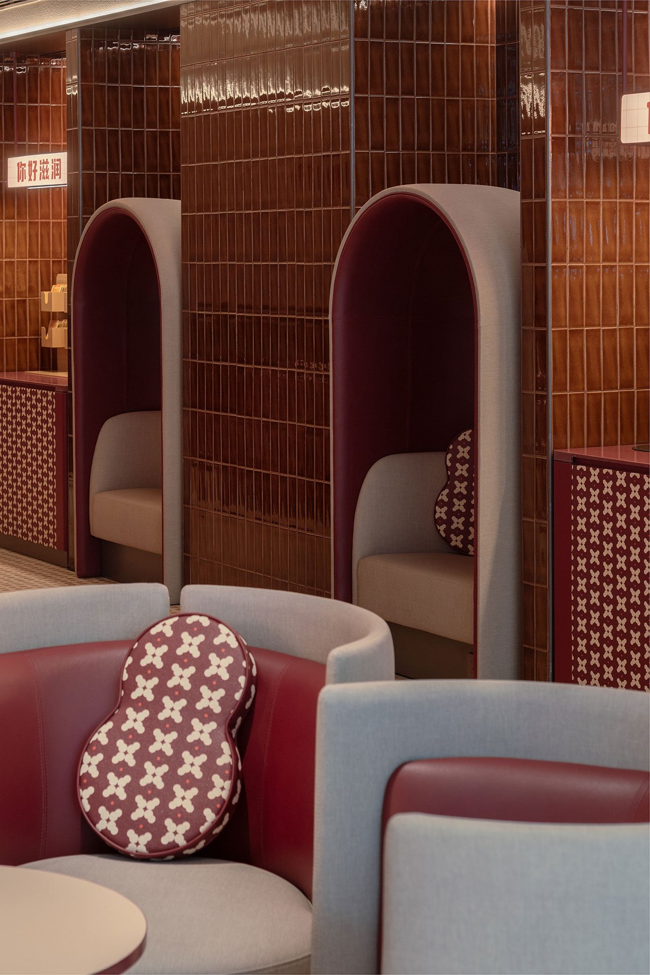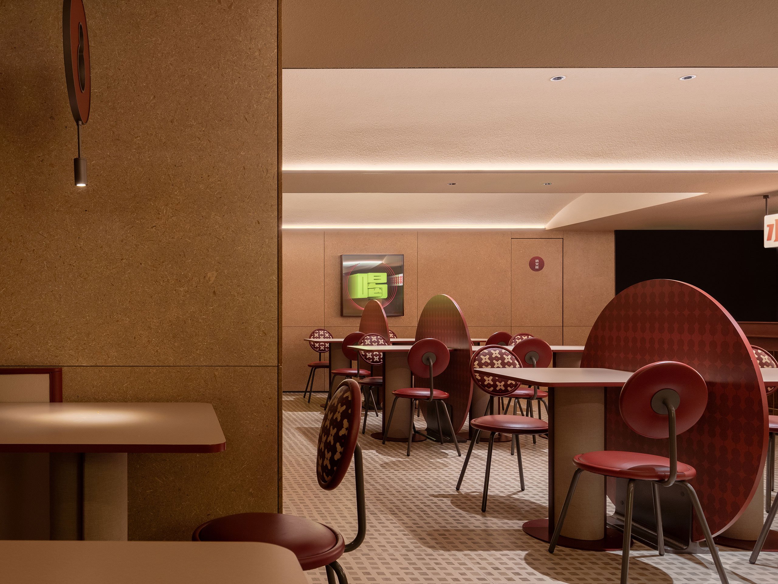 Functioning as a reception, lobby, café and breakfast area, the hotel’s open- lan public area is a welcoming space seamlessly connected to the tree-lined street thanks to a fully glazed entrance and full-height folding windows. Swathed in burgundy-red hues, the space calls out to passers-by to step inside in line with the hotel’s name – ni hao is used to warmly welcome someone or initiate a conversation. To enhance its appeal, the designers have applied a punchy, graphic design-informed aesthetic that combines rectilinear tiling patterns with a plethora of circular forms, ranging from the cylindrical reception counter, to the rounded corners of the walls, to the shape of the bespoke tables and chairs. A series of lightboxes with orange-hued typography demarcating the check-in desk, coffee station, juice bar and other amenities enhance the vibrant sense of community as do various sitting configurations.