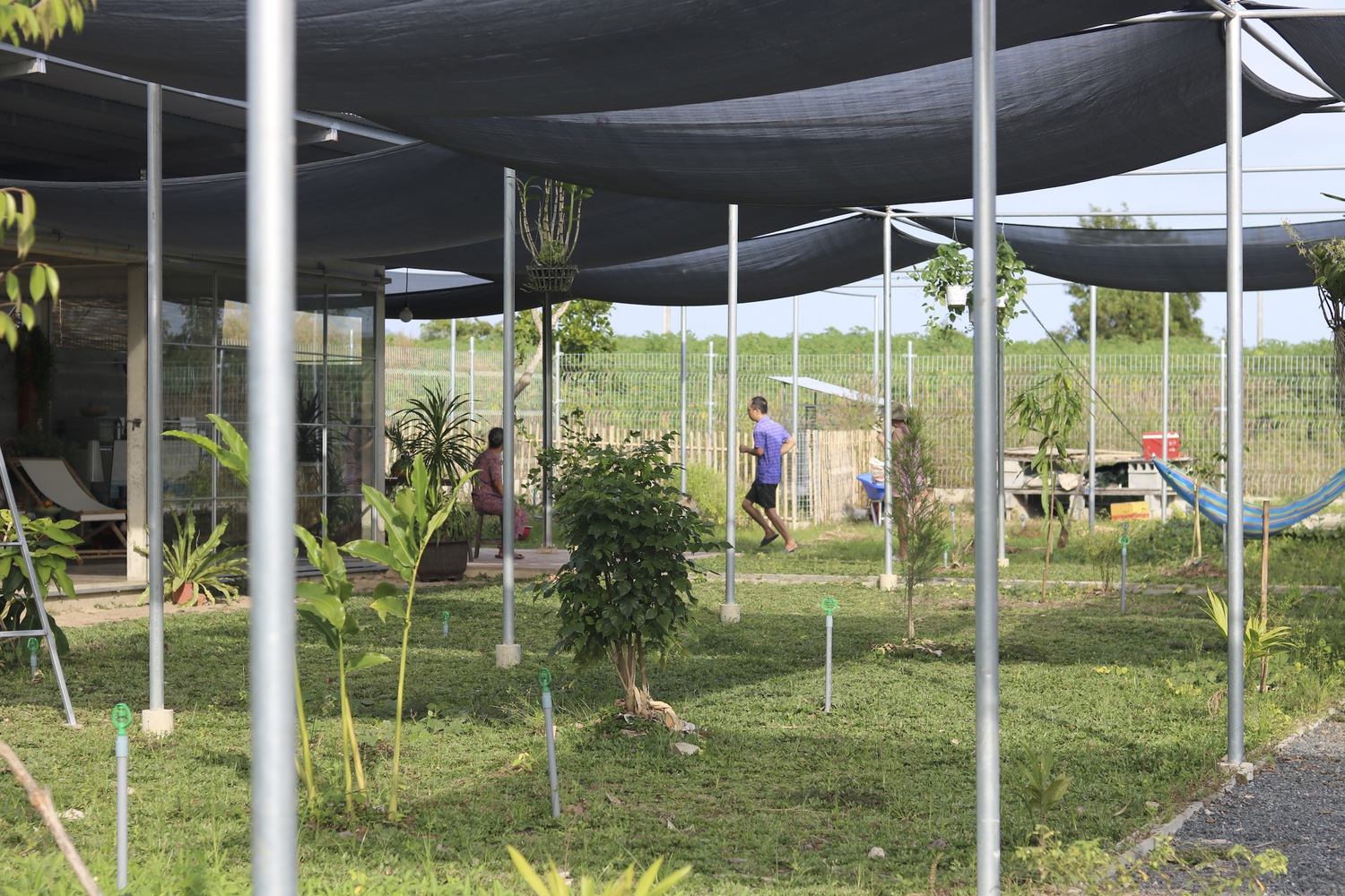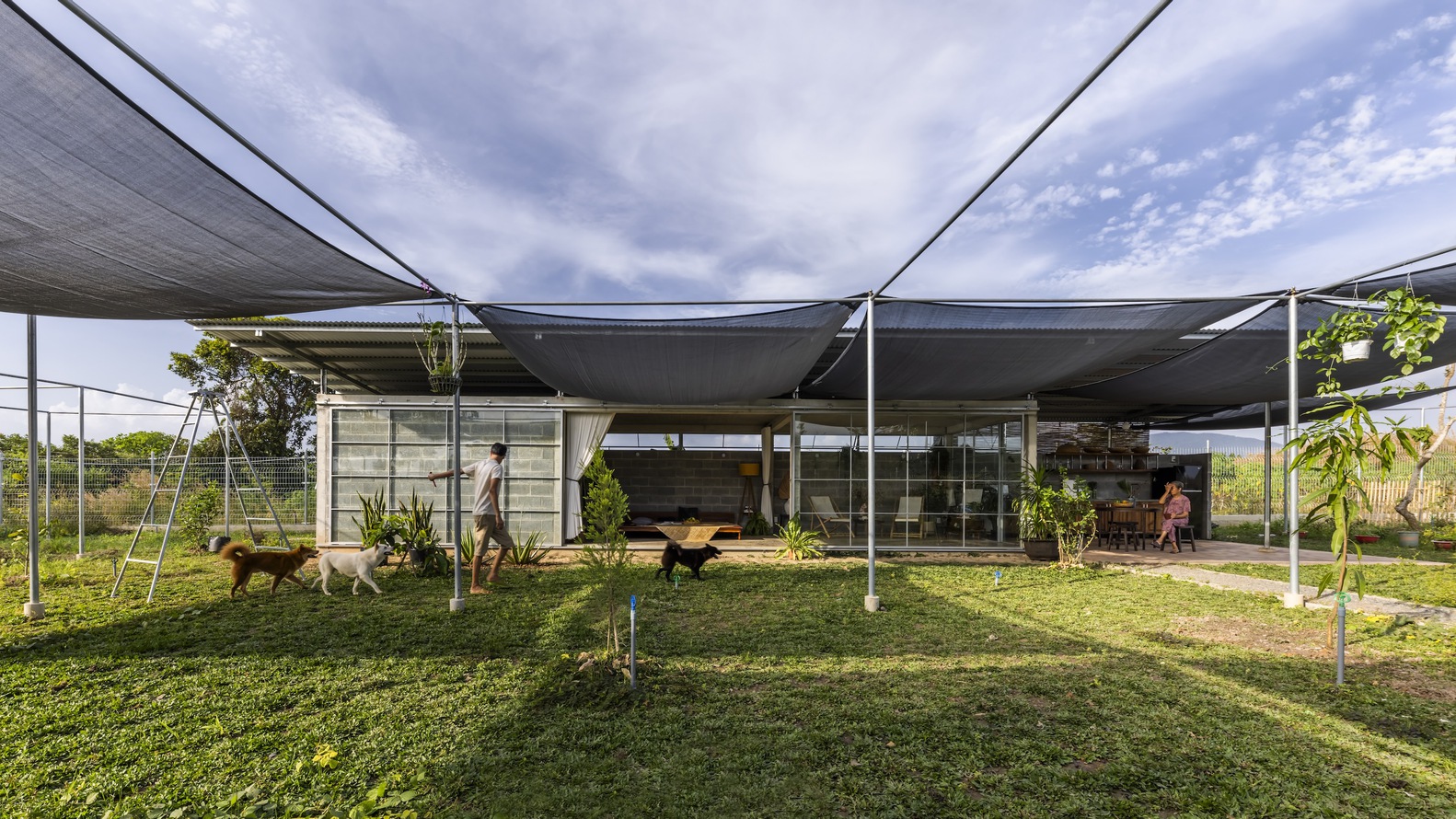 The structural grid based on the concrete block module extends across the entire plot, where the forest of steel columns is erected. Mass produced steel pipes were embedded in concrete footings deep enough to omit ground beams and topped with threads where translucent tarps could be installed. This detachable fabric can be easily relocated by hand to create shadows as desired, according to the solar angle that changes from south to north over dry and wet seasons. Now, the field is gradually filled up with clinging greenery, hammocks, and bamboo louvers attached to the columns, while edible plants are growing up in the local ecosystem. The client described this whole environment as “1.000m2 of house, instead of 100m2 and leftover”.