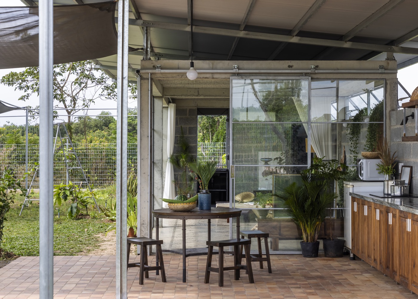 Series of weak boundaries In the hot and humid tropics, it is more suitable to treat spatial boundaries as imperfect and collectively layer them around the space rather than making a strong singular line to enclose. To implement that, we employ various environmental factors, including not only windows and curtains but also overhanging roofs, tarps, the ground surface, and even the shadows of plants outside. We believe accepting such a series of imperfect elements and a resilient environment, as opposed to what the modern world aspires to achieve, will lead to a suitable future for the suburb.