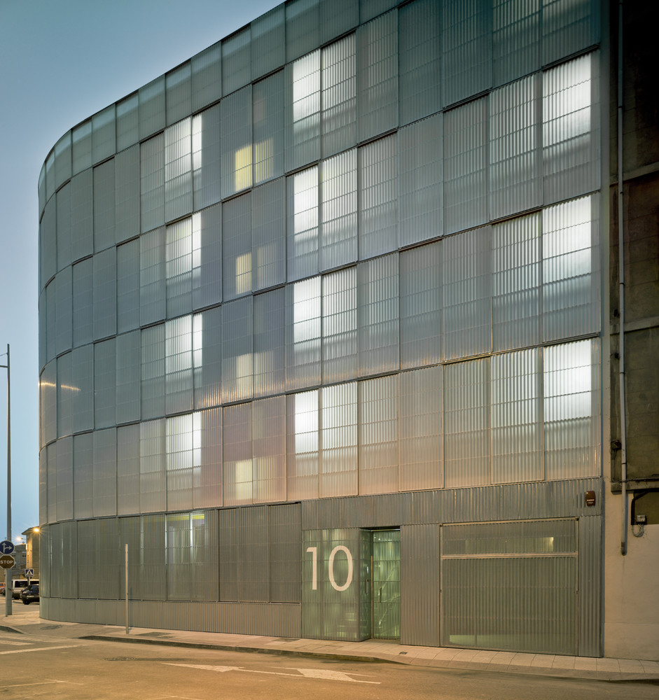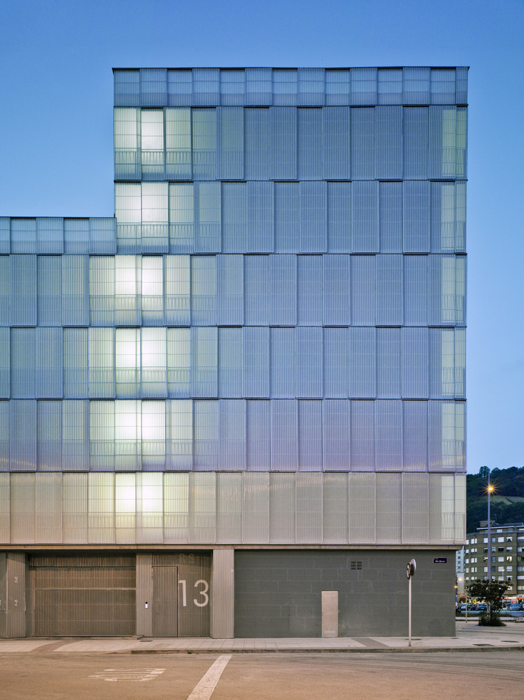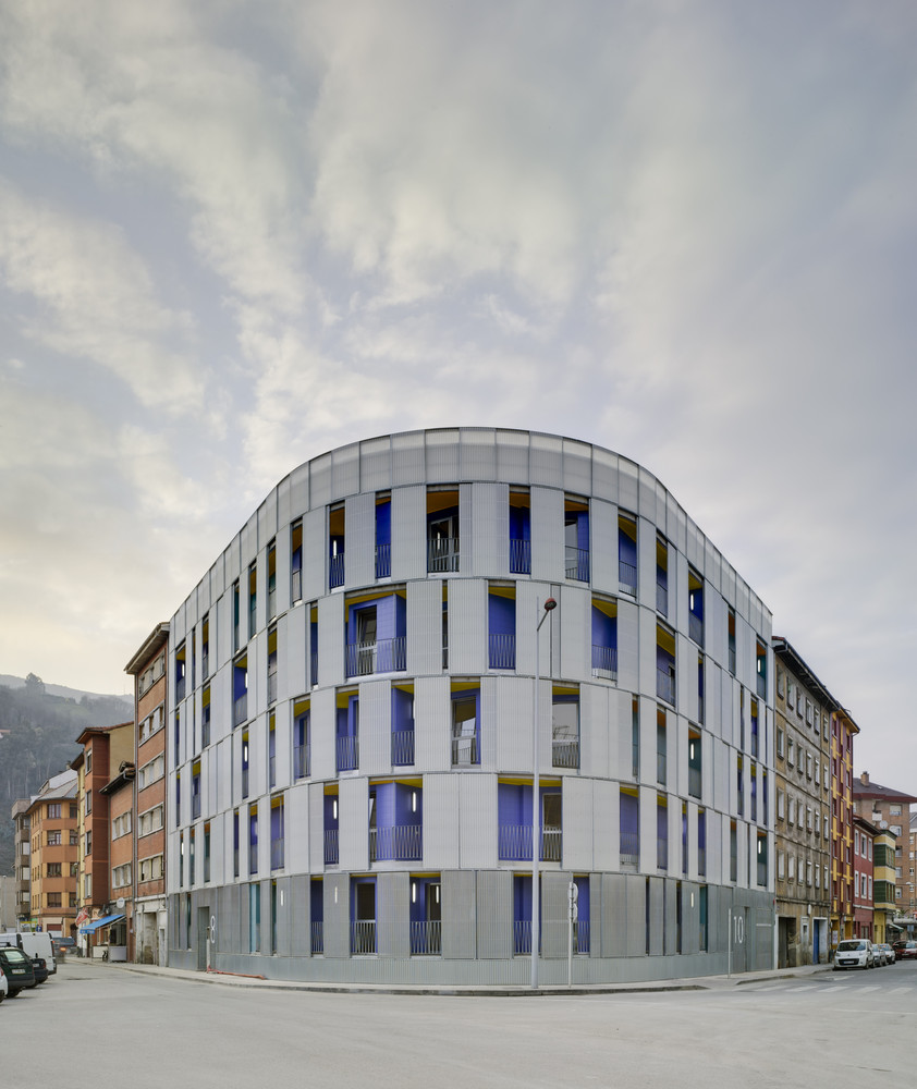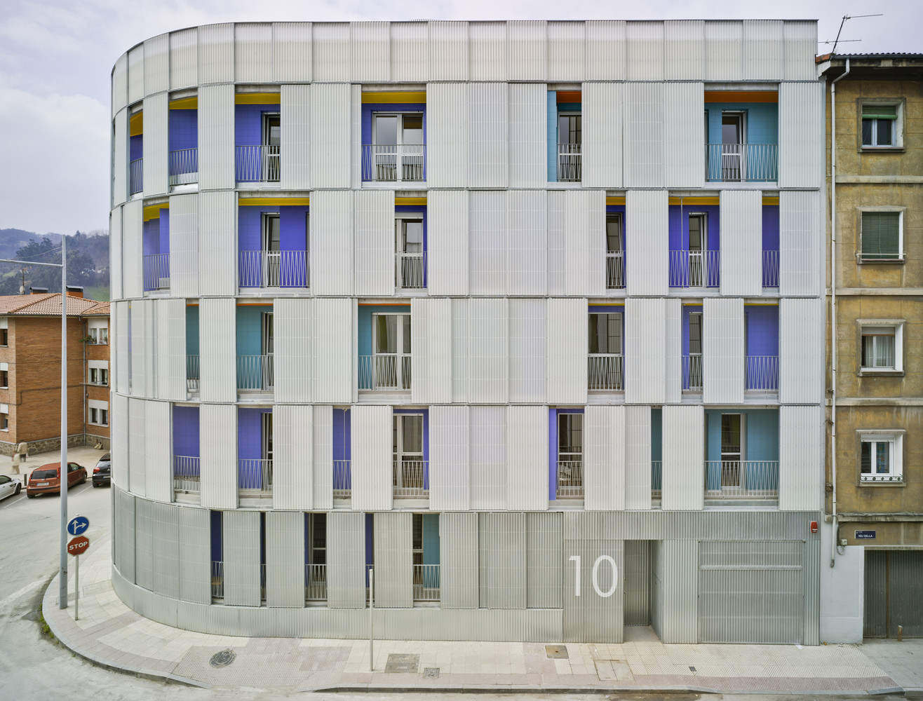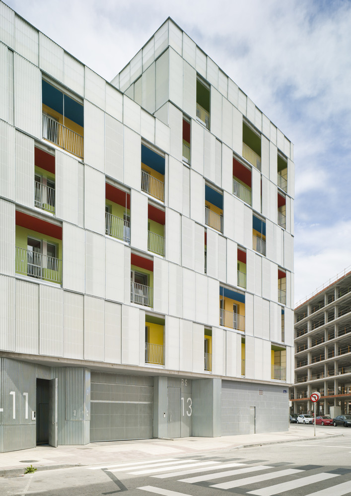 The urban facade is solved with a polycarbonate skin located on the front of the continuous terrace, on the first level, instead of polycarbonate, the façade is made of perforated steel sheet. This skin is opened by a sliding system, which solves the relationship of the dwellings with the outside. The second front of the gallery is lined with ceramic tiles of various colors. The system allows a intermediate location between the outside temperature and the internal working climate condition. The interior color of the ceramic is in contrast with the gray skies of the area.