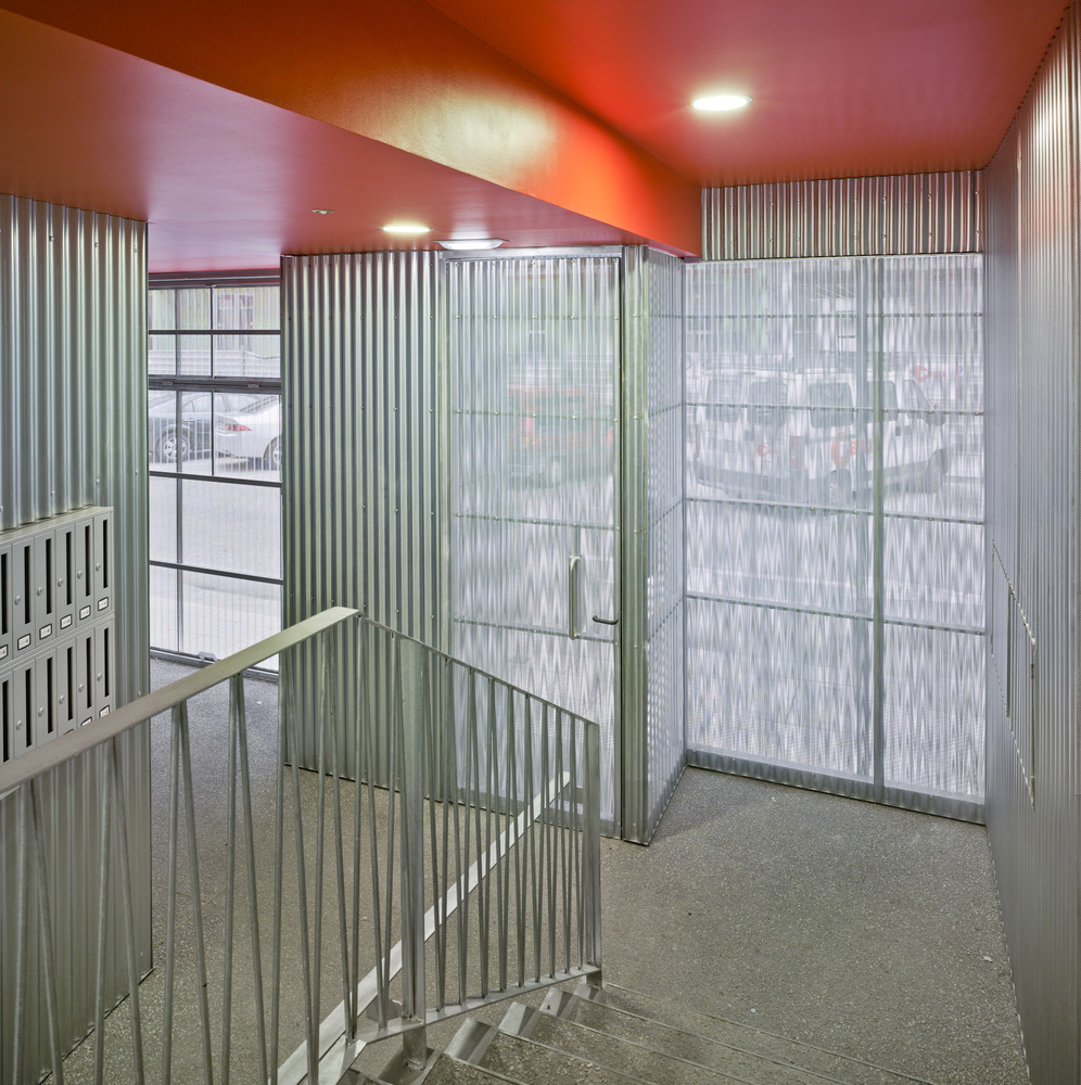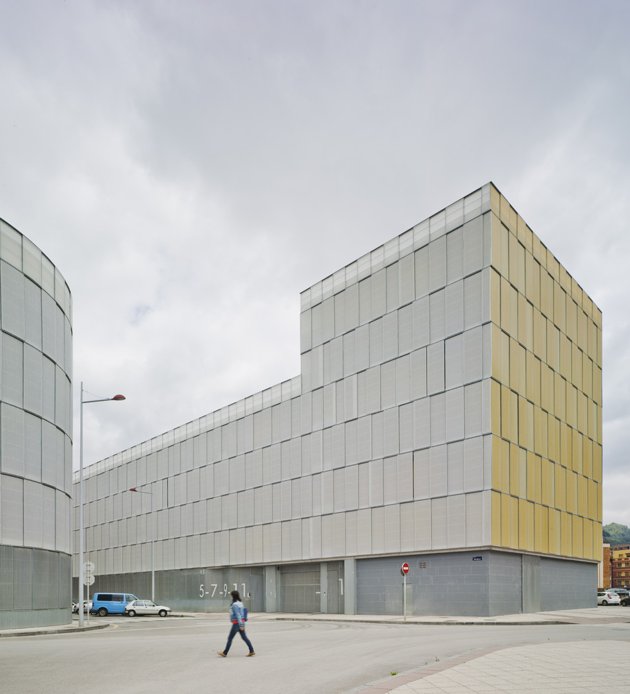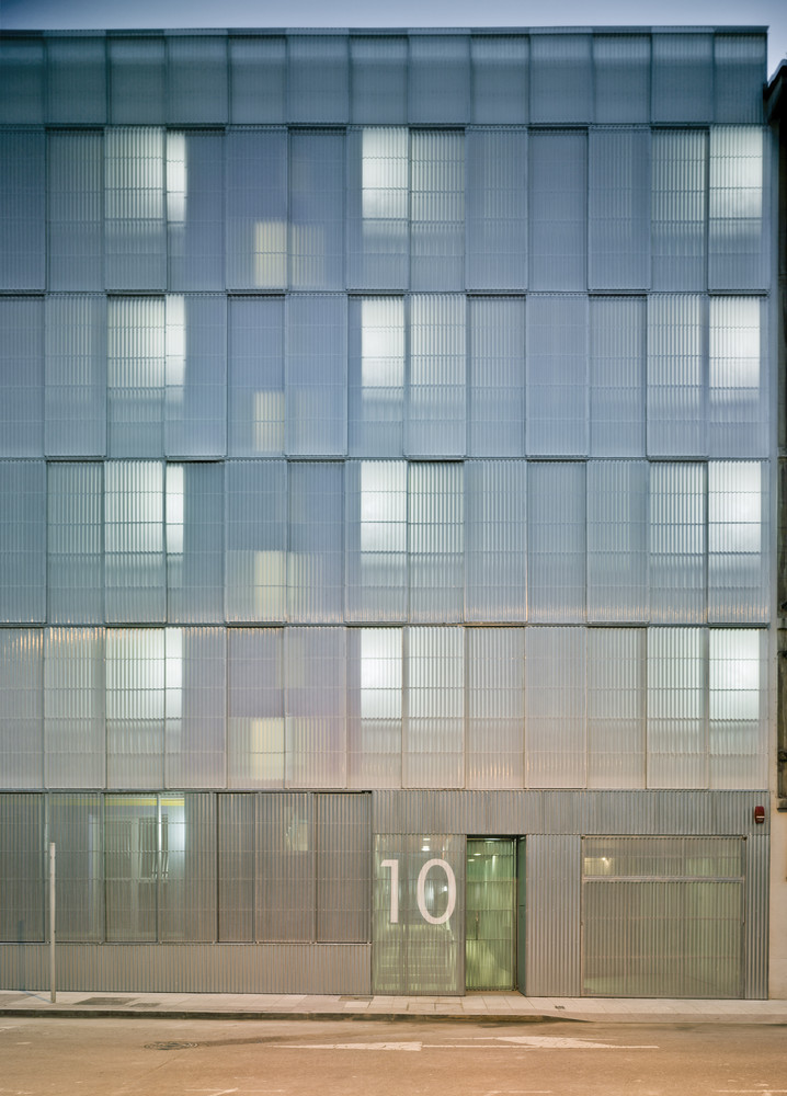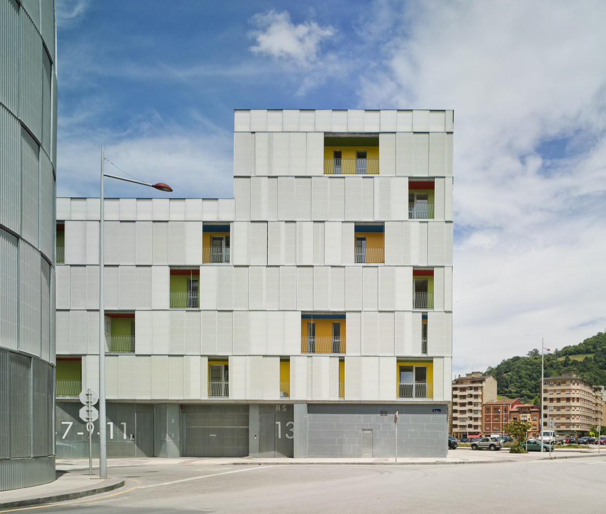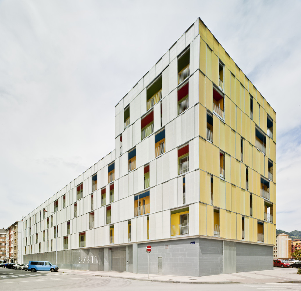 The urban facade is solved with a polycarbonate skin located on the front of the continuous terrace, on the first level, instead of polycarbonate, the façade is made of perforated steel sheet. This skin is opened by a sliding system, which solves the relationship of the dwellings with the outside. The second front of the gallery is lined with ceramic tiles of various colors. The system allows a intermediate location between the outside temperature and the internal working climate condition. The interior color of the ceramic is in contrast with the gray skies of the area.