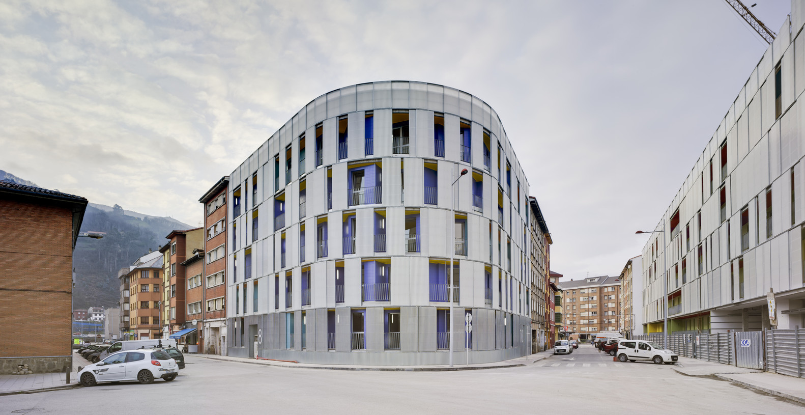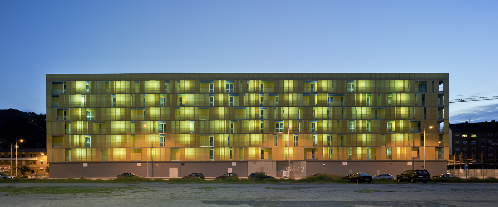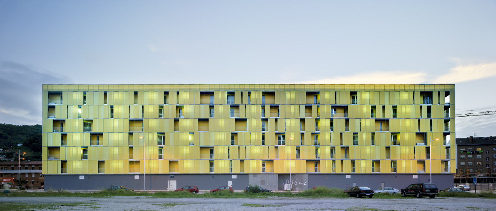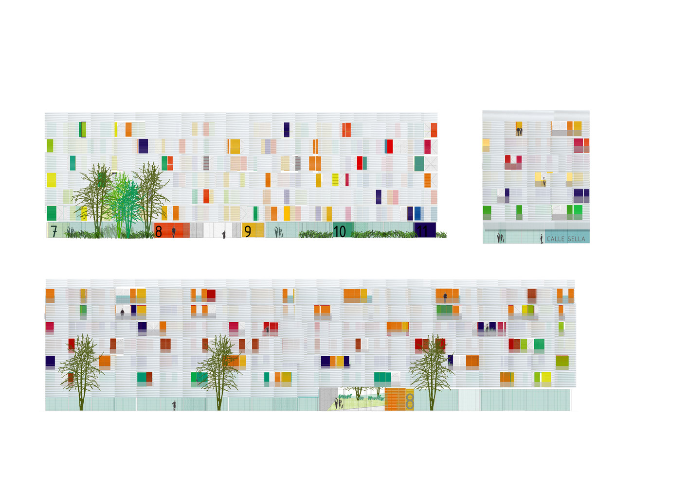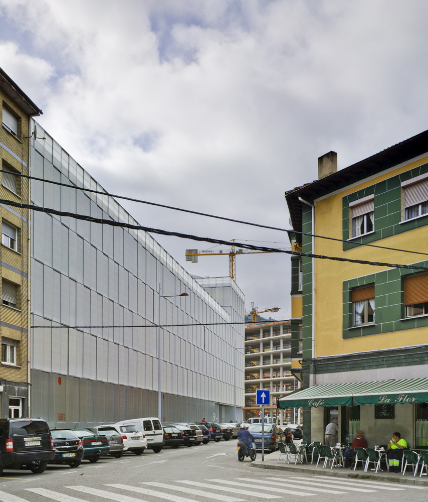 The urban facade is solved with a polycarbonate skin located on the front of the continuous terrace, on the first level, instead of polycarbonate, the façade is made of perforated steel sheet. This skin is opened by a sliding system, which solves the relationship of the dwellings with the outside. The second front of the gallery is lined with ceramic tiles of various colors. The system allows a intermediate location between the outside temperature and the internal working climate condition. The interior color of the ceramic is in contrast with the gray skies of the area.
