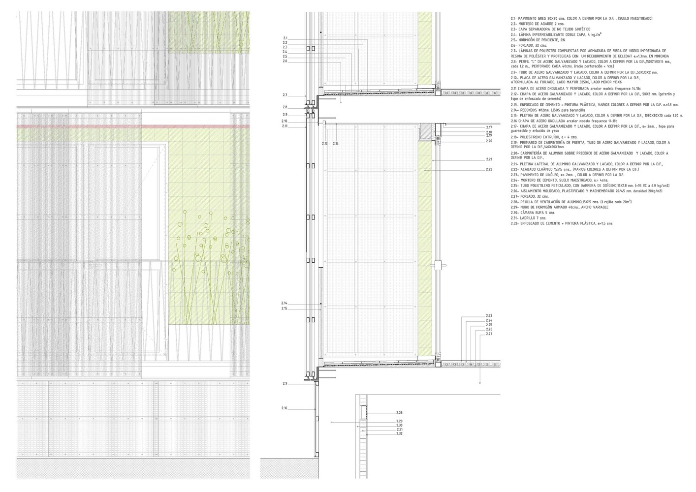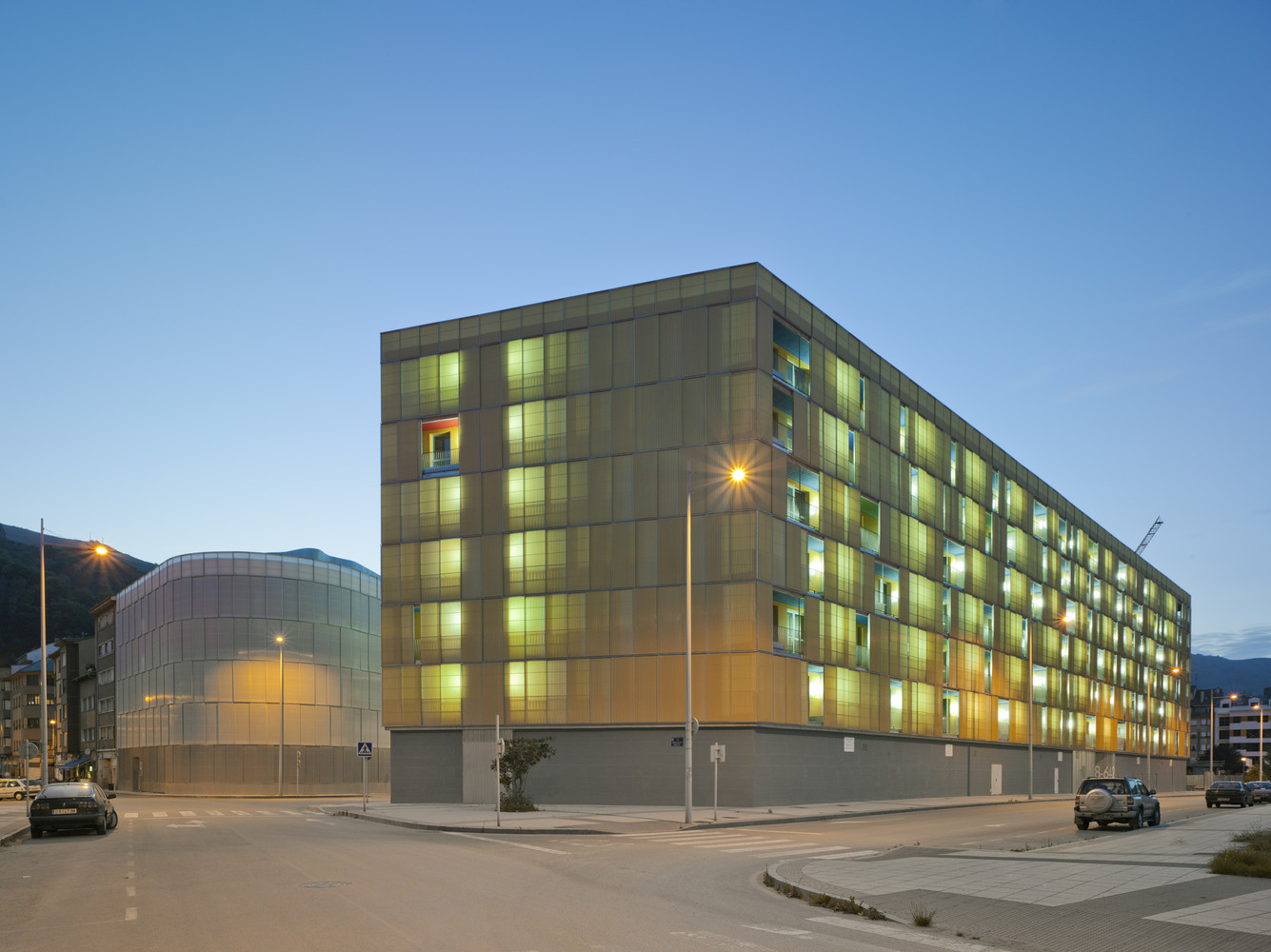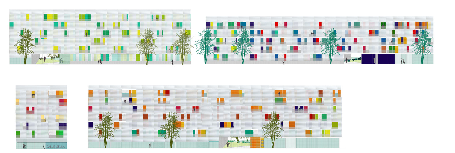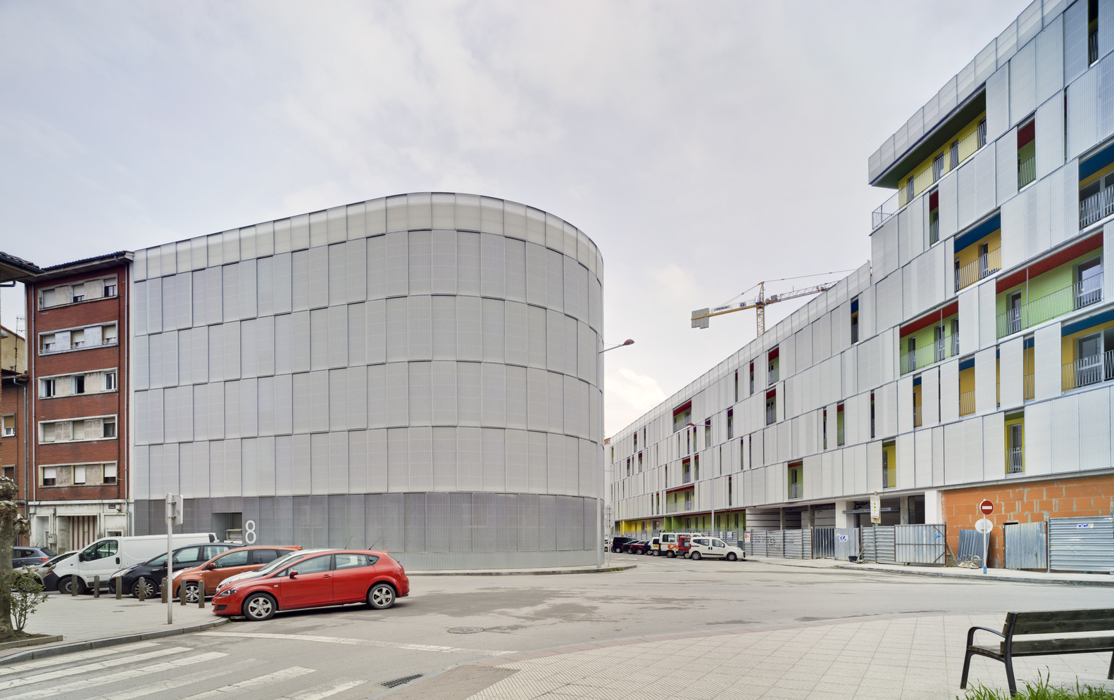 The urban facade is solved with a polycarbonate skin located on the front of the continuous terrace, on the first level, instead of polycarbonate, the façade is made of perforated steel sheet. This skin is opened by a sliding system, which solves the relationship of the dwellings with the outside. The second front of the gallery is lined with ceramic tiles of various colors. The system allows a intermediate location between the outside temperature and the internal working climate condition. The interior color of the ceramic is in contrast with the gray skies of the area.