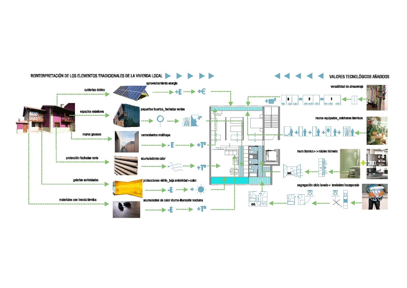 The galleries are configured as an intermediate space between the inner housing and contact with the city. They are warm in winter and cool in summer. They are a thermal insulation space for the building and a same time a in between space for different uses. The dwelling is thought around natural regulated thermal condition, the space in-between defend from noise and seeks defuse light, and protect from exterior views, to provide the best living ambience. The use of galleries is very traditional in the North of Spain, where rain and clouds are common every day, and reduce the use of heating in the winter. The summers are very humid so easy cross ventilation is an important necessity. The interior patio is place for some trees that help to protect the views and the noise between different dwellings.