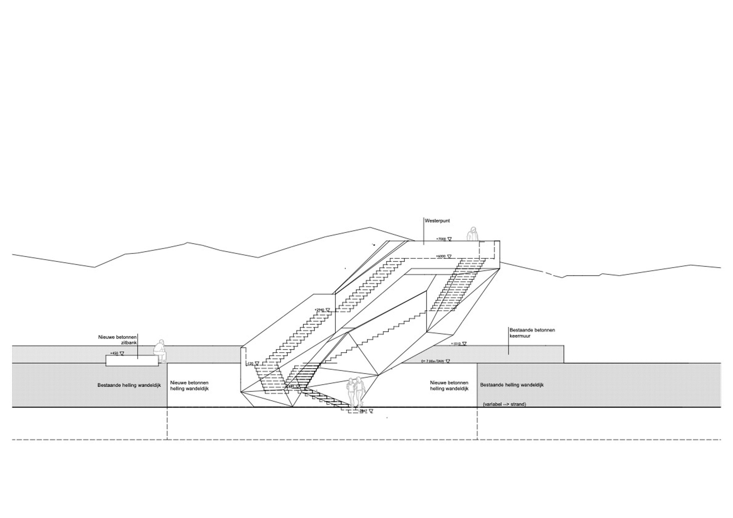 Westerpunt의 구조적 설계는 매우 정교하다. 직선 계단 섹션은 고도의 기술을 요하며, 108도 각도로 연결된 이 계단들은 안정성을 위해 철저히 계산되었다. 고강도 콘크리트와 강철 난간의 조합은 이 구조물이 해안의 극한 조건에서도 견딜 수 있도록 보장한다.