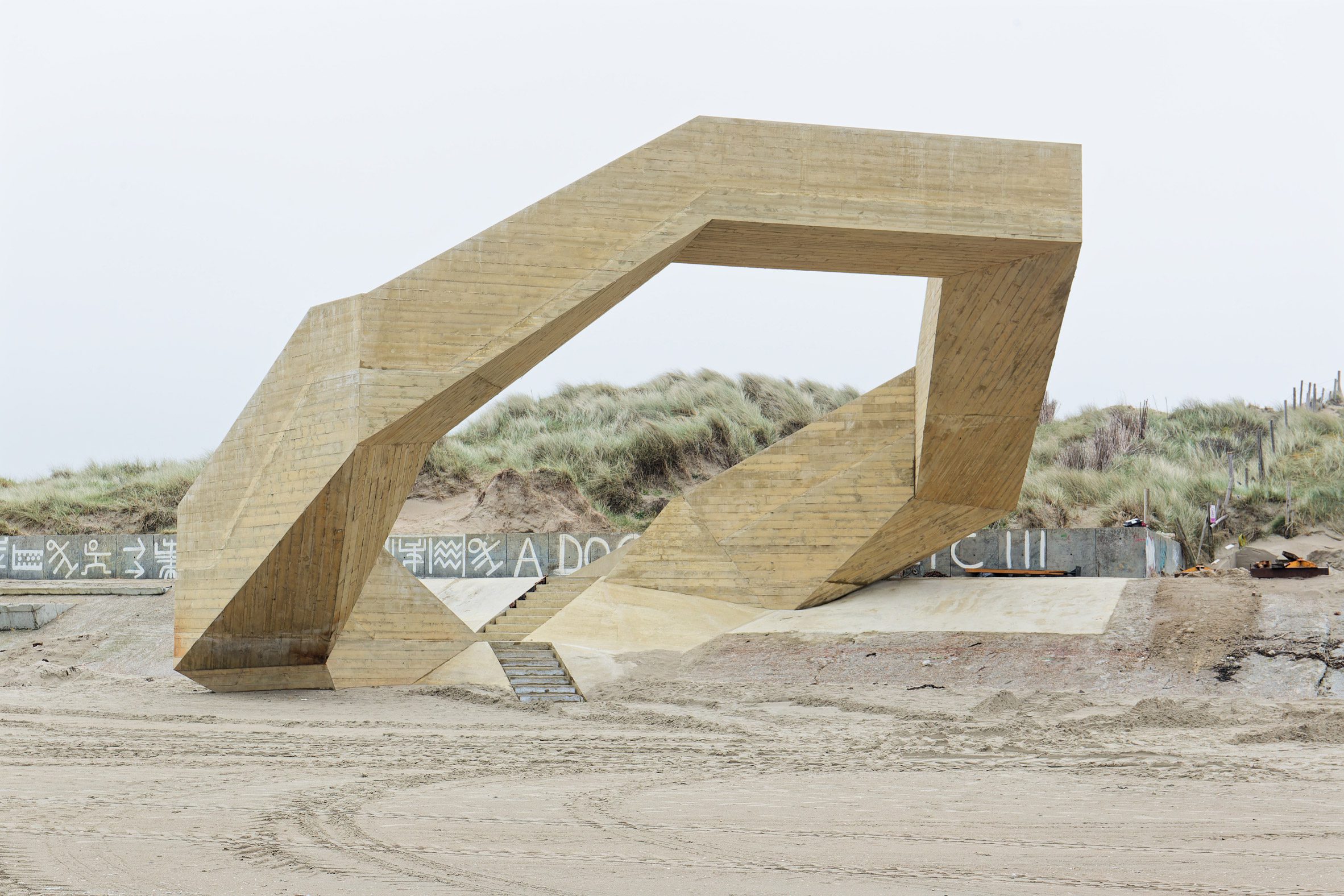 **주변 모래 언덕과 조화:** 이 구조물은 상승과 하강을 반복하며 모래 언덕의 자연스러운 지형을 모방했다. 옅은 색의 보드 마크 콘크리트(pale, board-marked concrete)를 사용하여 해안 기후에 견디기 쉽고 모래 환경과 시각적으로 조화를 이룬다.
