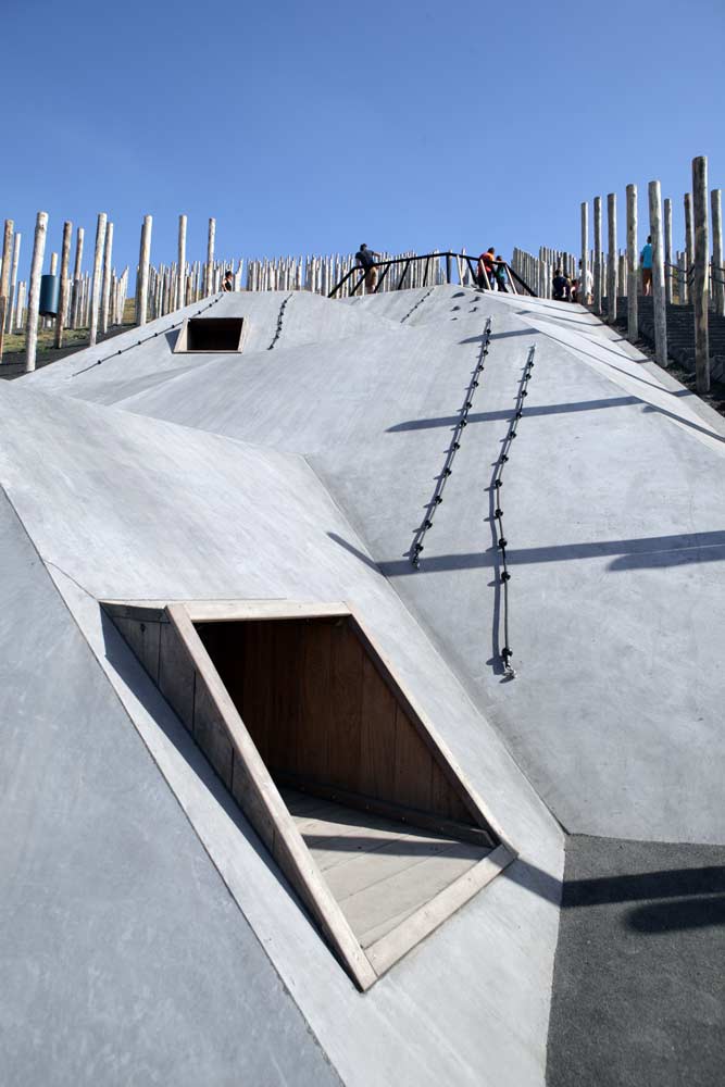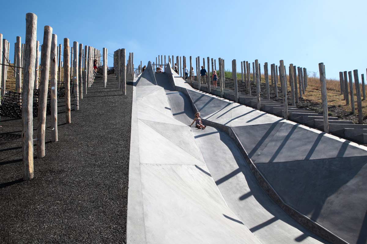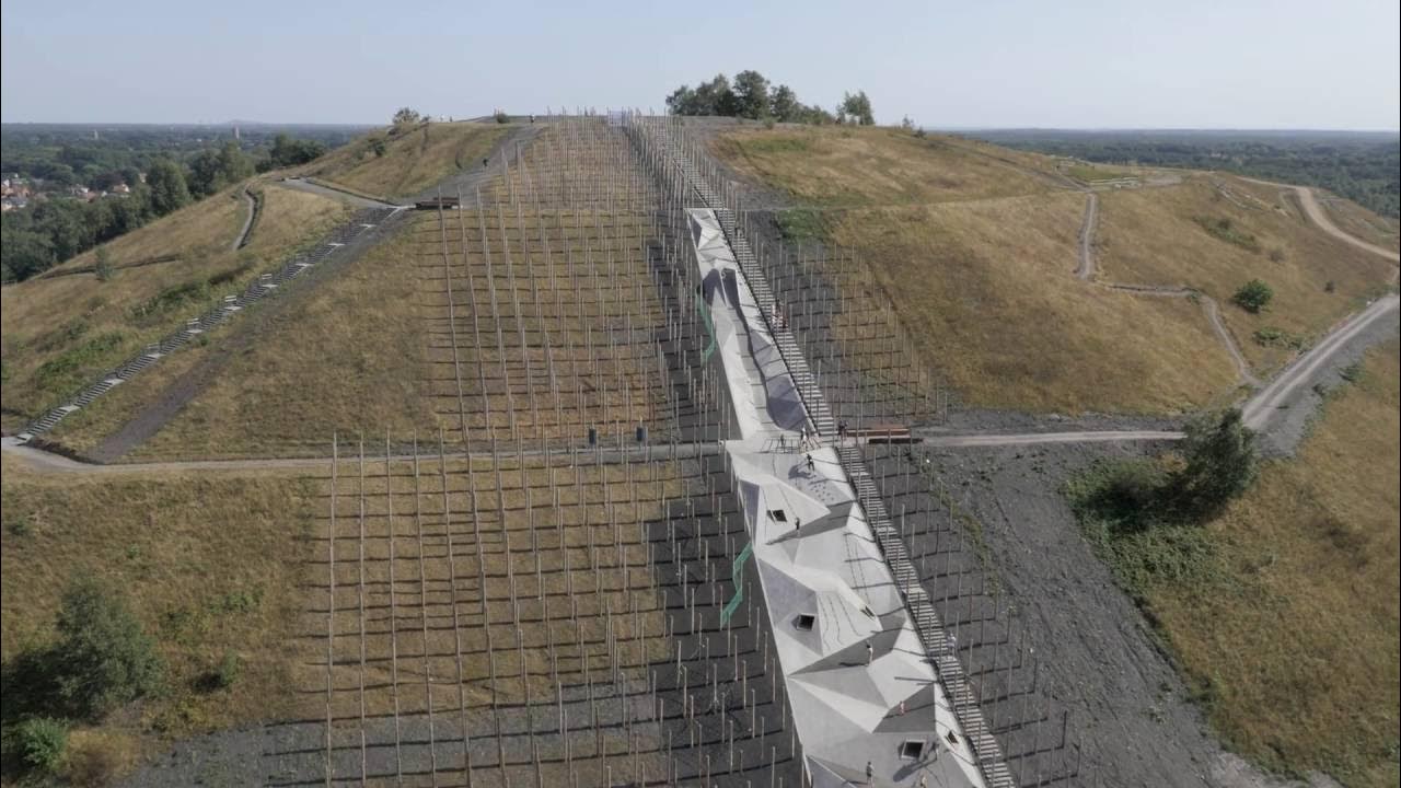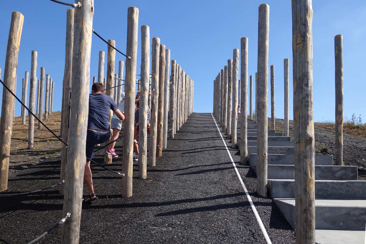 폴 포레스트 (Pole Forest): 북쪽 비탈에는 1,600개의 목재 기둥이 앵커로 고정되어 있습니다. 이 기둥들은 과거 광산 작업에 사용되었던 지하 갱도의 지지 기둥을 연상시키는 디자인 요소입니다. 기둥들 사이에는 균형 빔, 클라이밍 네트, 해먹, 미로, 로프 코스 등 모험적인 놀이 요소가 배치되어 있습니다. 기둥들이 격자 패턴으로 배치되어 있어 흥미로운 시각적 효과를 제공합니다. 이 배열은 과거 광산 갱도의 어두운 환경을 떠올리게 합니다. 특히, 목재 기둥 사이로 난 긴 계단은 다양한 높이의 공간에 쉽게 접근할 수 있게 합니다.
