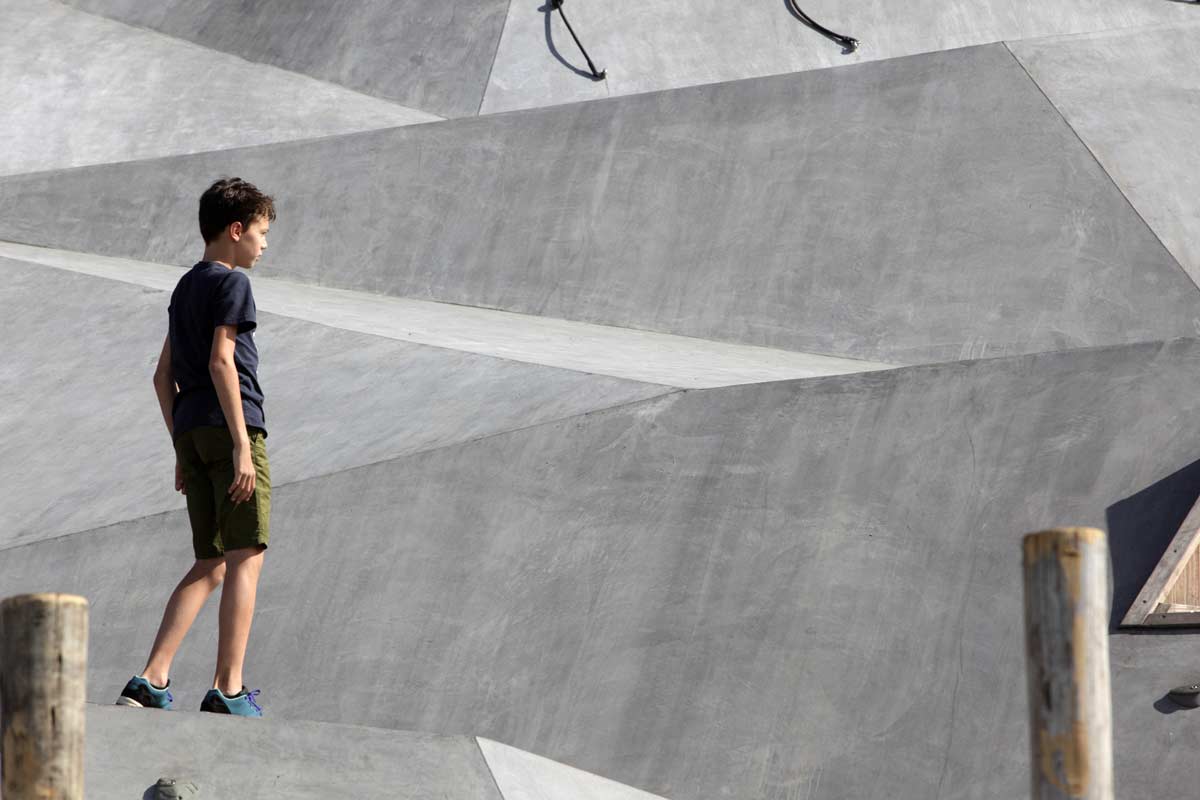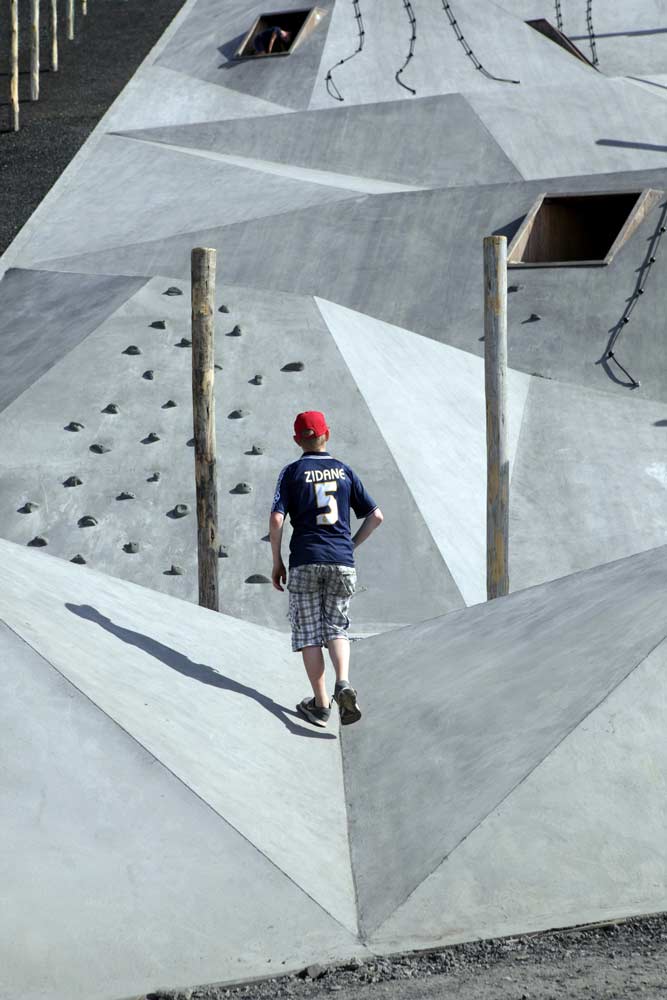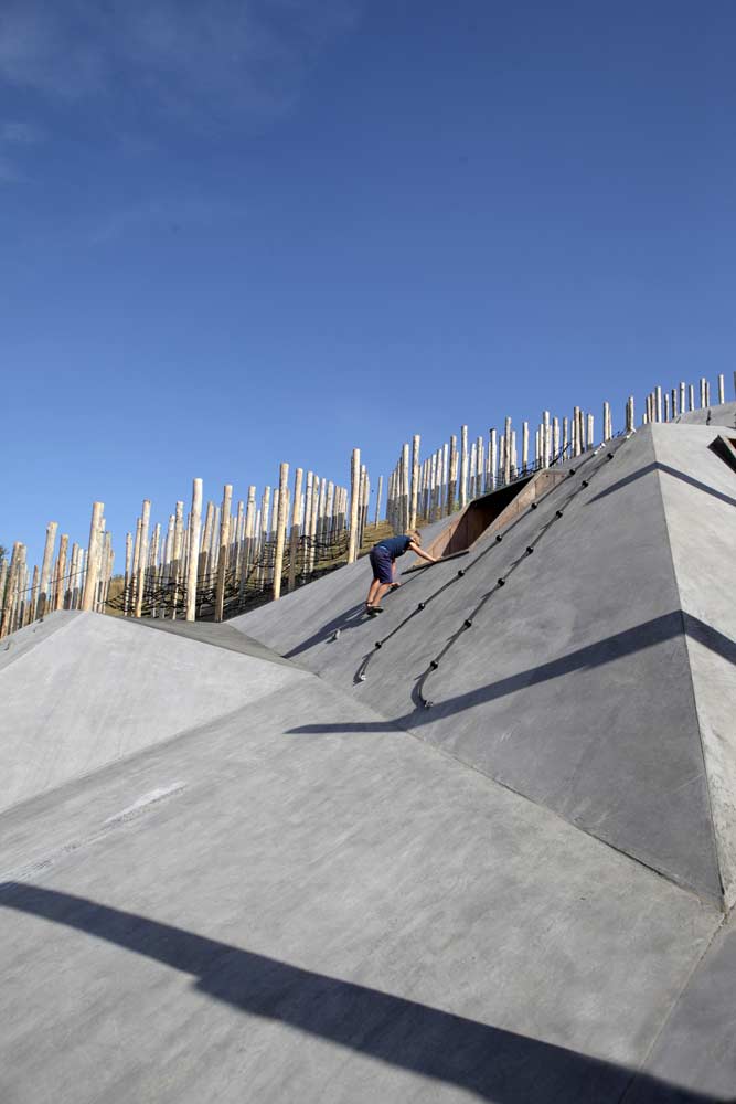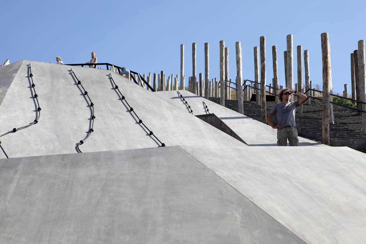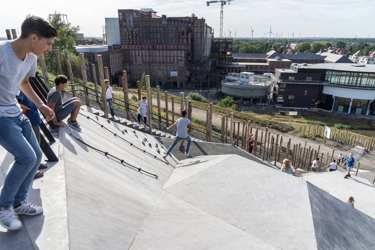 Wedged in between the pole forest lies a large, prismatically shaped play surface. It has been ‘draped’ over the terril, following its height-lines –a gesture that is visible from afar. The surface is a challenging object, that narrows down to the top and ‘crumbles’ at the foot of the hill. This tectonic landscape offers space to an endless variation of play options, and is scattered with crawling tunnels, climbing surfaces with climbing grips and ‘giant stairs’. Its spectacular highlight is the more than twenty meters long slide, which is placed halfway up the hill and is integrated within the relief of the concrete play surface. The various prismatic surfaces invite children to climb, slide, hide and discover. The surface consists of sloped, horizontal and vertical crossings, inspired by the underground mining shafts.