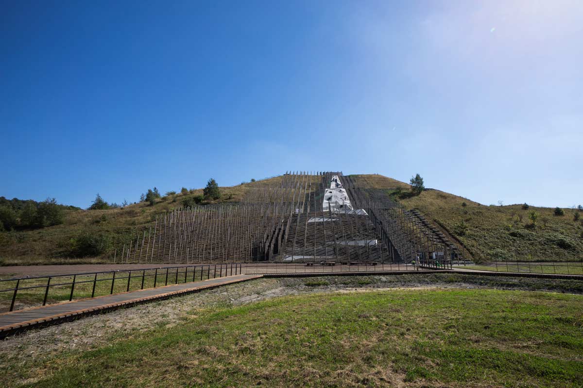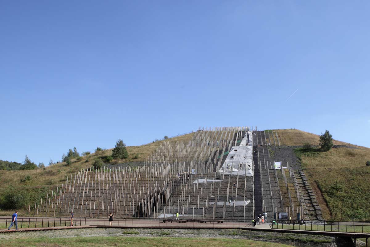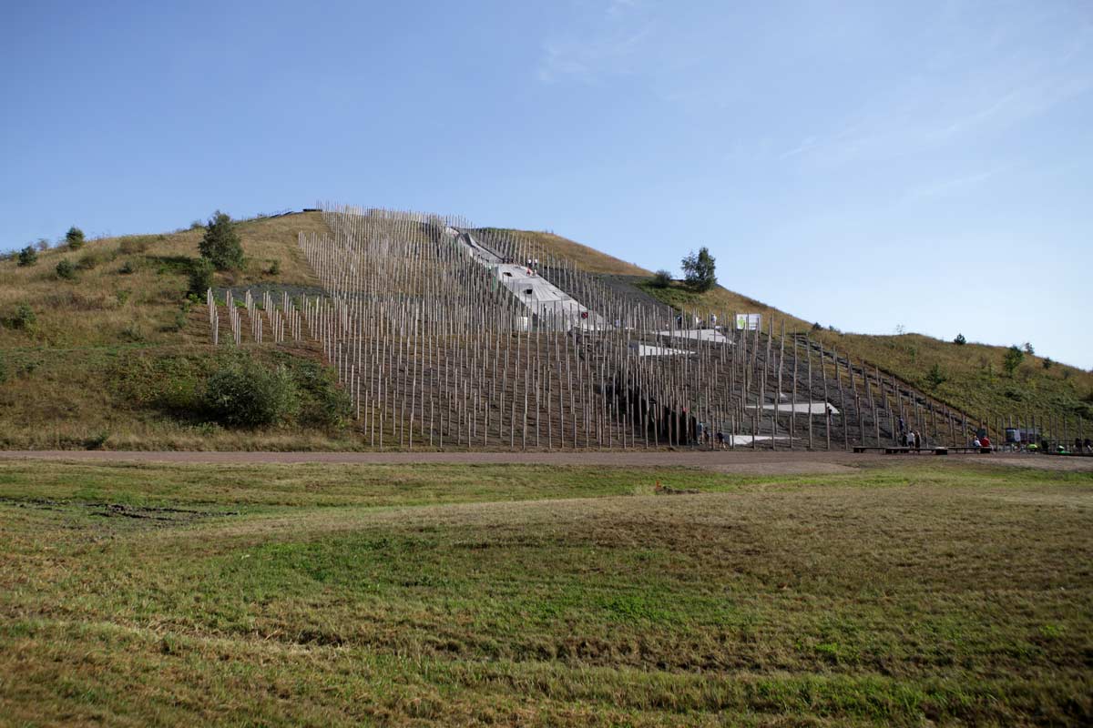 The topography of the landscape has regained structure and is made visible by a pole forest: 1.600 timber poles are anchored in the northern flank of the terril, from top to bottom. The rounded poles refer to the mining past; they were used for supporting the kilometres long underground mining shafts. It is a strong spatial gesture and an intervention that relates to the scale of the hill and the industrial heritage on this location. A part between the poles has been dedicated to an adventurous play course with balancing beams, climbing nets, hammocks, a labyrinth and a rope course. The poles are placed in a grid, which results in an interesting perspective effect: the sightlines create an experience that reminds of the dark mining shafts of the past.