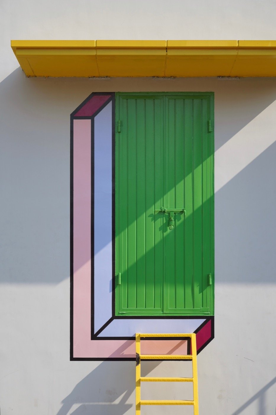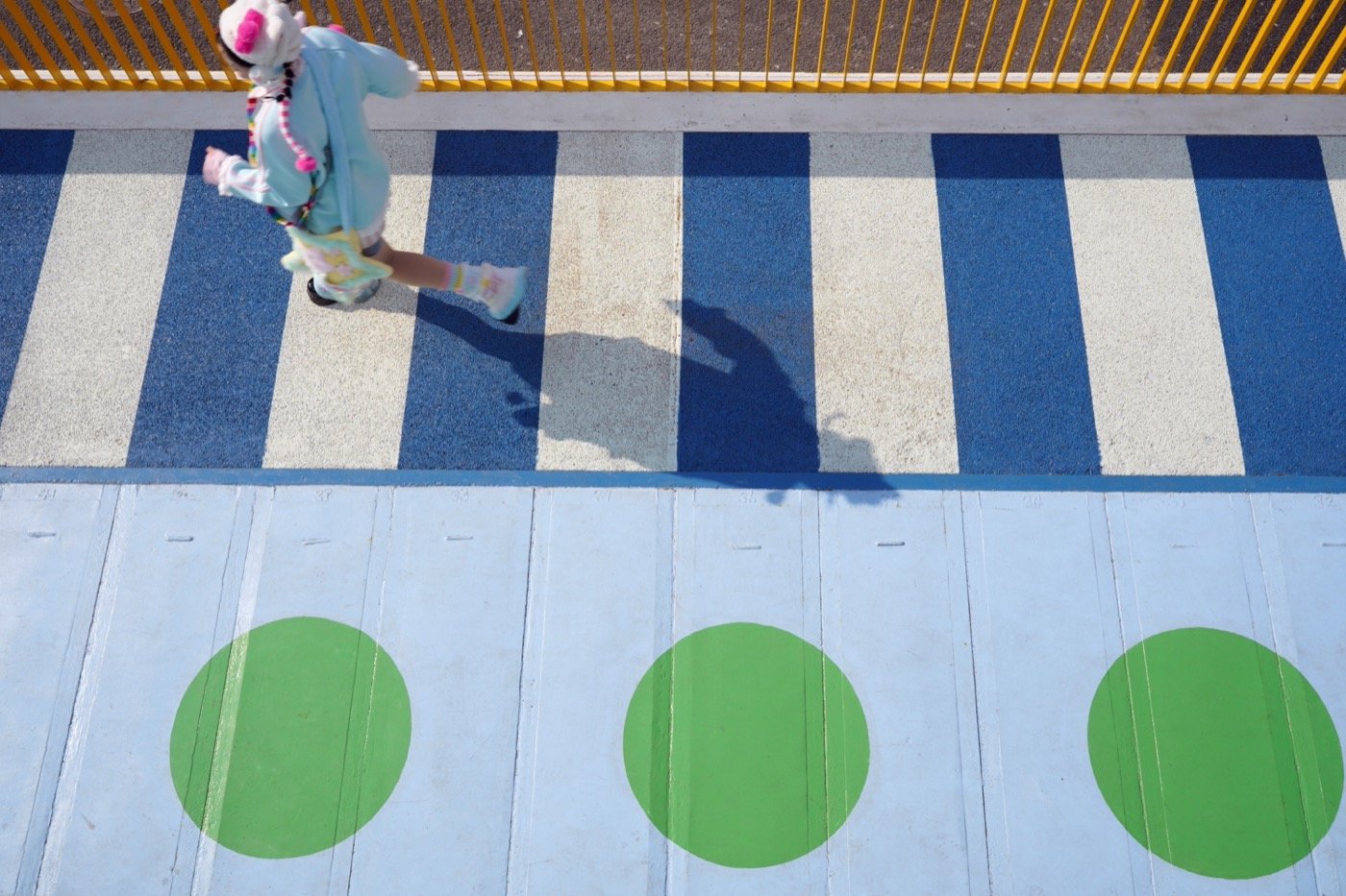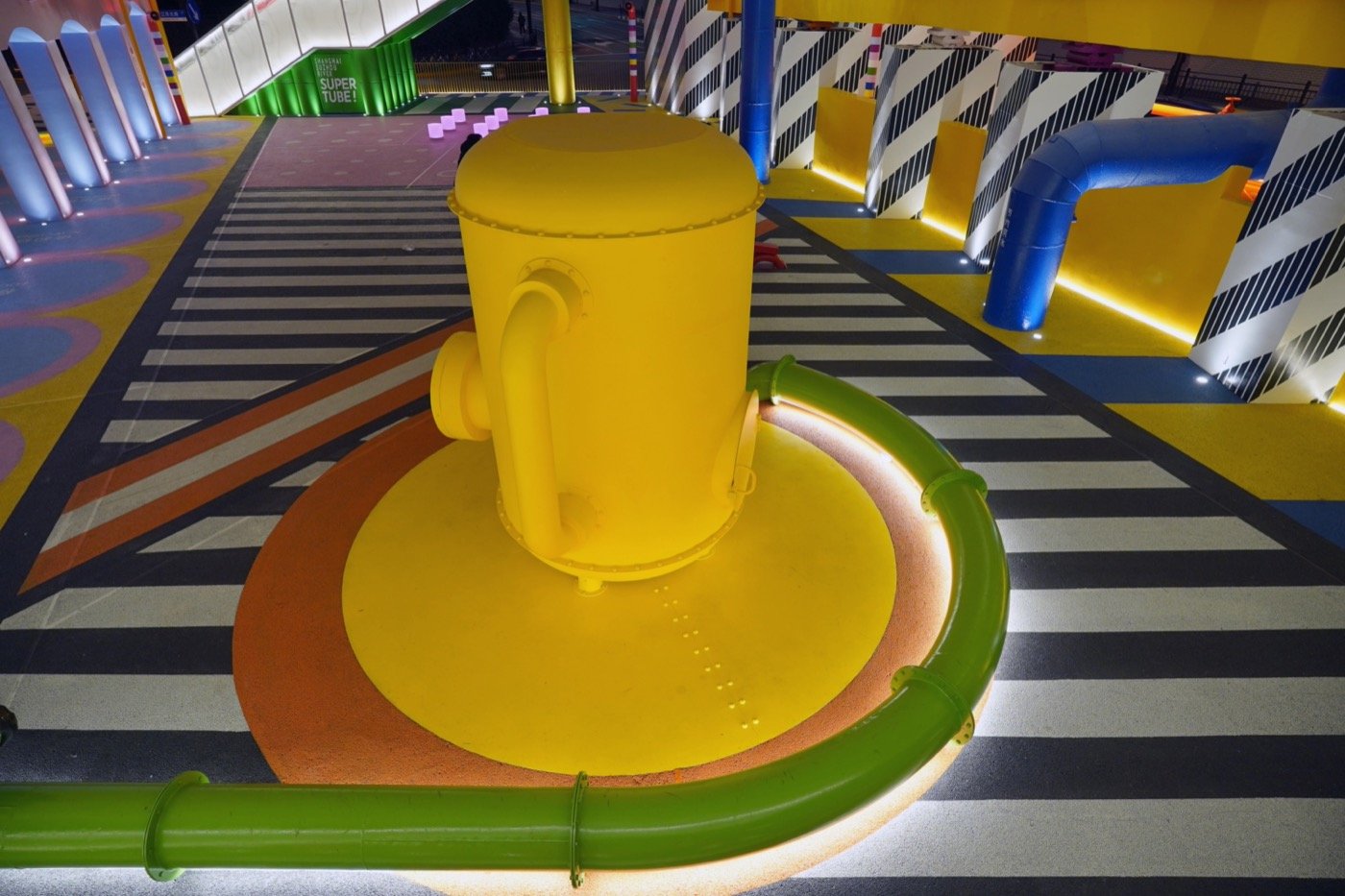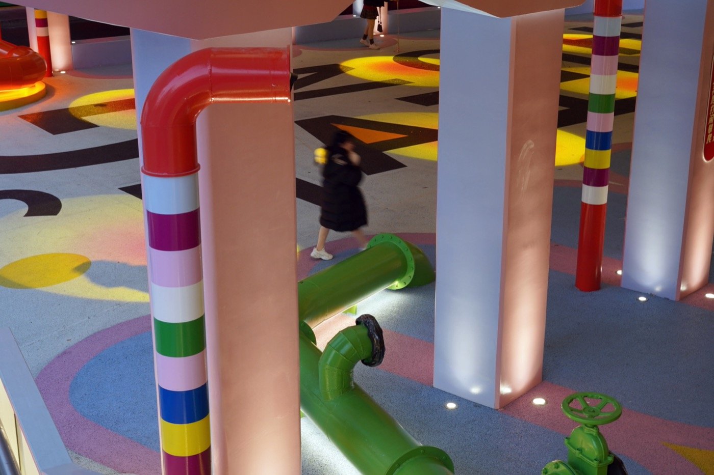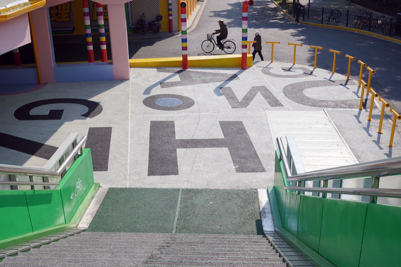 To recreate the imprint of factory life in the communities along the Suzhou River in Shanghai, the design team specially purchased a batch of discarded industrial pipelines and transformed them into safety fences, seats, and surprising small nodes in the site. The space under the bridge was wrapped with curved steel plates, security monitoring was decorated with colored steel pipes, and non motorized vehicle barriers were replaced with yellow cylinders. The element of “pipeline” becomes an ubiquitous design vocabulary in the site, and these elements not only have a sculptural sense and functionality but also pay tribute to the silhouette of Shanghai’s industrial history, such as storage tanks, paint cans, beer barrels, and vacuum tubes. The large-scale seesaw designed with industrial elements and CCTV cameras cleverly wrapped in Christmas-colored sprayed steel pipes have been loved by users of all ages since their opening. Bold color design is a key technique to change the original dim atmosphere of the site under limited conditions. When the design team packaged the pipes with industrial memory symbolism, they used geometric patterns and bright colors. The dramatic artistic effect formed by these patterns pays tribute to the timeless classic “Memphis style”, which represents the attitude of daring imagination, breaking conventions, and fearless optimism that we hope to convey to users through our work. We not only put a lot of effort into colorful graffiti but also combined various texts with graffiti, including Shanghai slang, project logos, ID codes of Changning and Putuo districts, important names of industrial plants, and deliberately preserved factory slogans. The design of the texts also caters to the needs of young people to check in and provides them with space and materials for their photo-sharing activities. The rough industrial pipelines and language graffiti in local dialects also create different effects. The ground of the pedestrian passage has special patterns, which disrupt and rearrange the English words “SHANGHAI”, “SUZHOU RIVER”, and “INDUSTRY” to form creative nodes when imprinted on the ground.