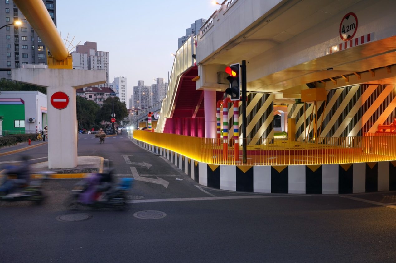 Based on this, the purpose of this transformation is not only to provide convenient transportation for daily travel but also to integrate local cultural atmosphere, achieve the cultural metamorphosis of infrastructure, and create a slow walking space on the banks of the Suzhou River that is friendly for people of all ages. Taking inspiration from a yellow municipal gas pipe that remained on site, the design team used the combination of “pipes” and “colors” as a clever way to break through the problem. The former is a representative element of the industrial history along the Suzhou River and even in modern Shanghai, while the latter is the best choice to change the shady and gloomy atmosphere of the space under the bridge.