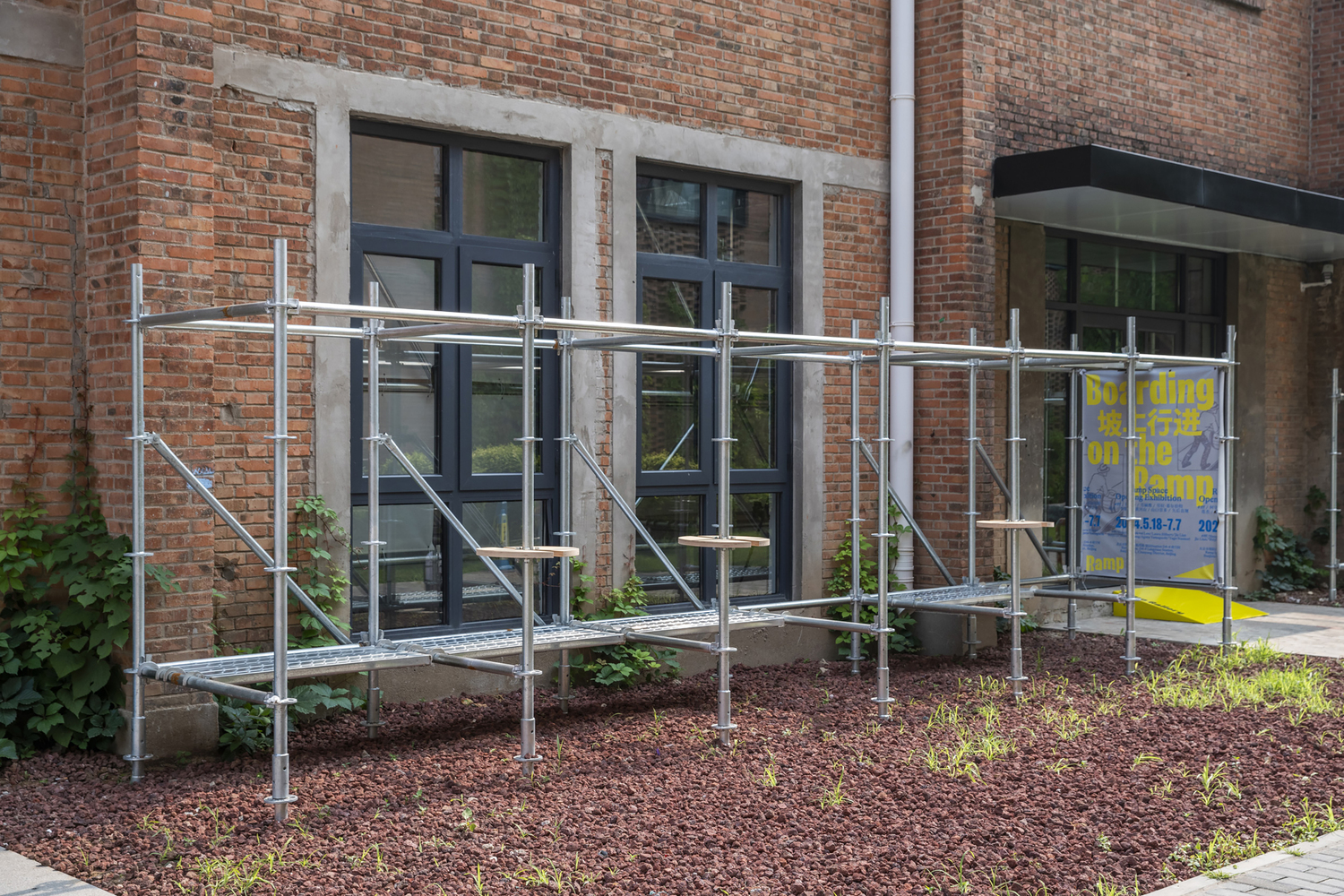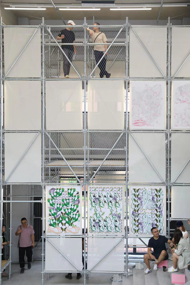 We chose scaffolding to fashion the shape of a significant section of the hall. Unlike permanent, “reassuring” concrete, scaffolding is the most temporary element in architecture. Scaffolding framework is omnipresent and vitally important in all construction processes, but after the building is completed, it usually “vanishes into thin air”. We believe scaffolding conveys a sense of freedom, making the entire space full of possibilities. Its precarious quality subliminally encourages visitors to play with it, something we look forward to. We think this also echoes customers’ expectations for a free, lively place. The scaffolding also functionally divides the exhibition space into entrances, passages, bars and other spaces, creating a path for ascending and wandering through the exhibition space, just like through a thicket surrounding a hilltop.