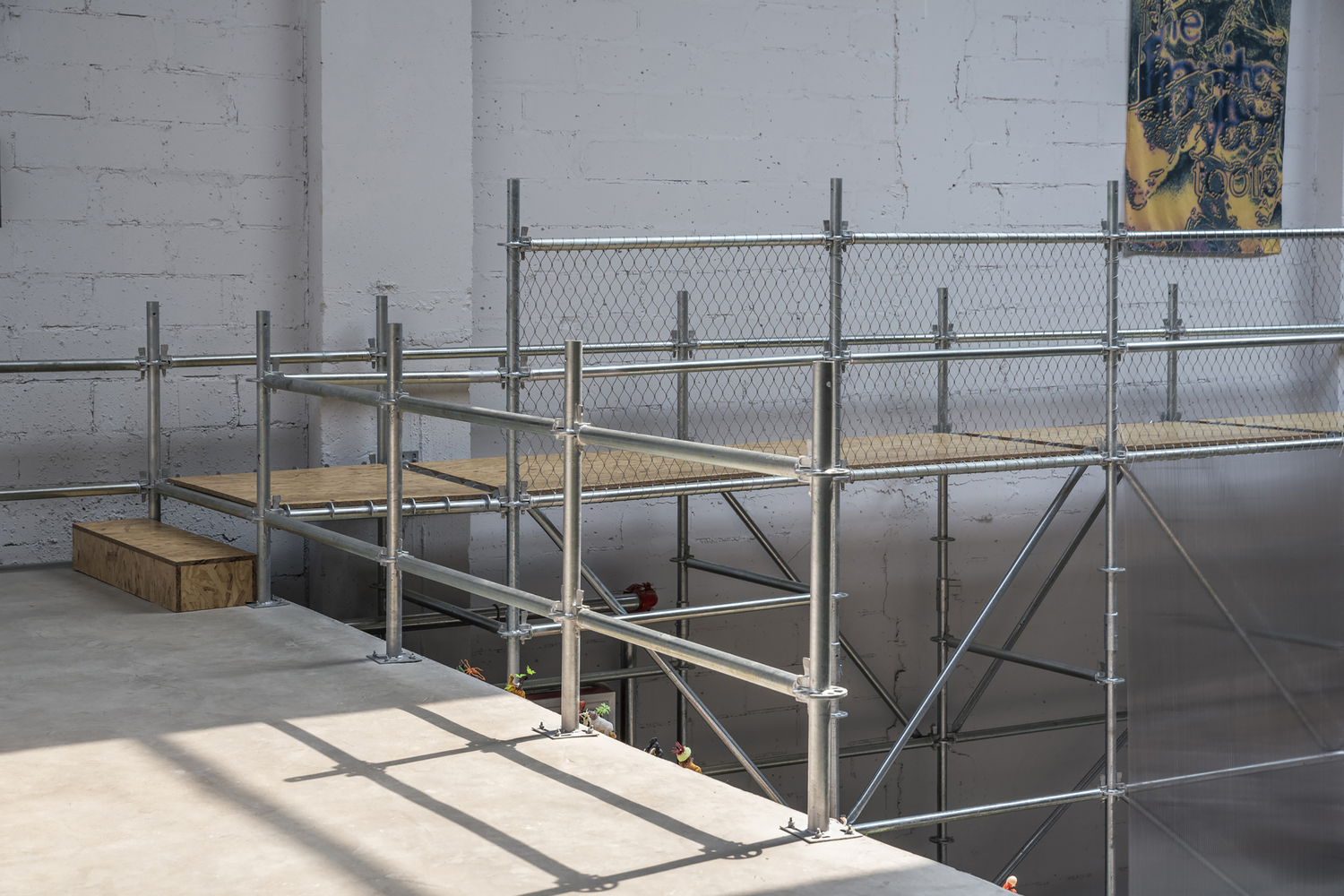 비계 구조는 전시 공간을 입구, 통로, 바 등으로 유연하게 나눕니다.