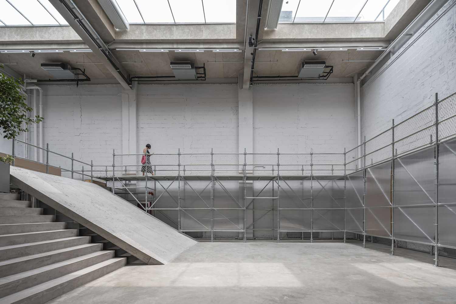 We maintained the original 9-meter high ceiling unaltered, while adding a slope on the ground. The slope rises directly on the floor, interrupting the original balance of stability and solidity offered by the ground. Thanks to the addition of the slope, we discreetly hid office, storage and other service spaces underneath it. We left a narrow fissure on the slope to reveal its actual structure, so that visitors may see that this bulging structure is indeed a board instead what would appear to be a sturdy block of concrete. This gap also serves as a line of connection between the exhibition hall and the backstage. We designed part of the slope as flight of steps, hoping to infuse the building with a vibrant humanistic touch, reminiscent of ancient theaters or lecture halls.