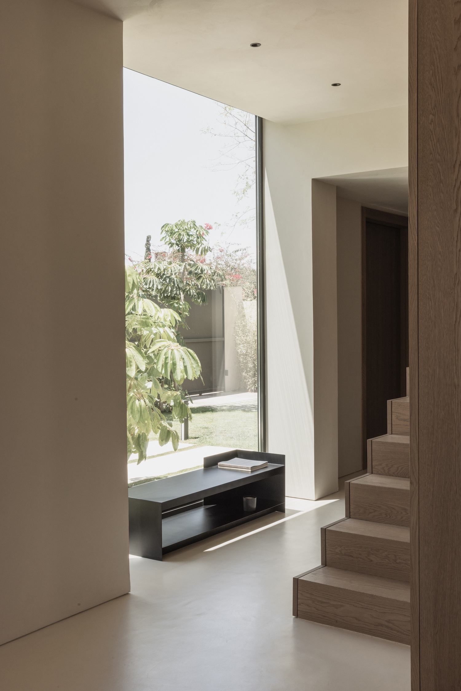 Ene House is a minimal residence located in Alicante, Spain, designed by Francesc Rifé Studio. The T shaped main structure is complemented by a porch and an anodized aluminum volume functioning as a garage, enhancing the efficiency of the design. On the ground floor, the living room, kitchen, and terrace form a seamless, fluid space connecting the interior to the exterior. Smoked oak wood storage units clad the lower part of the house and integrate the staircase, adding a cohesive element to the design. The first floor features two terraces at opposite ends, serving as skylights to ensure a continuous flow of natural light.