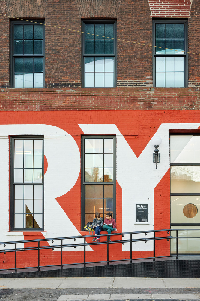 Outside, the entrance is demarcated by a super graphic sign reading “LIBRARY.” This sign was approved by the Landmarks Commission which noted its creative use of the precedent set by historic painted signs in the neighborhood. Visible from across the East River, it gives a clear identity and invitation to this vital public amenity.