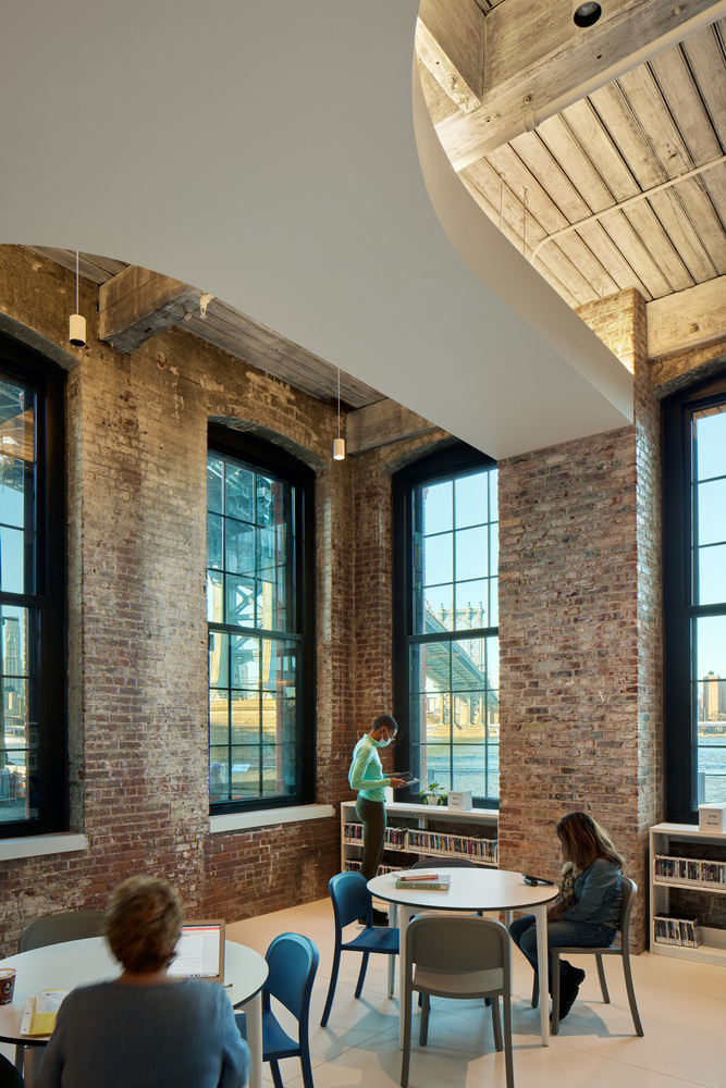 도서관 내부는 기존 벽돌 외벽을 노출시켜 역사적 가치를 강조했으며, 현대적인 디자인 요소로 공간을 채웠습니다. 15피트 높이의 창문은 이스트 강과 맨해튼 스카이라인의 전망을 제공하며, 자연광을 통해 내부 공간이 밝고 생동감 있게 연출되었습니다. 외부의 대형 그래픽 'LIBRARY'는 멀리서도 도서관의 존재감을 드러내며, 지역 사회에 이 도서관이 중요한 문화적 중심지임을 상기시킵니다.