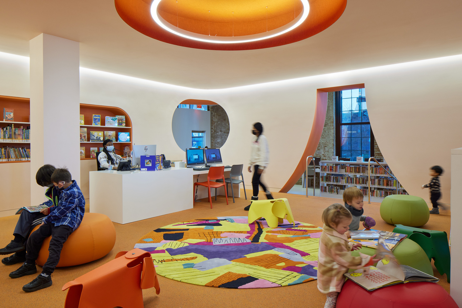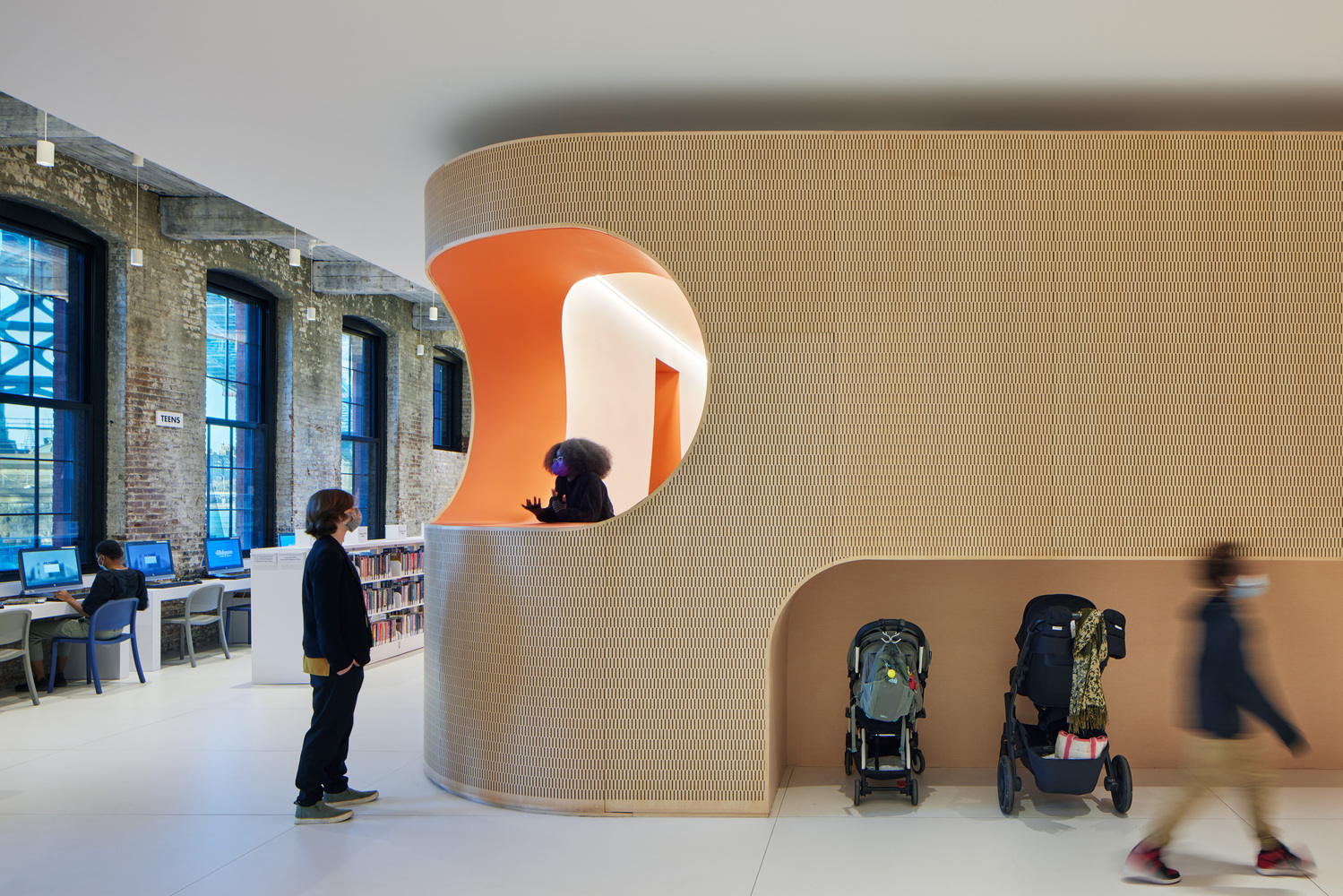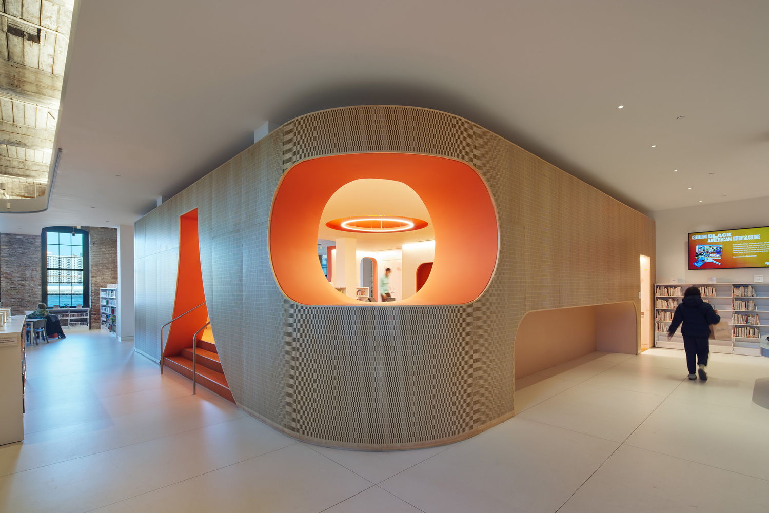 Surrounded by 15 foot windows, the library is designed as a series of open spaces around a porous pavilion that houses an elevated children’s area, allowing kids to see out over the main reading room toward the Manhattan skyline, the East River, and the park. Clad in a maple-veneered MDF that is CNC-milled with a custom pattern, the pavilion combines programmed niches for stroller parking and book storage with large curvaceous openings. The interior is clad in cheerful orange hues and contains a space for story time and steps to sit and play on.