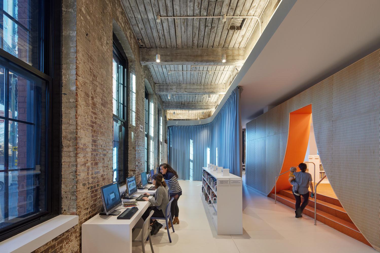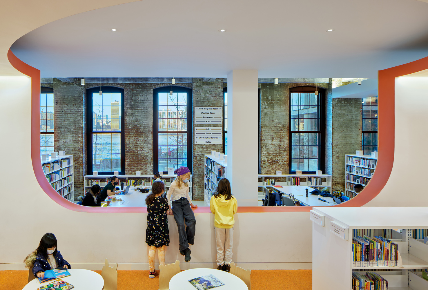 내부는 어린이와 청소년을 위한 밝고 활기찬 공간으로 구성되었으며, 외부는 기존 산업 건물의 벽돌 질감을 그대로 살려 디자인되었습니다. 내부의 곡선형 출입구와 아치형 계단은 공간의 중심을 이루며, 대형 창문을 통해 이스트 강과 맨해튼 스카이라인의 전망을 제공합니다. 외부에는 대형 그래픽 ‘LIBRARY’가 그려져 있어, 멀리서도 쉽게 눈에 띕니다.
