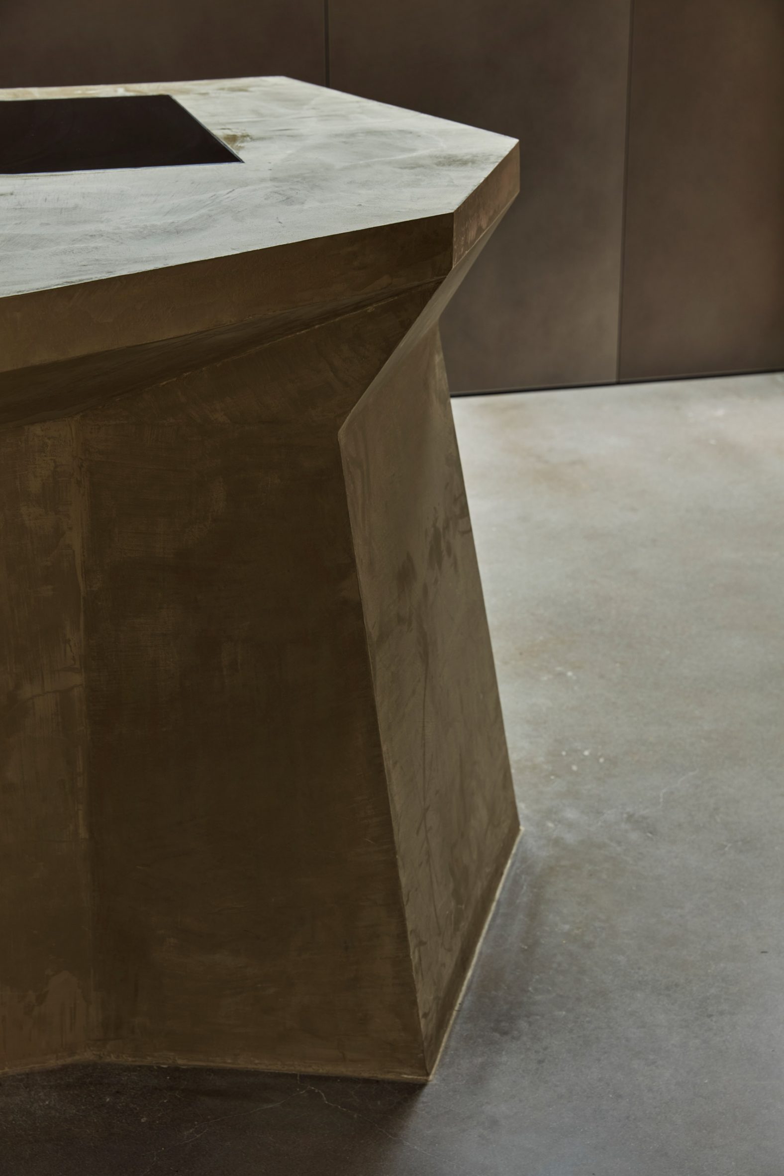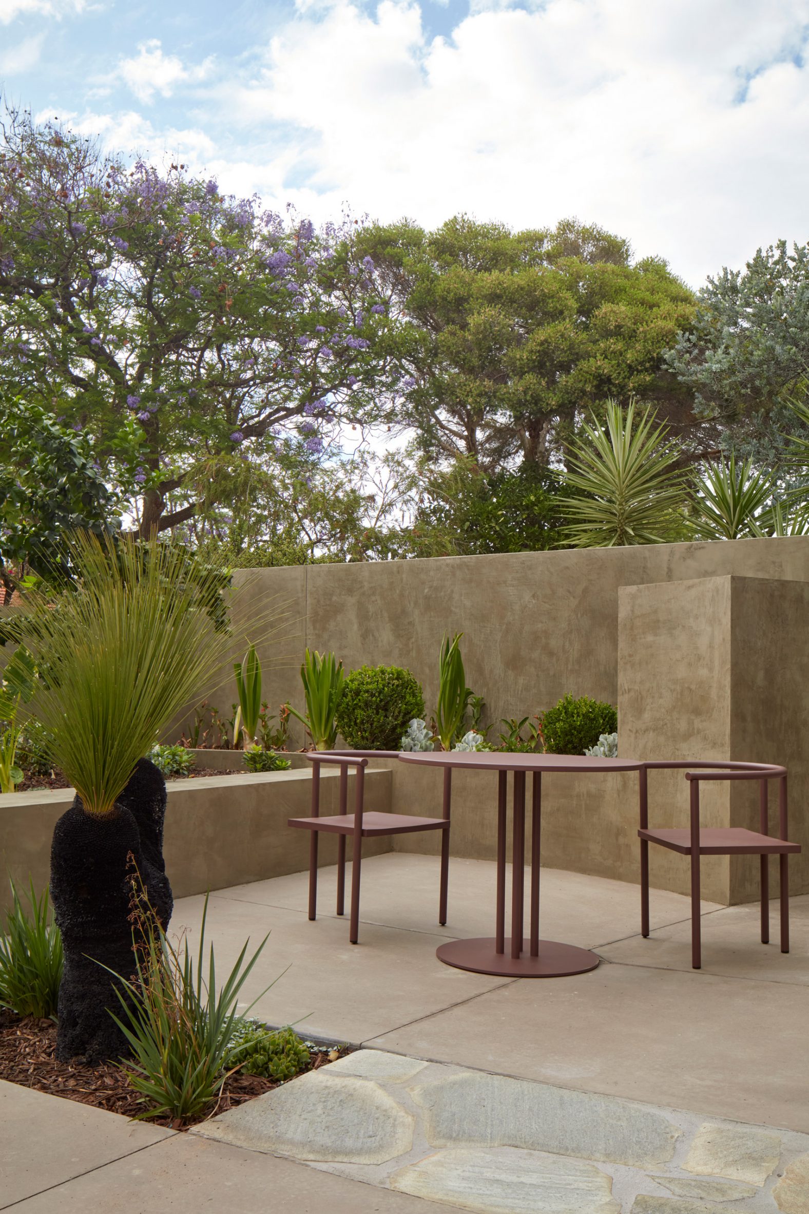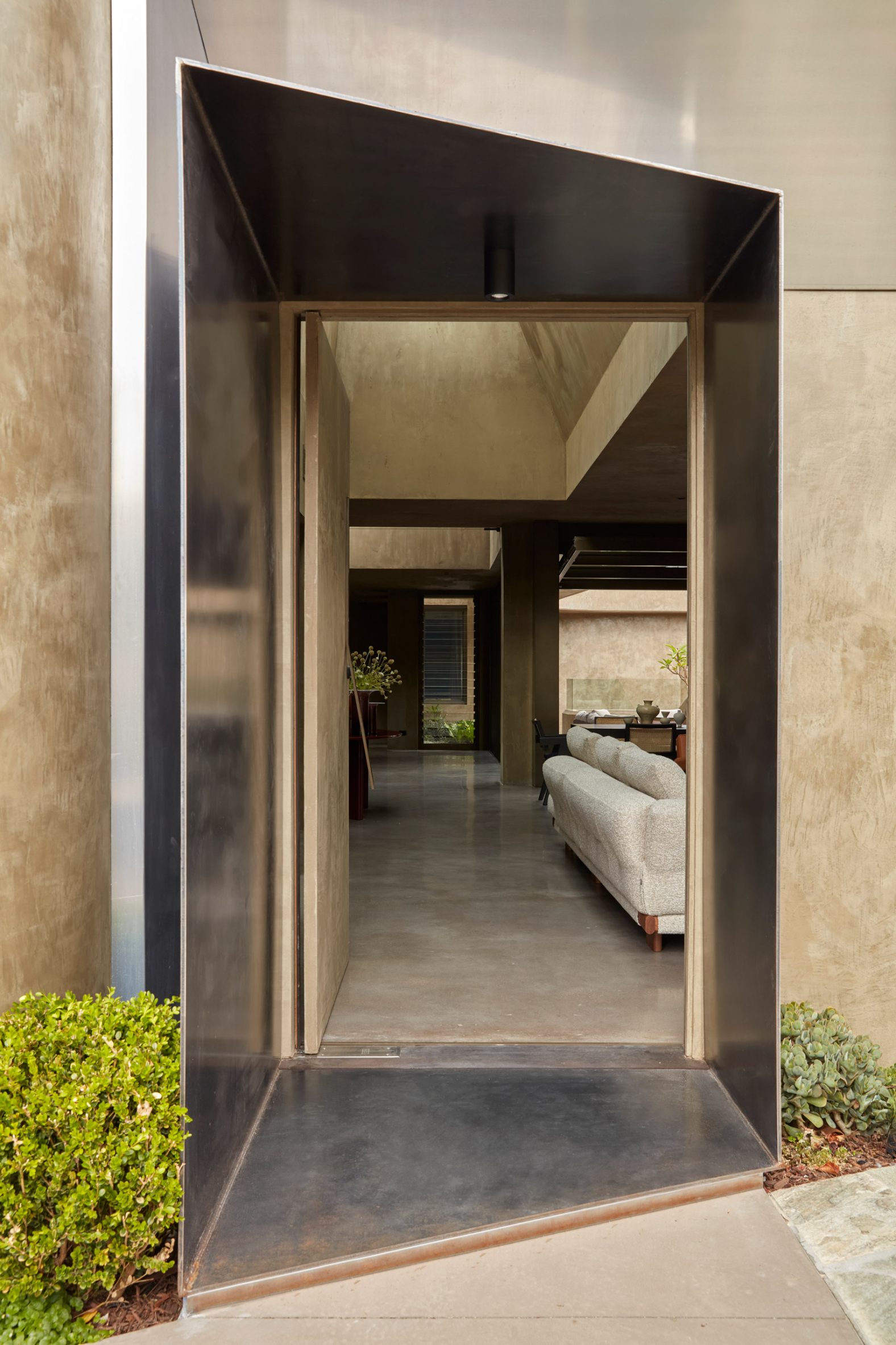 외부 공간: 조형적인 콘크리트 형태와 헴프 렌더의 부드러운 질감이 돋보입니다.