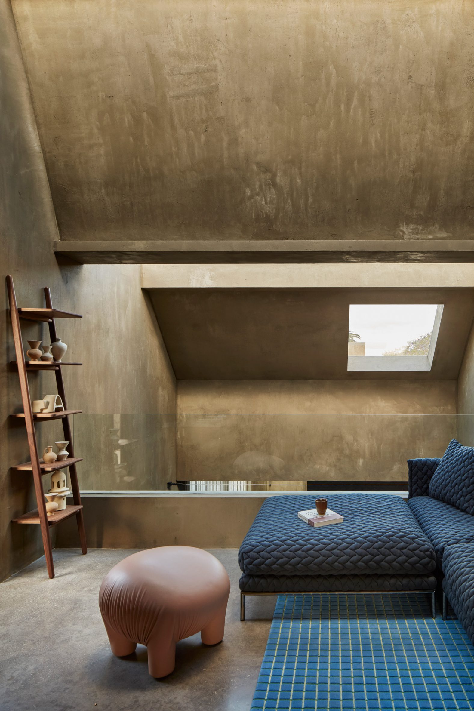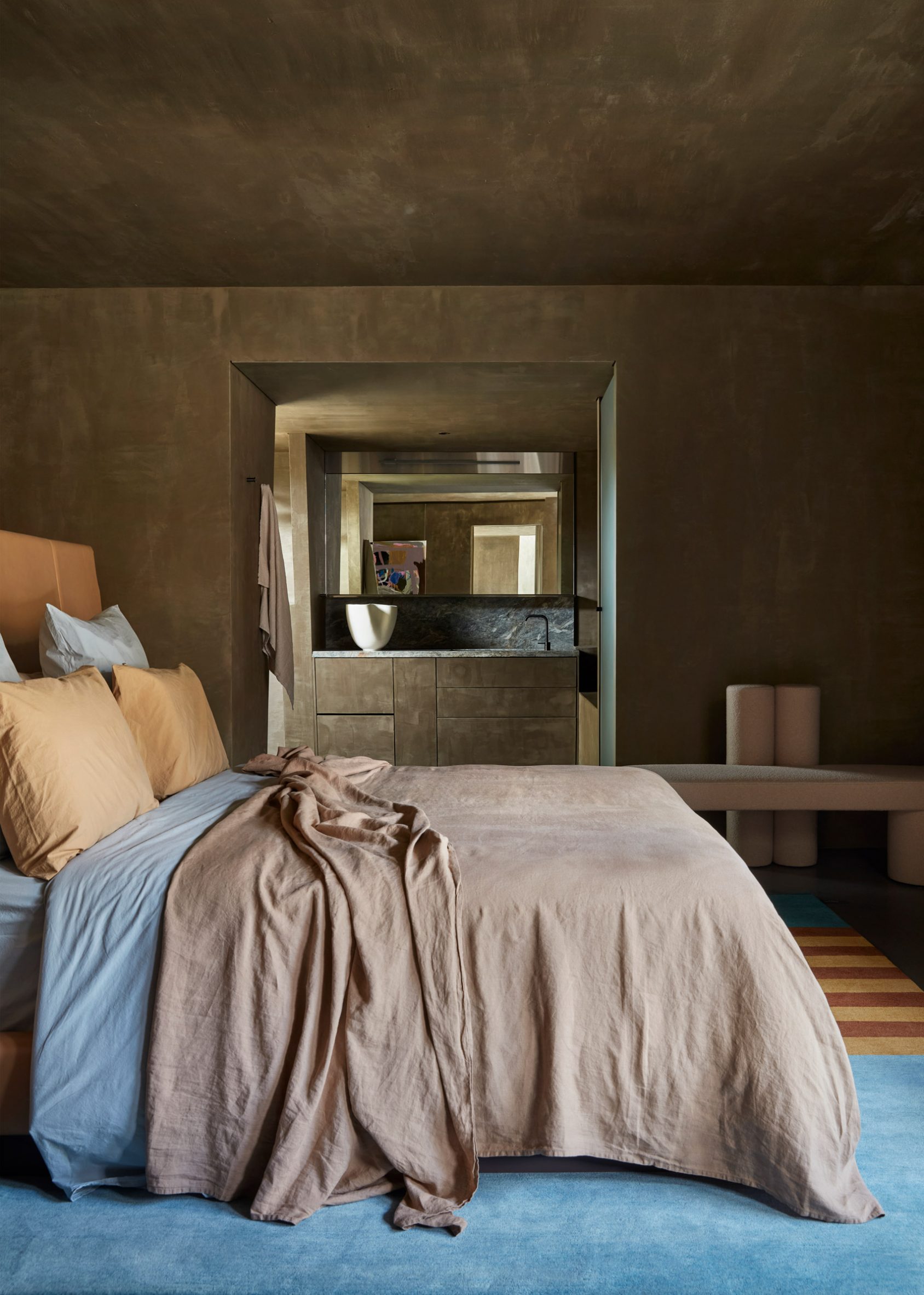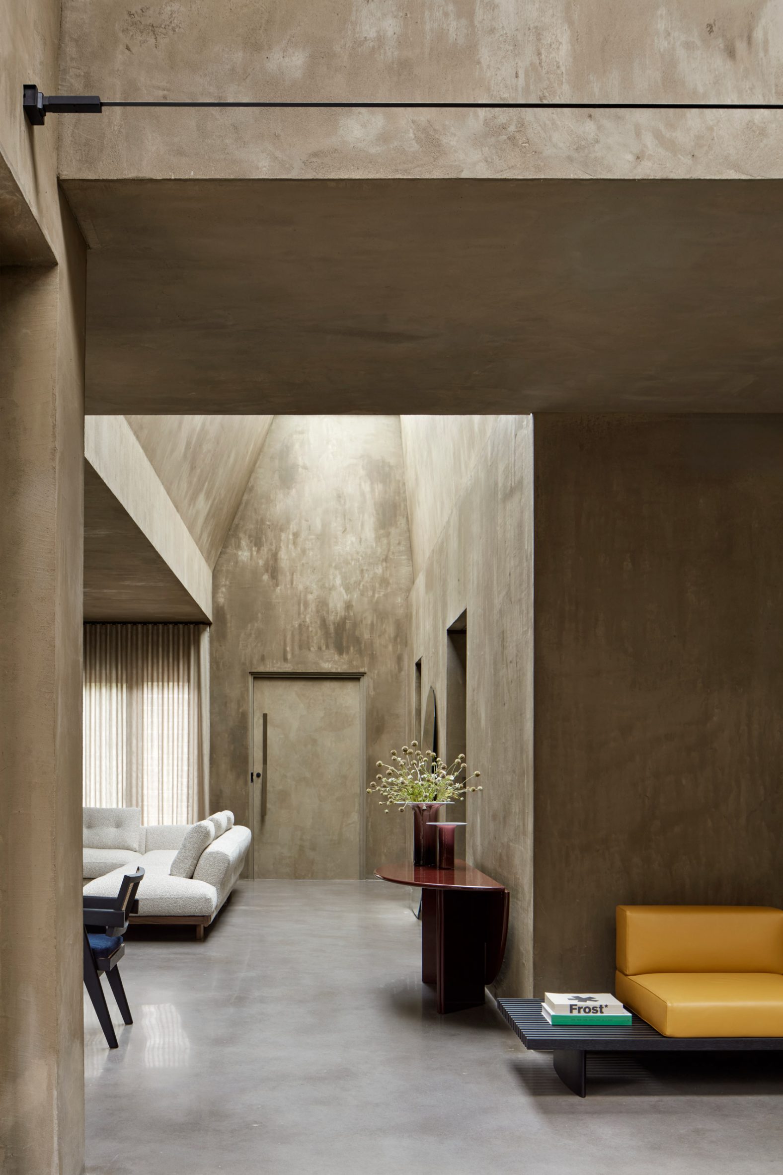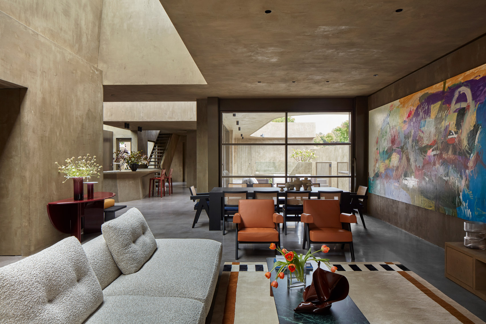 A minimalist material palette of hemp render, aluminium accents and polished concrete runs throughout, teamed with colourful furniture, artwork and fittings including works by designers Gerrit Thomas Rietveld, Charlotte Perriand and Joris Poggioli.