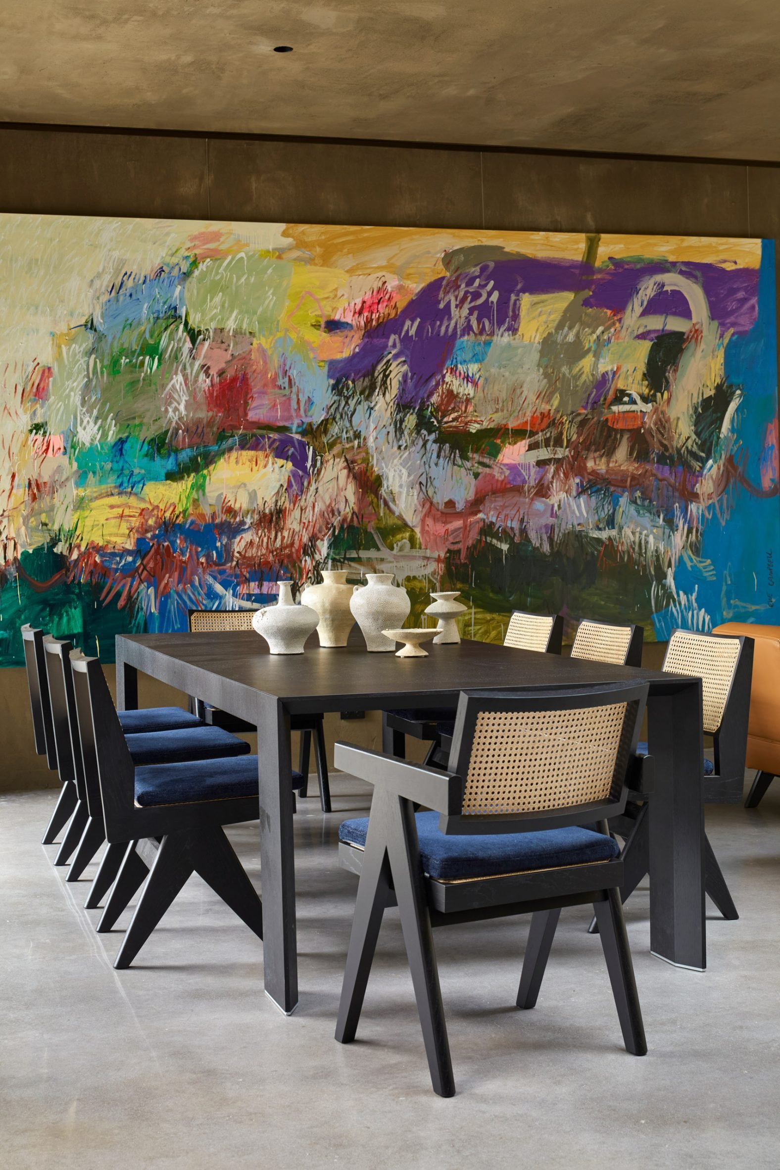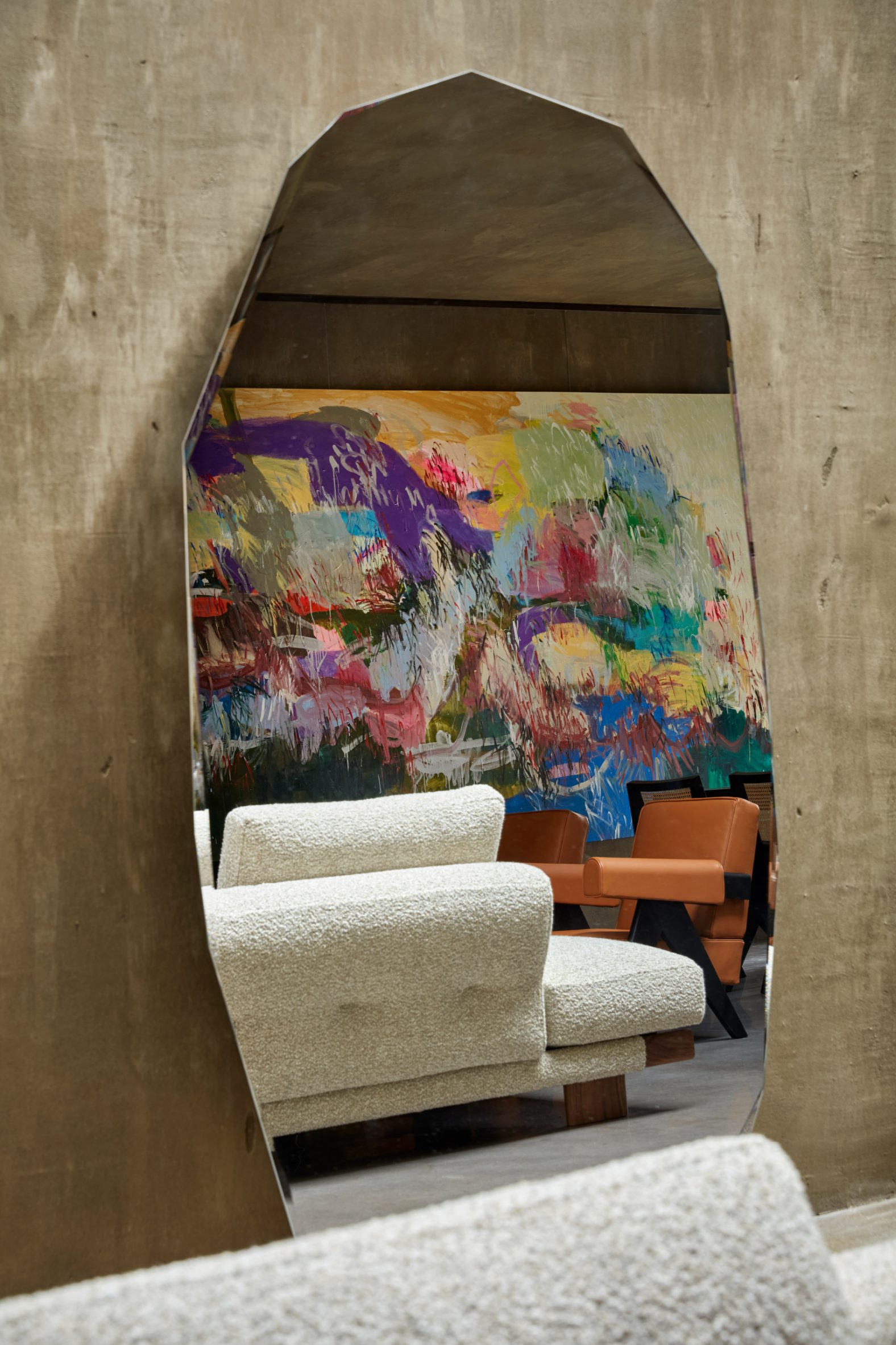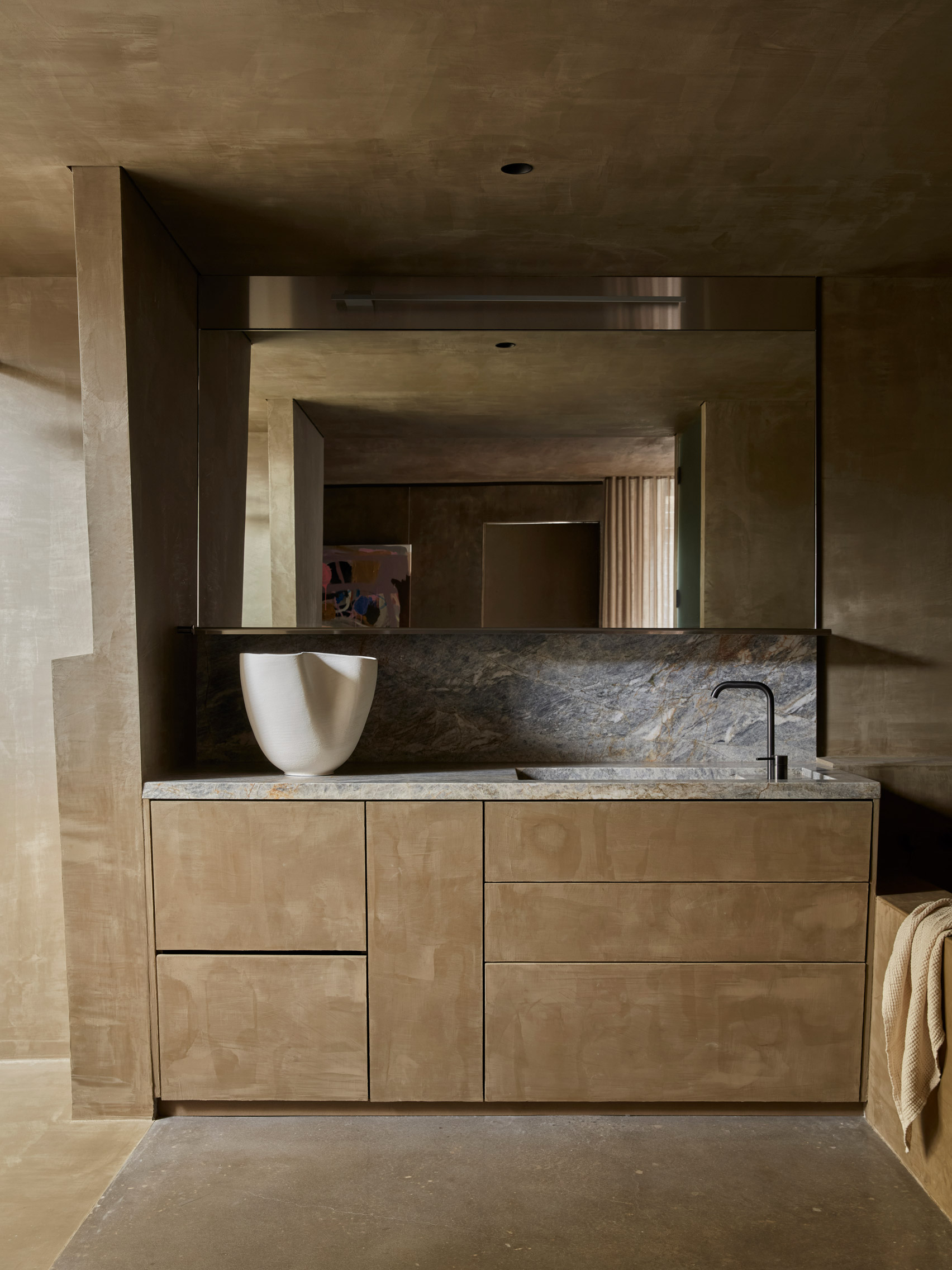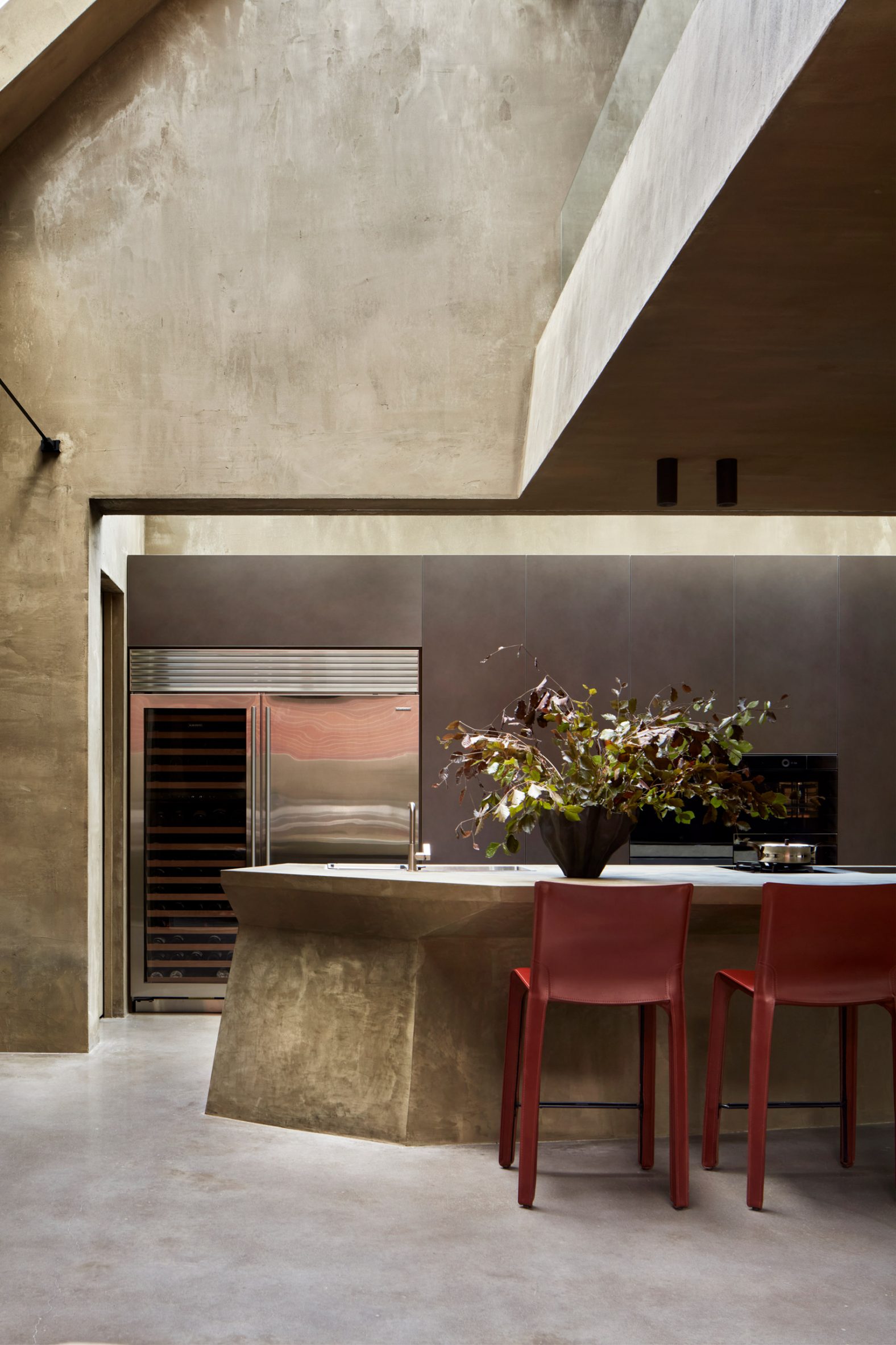 A minimalist material palette of hemp render, aluminium accents and polished concrete runs throughout, teamed with colourful furniture, artwork and fittings including works by designers Gerrit Thomas Rietveld, Charlotte Perriand and Joris Poggioli.