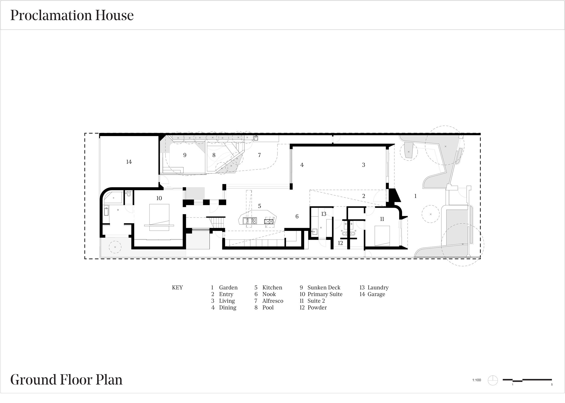 Proclamation House는 전통적인 서호주 코티지 스타일을 현대적으로 재해석한 주택입니다. 헴프 렌더와 조형적인 콘크리트 구조가 결합된 외관은 주변 환경과 조화를 이루며, 중앙 안뜰이 공간을 시각적으로 분할하고 자연 요소를 적극적으로 도입했습니다.