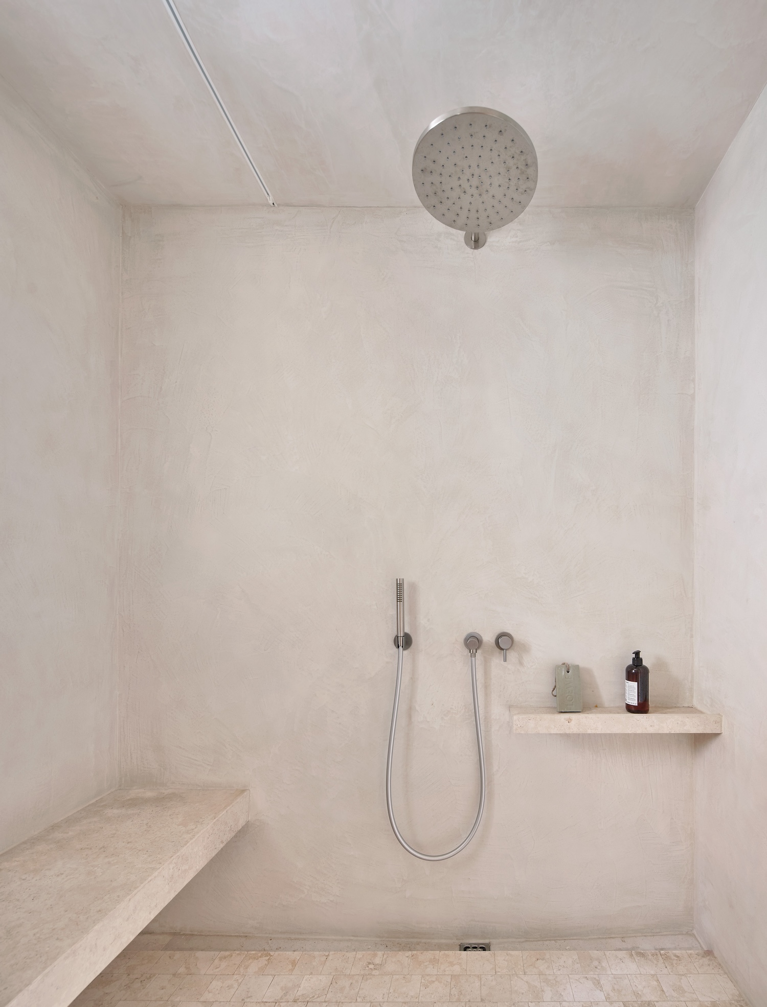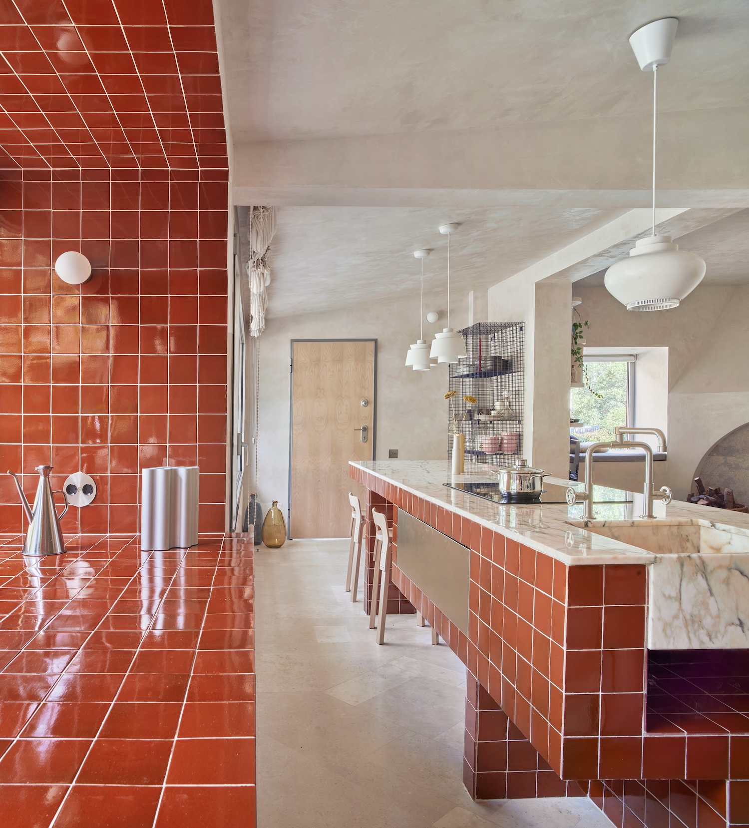The windows were transformed into deep frames that capture the surrounding views, establishing a distinctive feature along with the kitchen island a multifunctional centerpiece for cooking, dining, and working. To unify these elements, the window frames and the large kitchen island are adorned with handmade burgundy tiles. Complementing these, the campaspero stone floors and waxed tinted plaster walls provide a subtle contrast, enriching the overall aesthetic with their textured and polished surfaces.