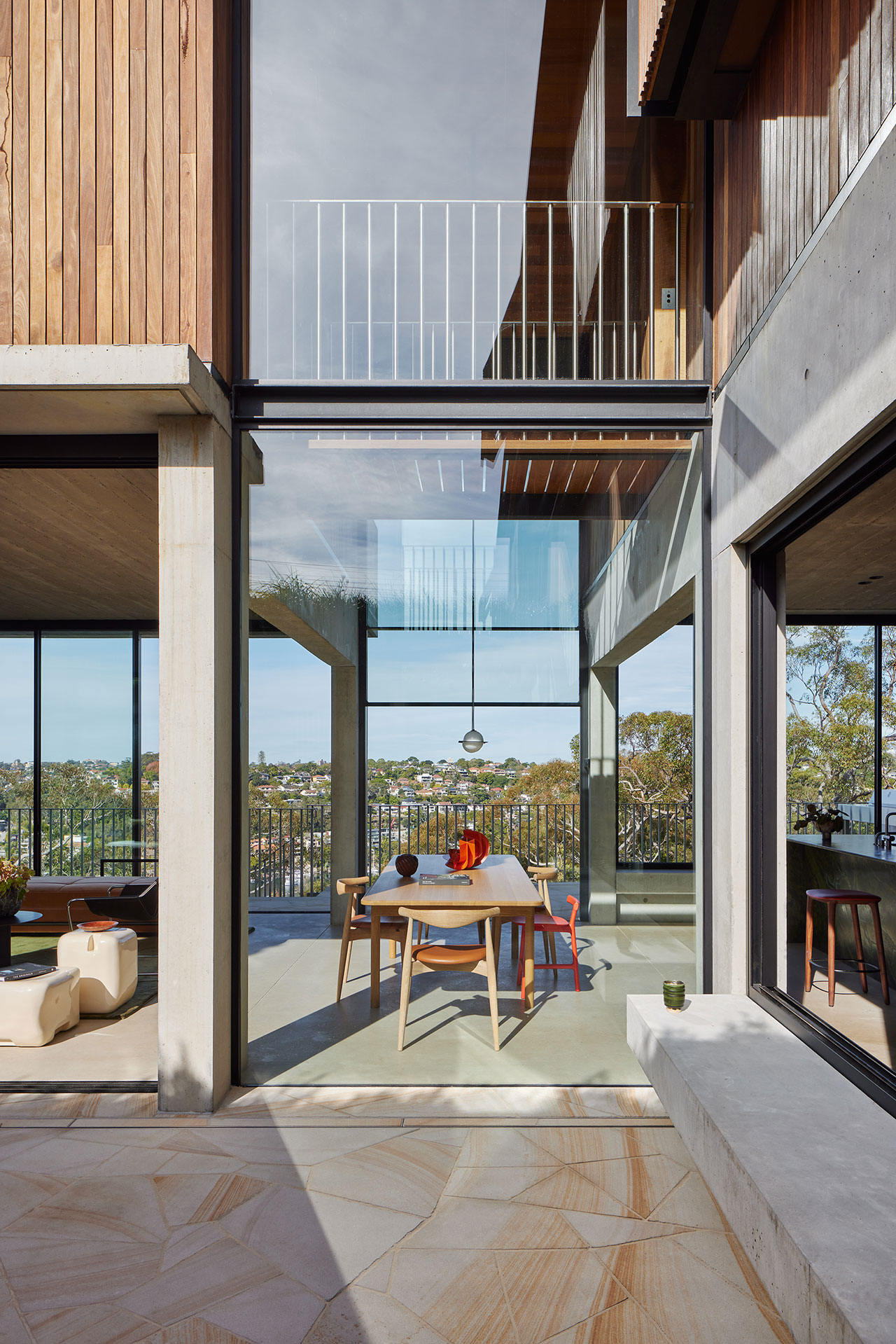 From the outset, the landscape was viewed as integral to the house's design. So working with Emily Simpson Landscape Architecture, the team looked at creating numerous opportunities for the landscape to envelop the building, interweaving a series of courtyards, patios and terraces into the layout thereby blurring the boundaries between the interior and exterior. Large windows further underpinning the sense of openness and lightness made their way into the design in order to take advantage of the panoramic views of Middle Harbour, courtesy of the steep terrain which slopes southwardly towards the sea. Strategically placed windows and numerous skylights were then introduced to ensure for ample natural light and ventilation in the bedrooms upstairs.