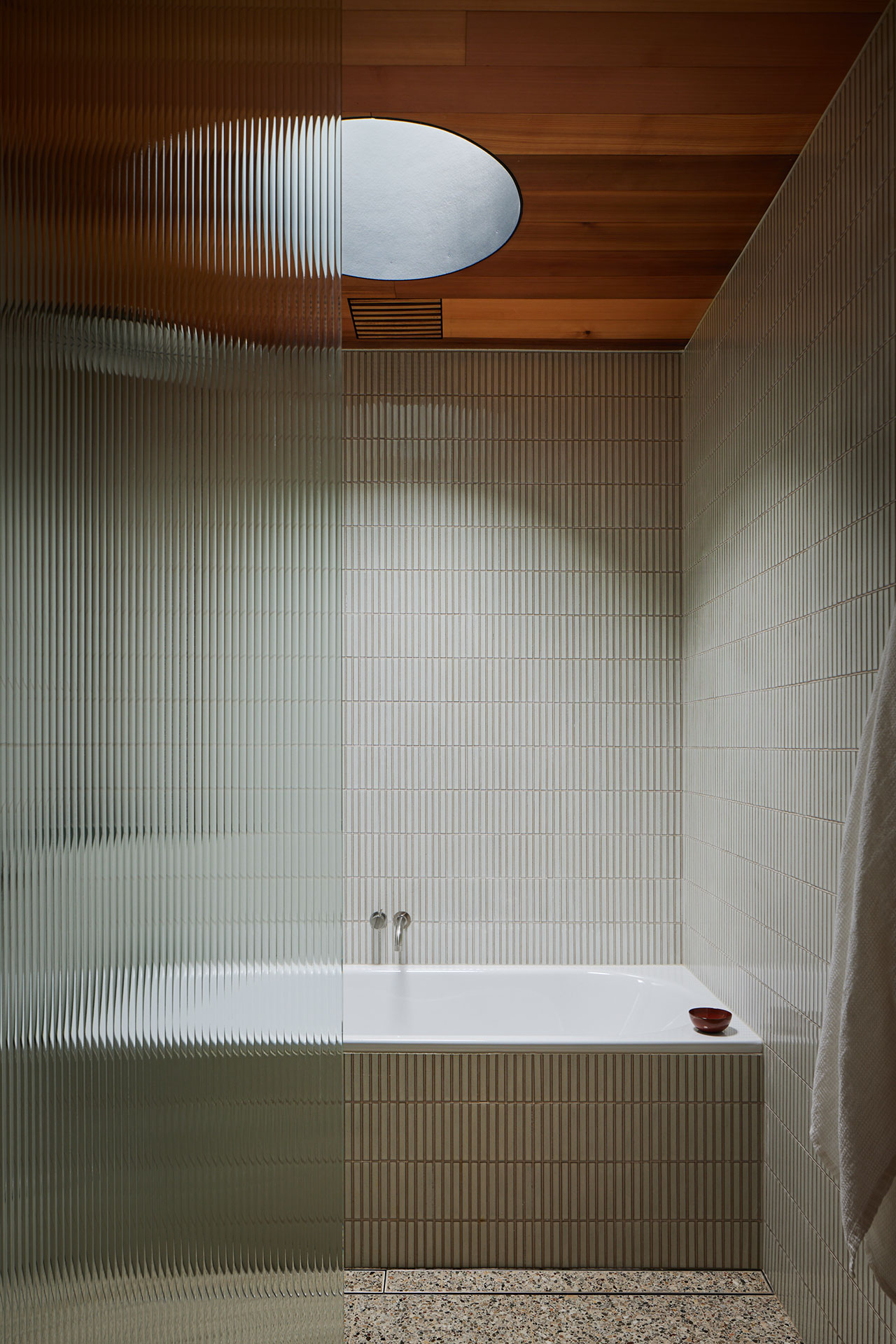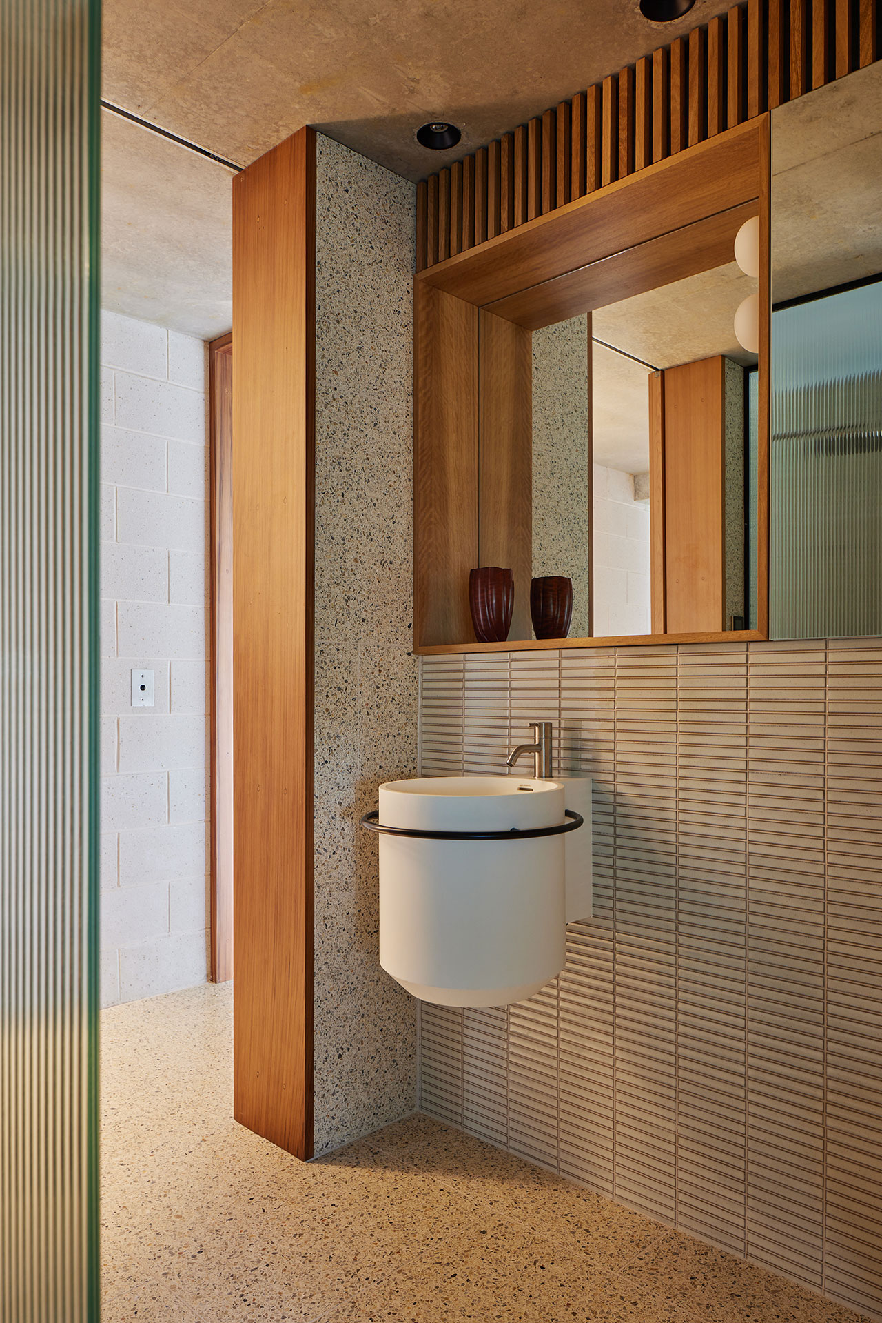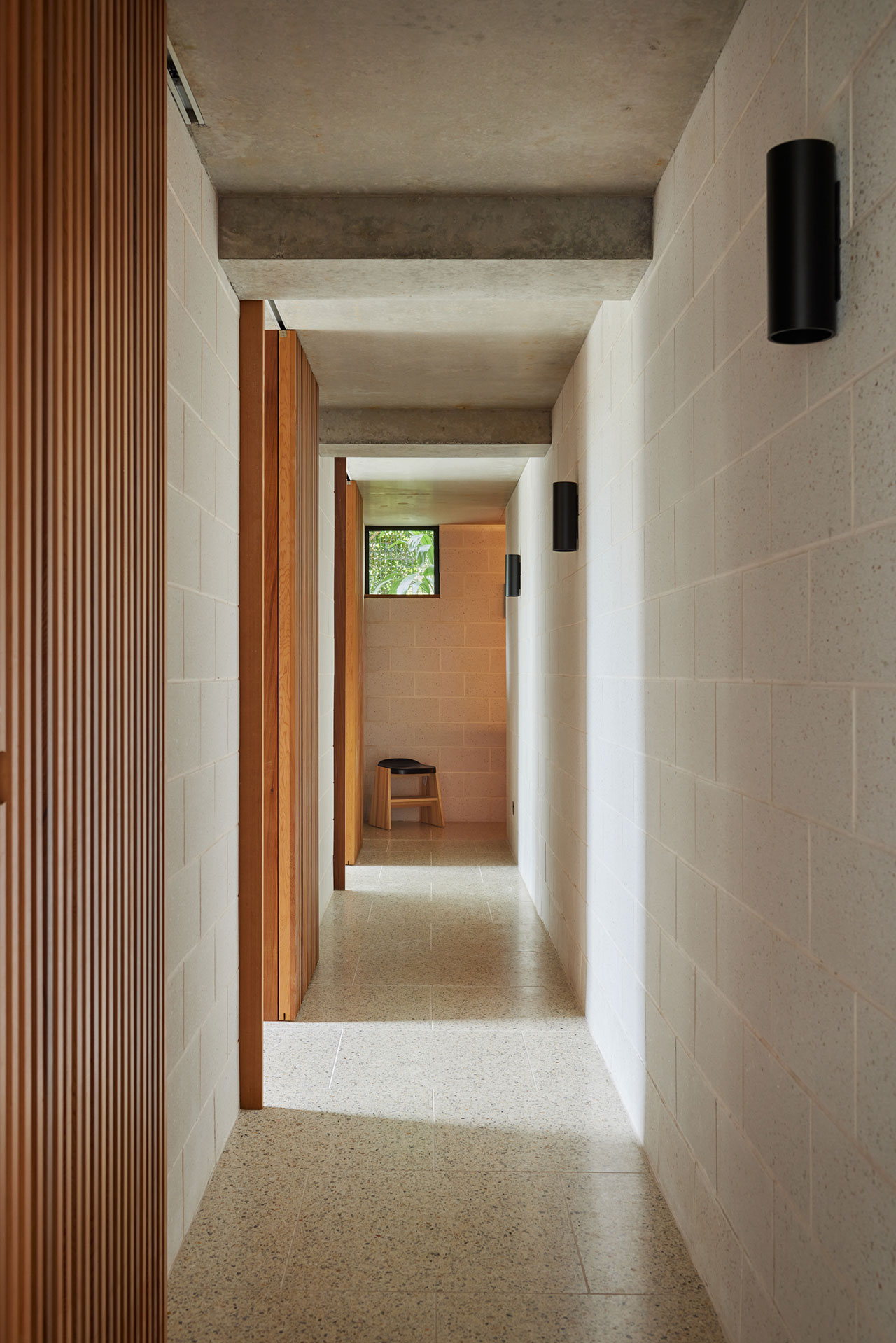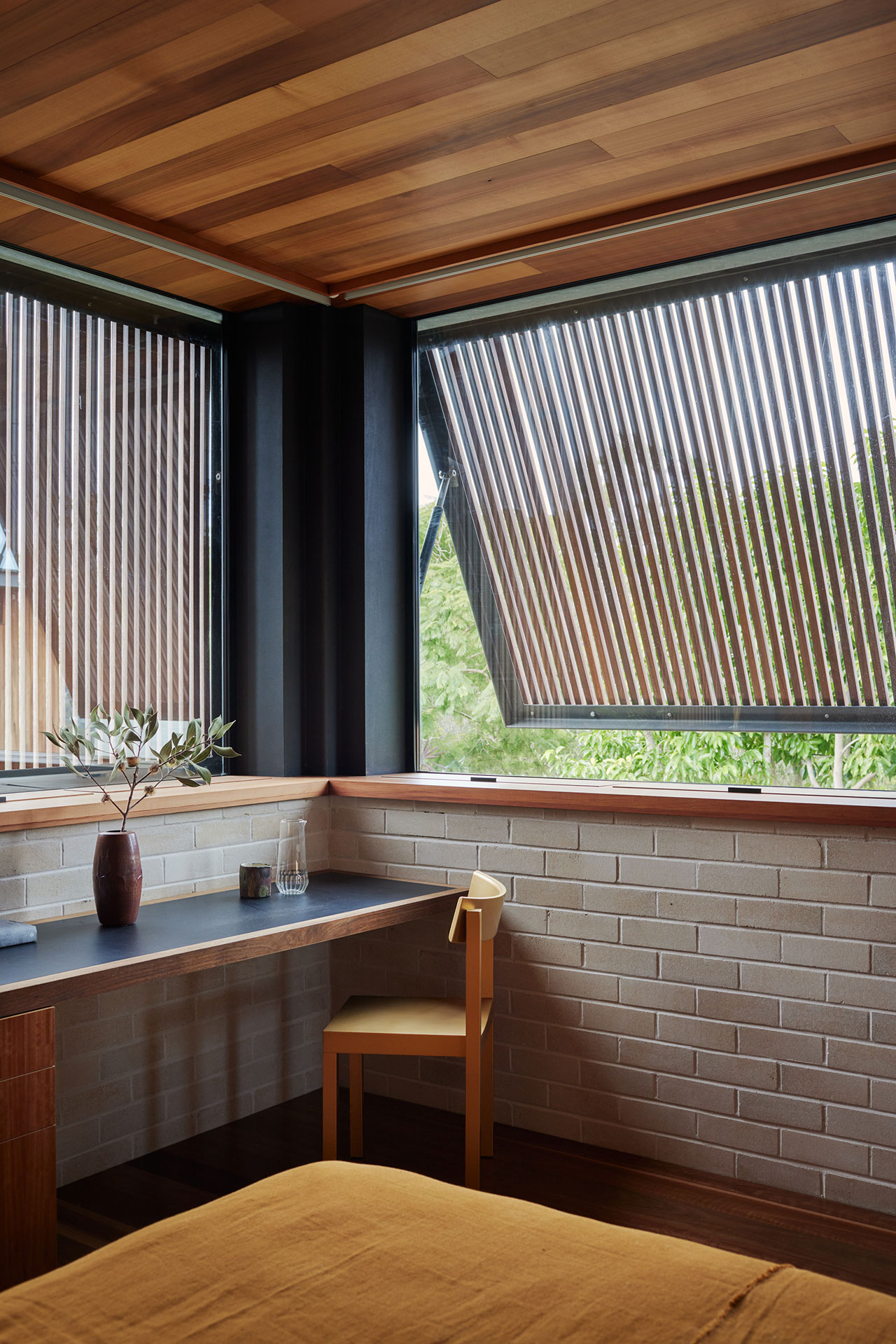On the upper level, timber takes on a more prominent role in the design of the family’s private quarters with spotted gum boards in the floors and ceilings, chestnut cabinets and louvred window shutters which are mechanically controlled to adjust natural light and ventilation. White painted brickwork balances the wood tones, framed views of the verdant surroundings add depth while expansive glazing dissolves the master bedroom into the landscape. In the basement, honed concrete blocks are paired with terrazzo flooring, cedar batten doors and polished plaster walls, enhancing the sense of refuge and grounding