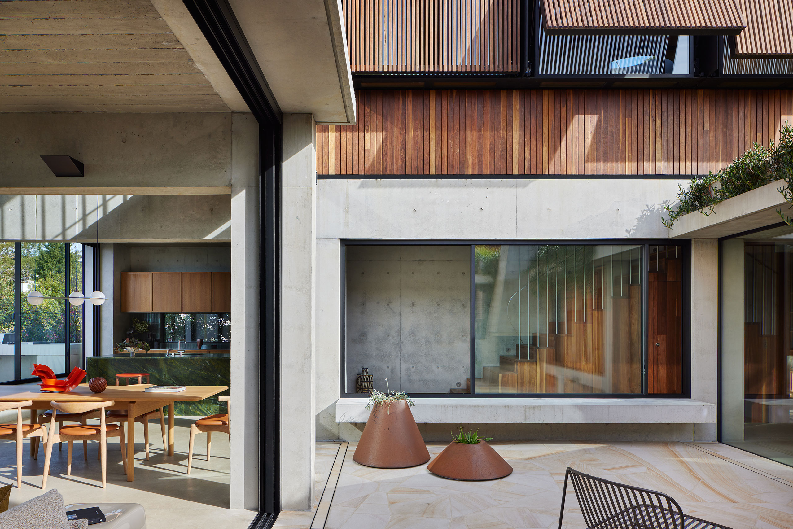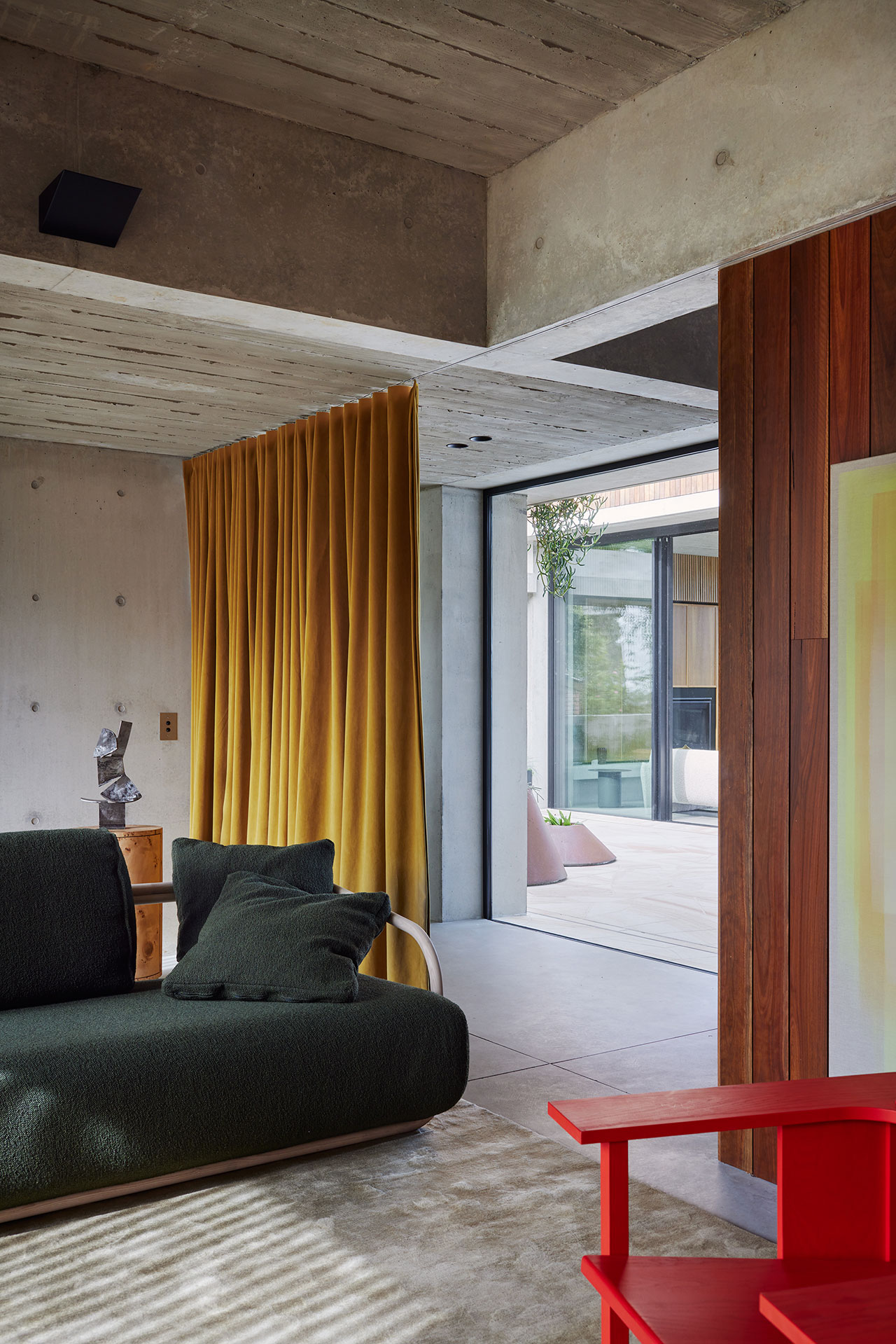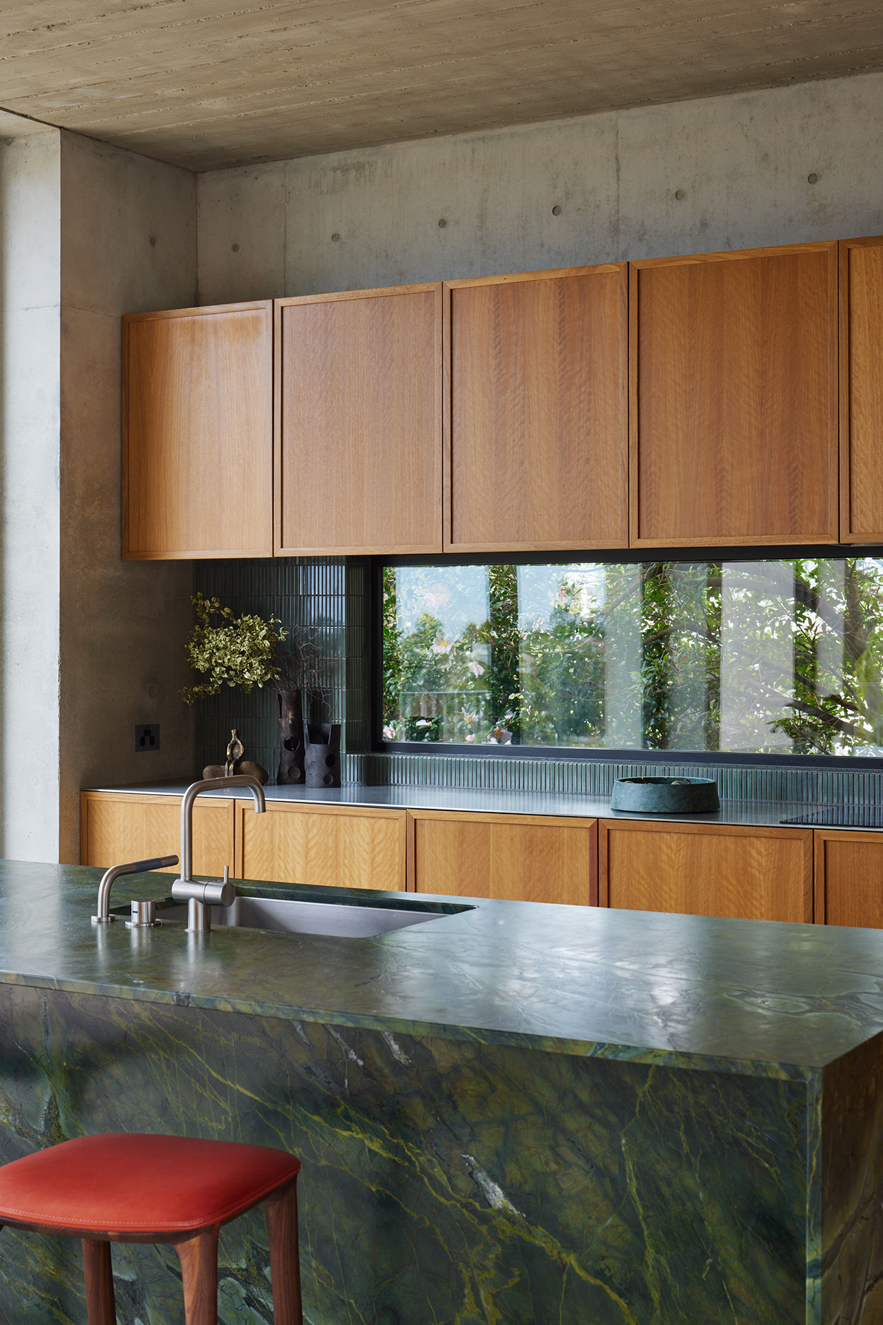 Materials were chosen for their inherent beauty, tactile quality and durability. On the ground floor, the social spaces feature burnished concrete flooring, off-form concrete walls and board form concrete ceilings. Enveloped in concrete, these spaces are imbued with a sculptural sensibility while wooden furnishings and plush fabrics add a sense of warmth. In the open-plan kitchen and dining area, an emerald marble kitchen island paired with red stools and chairs makes for a vibrant focal point while sandstone crazy paving in the adjacent courtyard enhances the sense of playfulness.