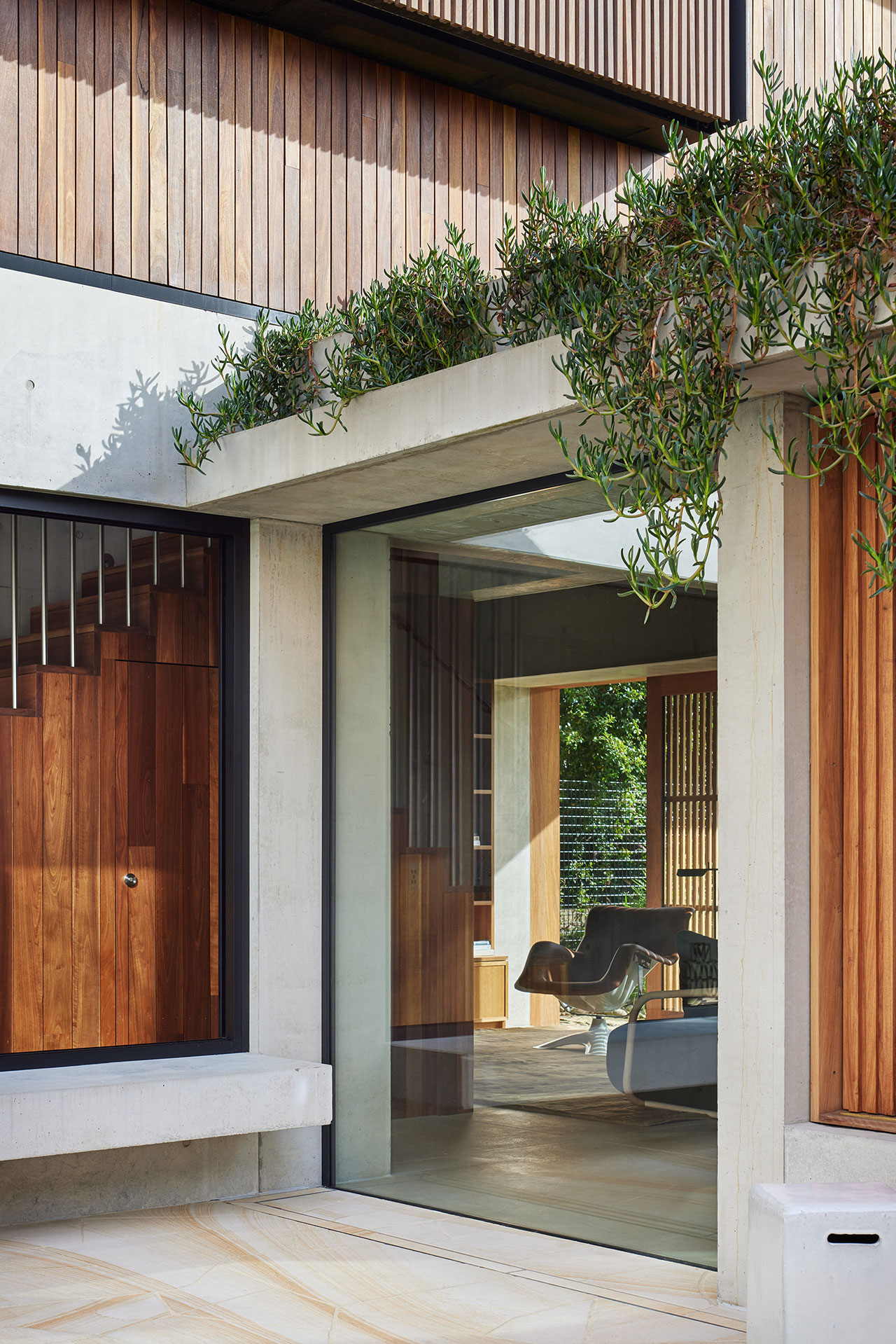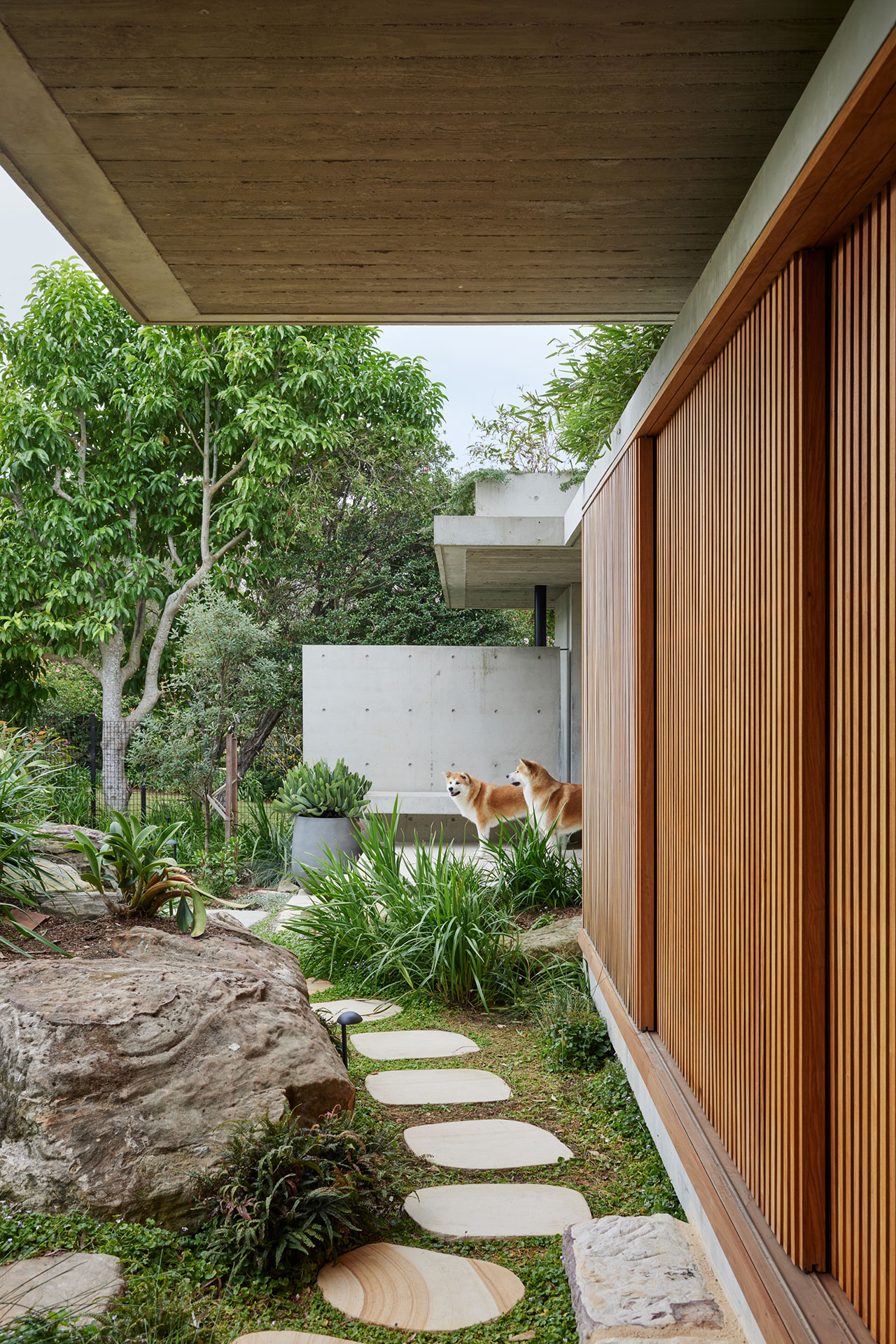 Set back from the street, the house is accessed through a winding path through a lush garden of indigenous plants selected to support local biodiversity. Ensconced amid the vegetation, a large concrete volume grounds the building amid the plot’s sandstone outcrops with an arrangement of smaller timber clad volumes perched on top, the former housing the expansive social areas, while the latter containing the more intimate private quarters.